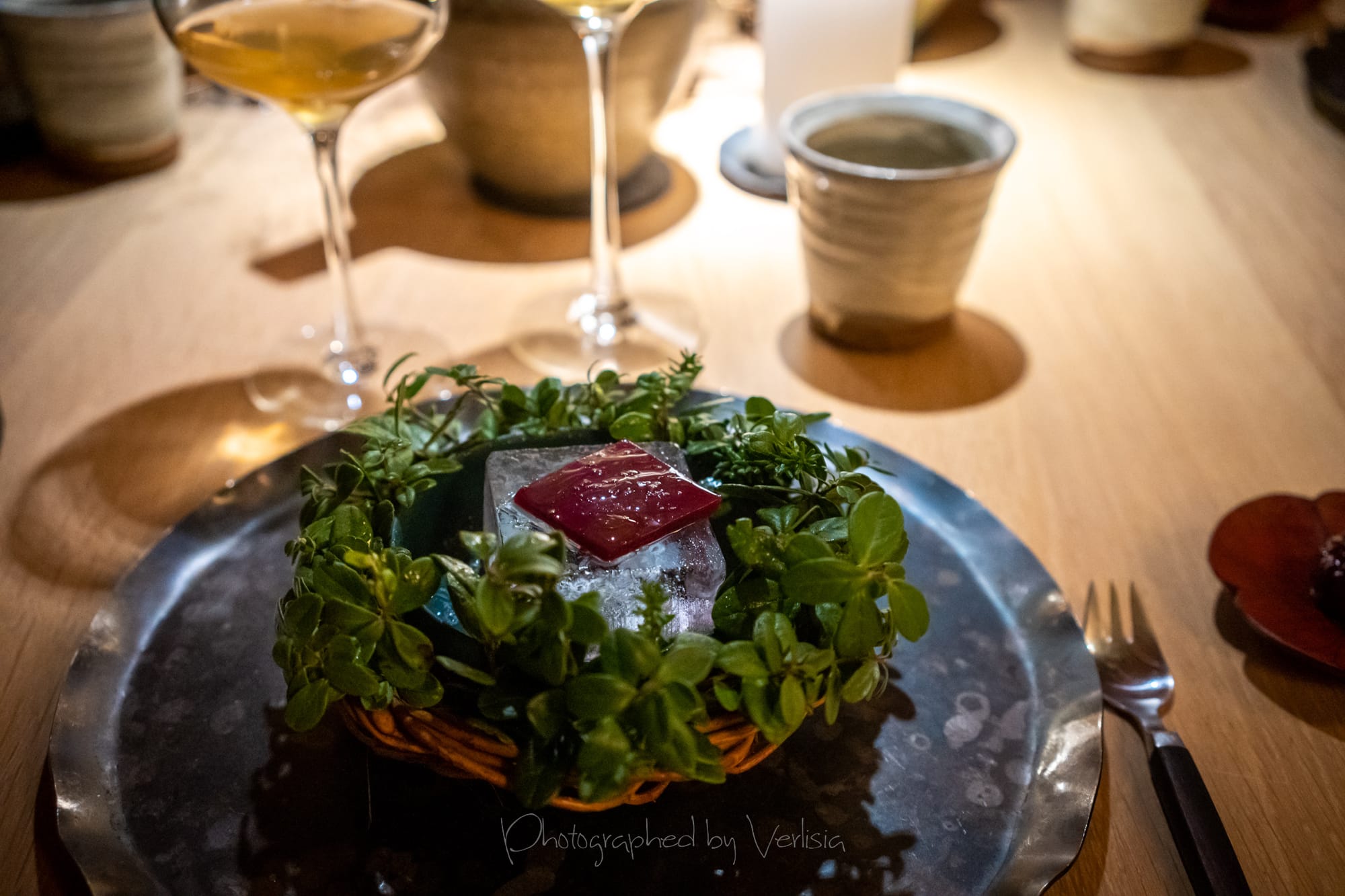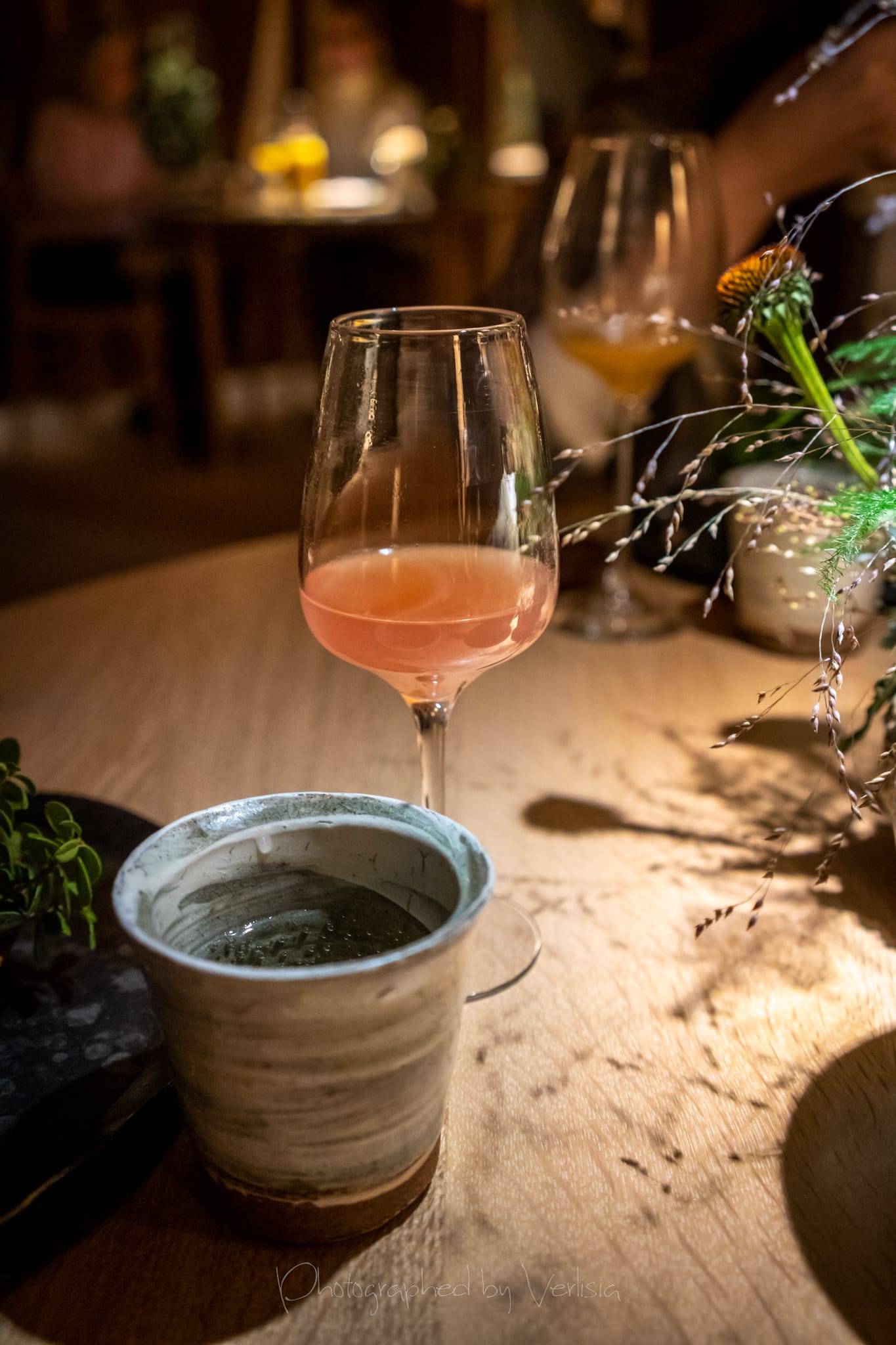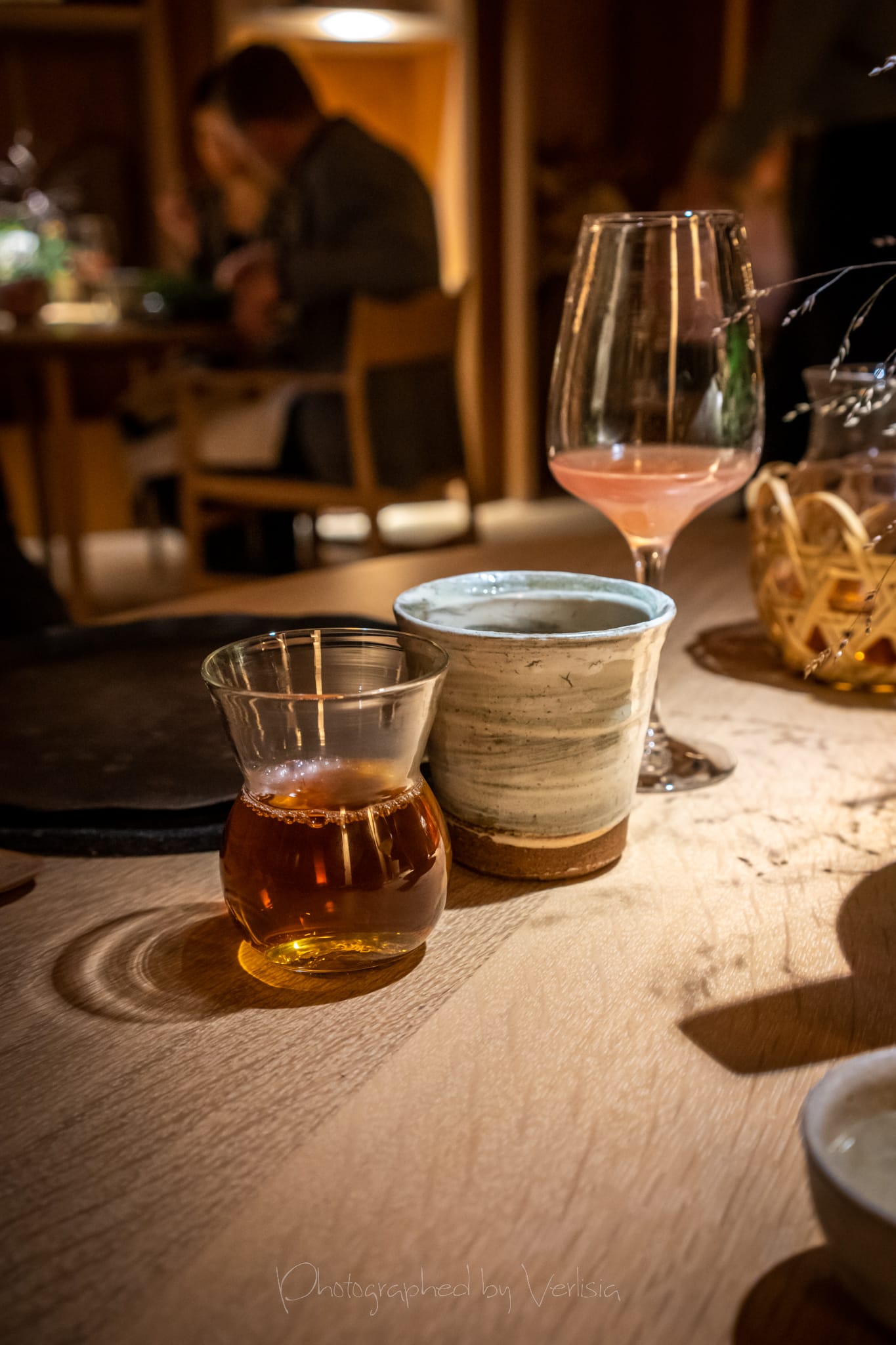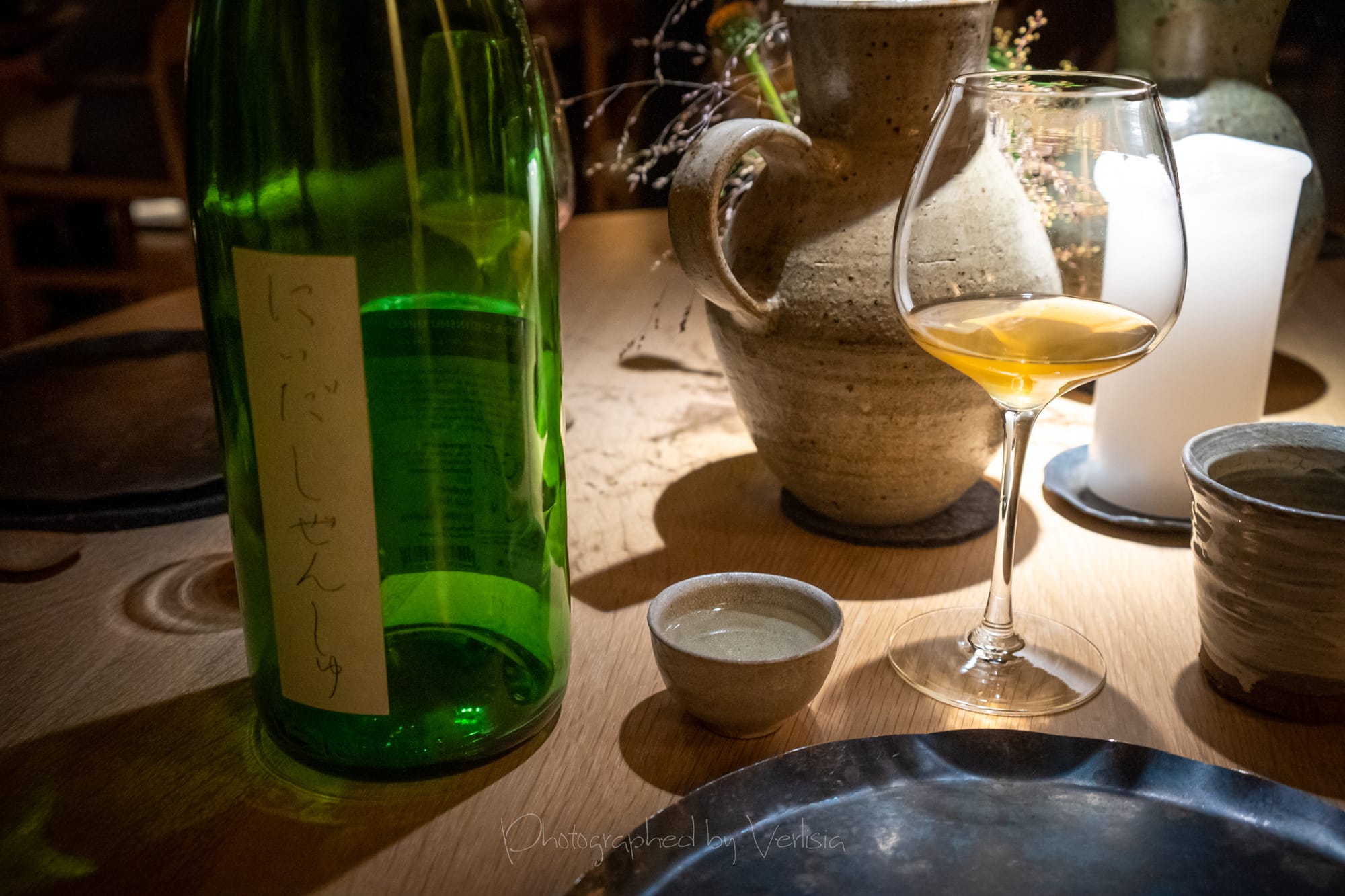 Wine Pairing - 2022 Niida Shizenshu Junmai Ginjo - Yasuhiko Niida, Koriyama, Fukushima, Japan (served warm). Juice Pairing - Tea stem & fig leaf