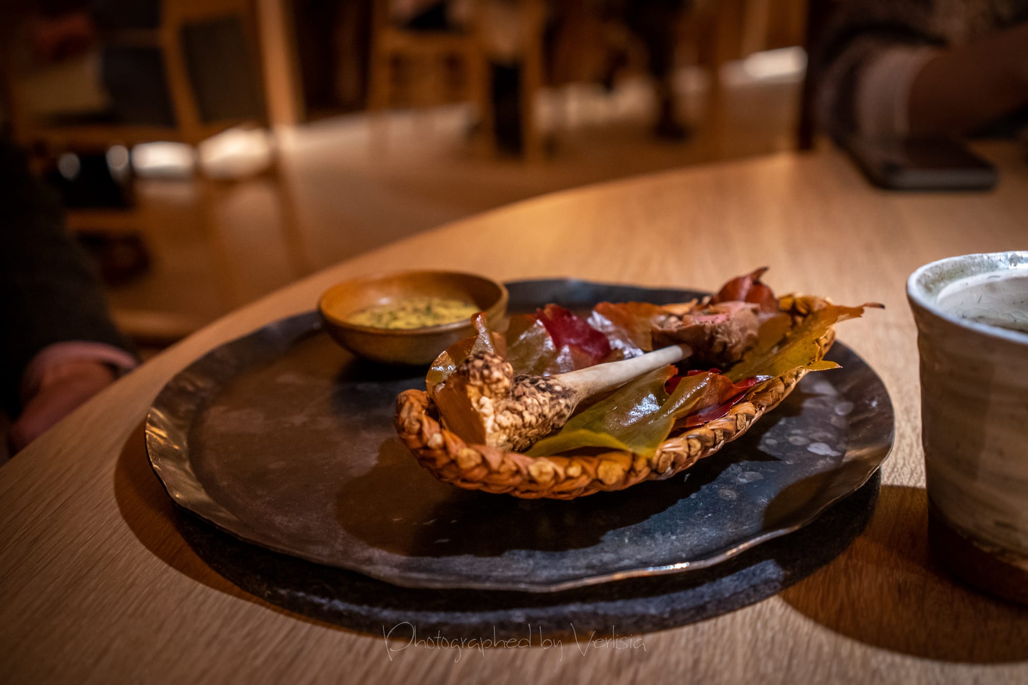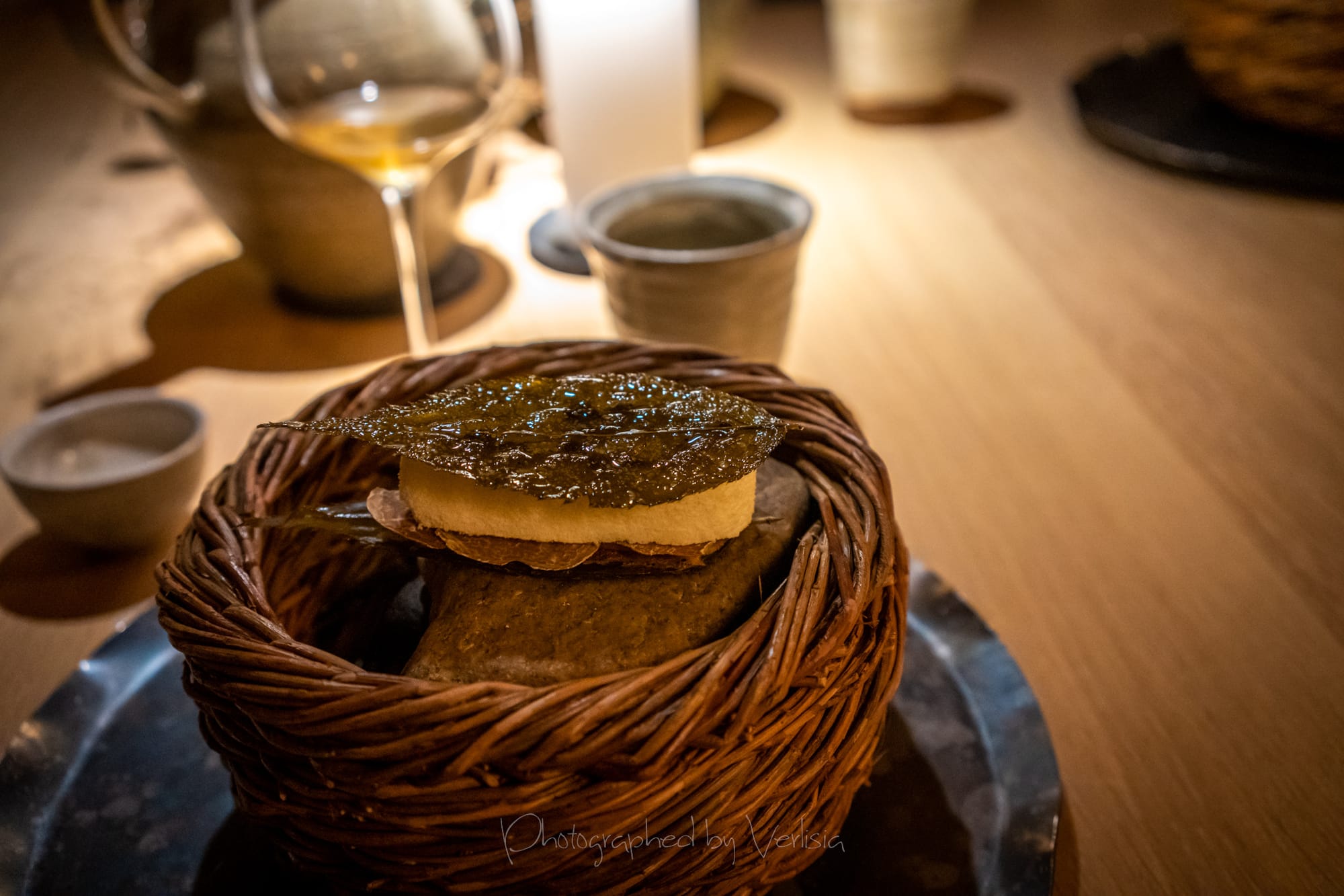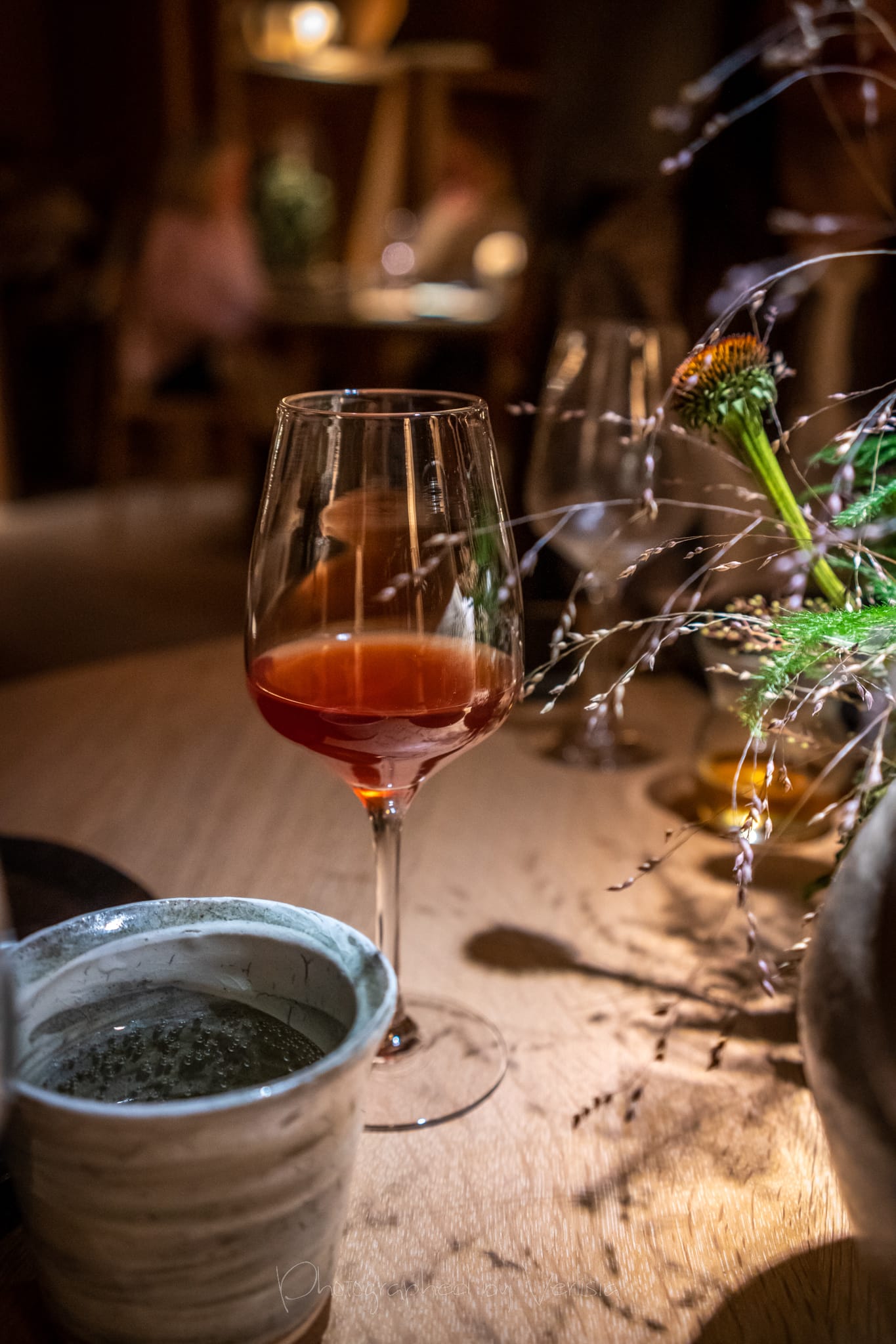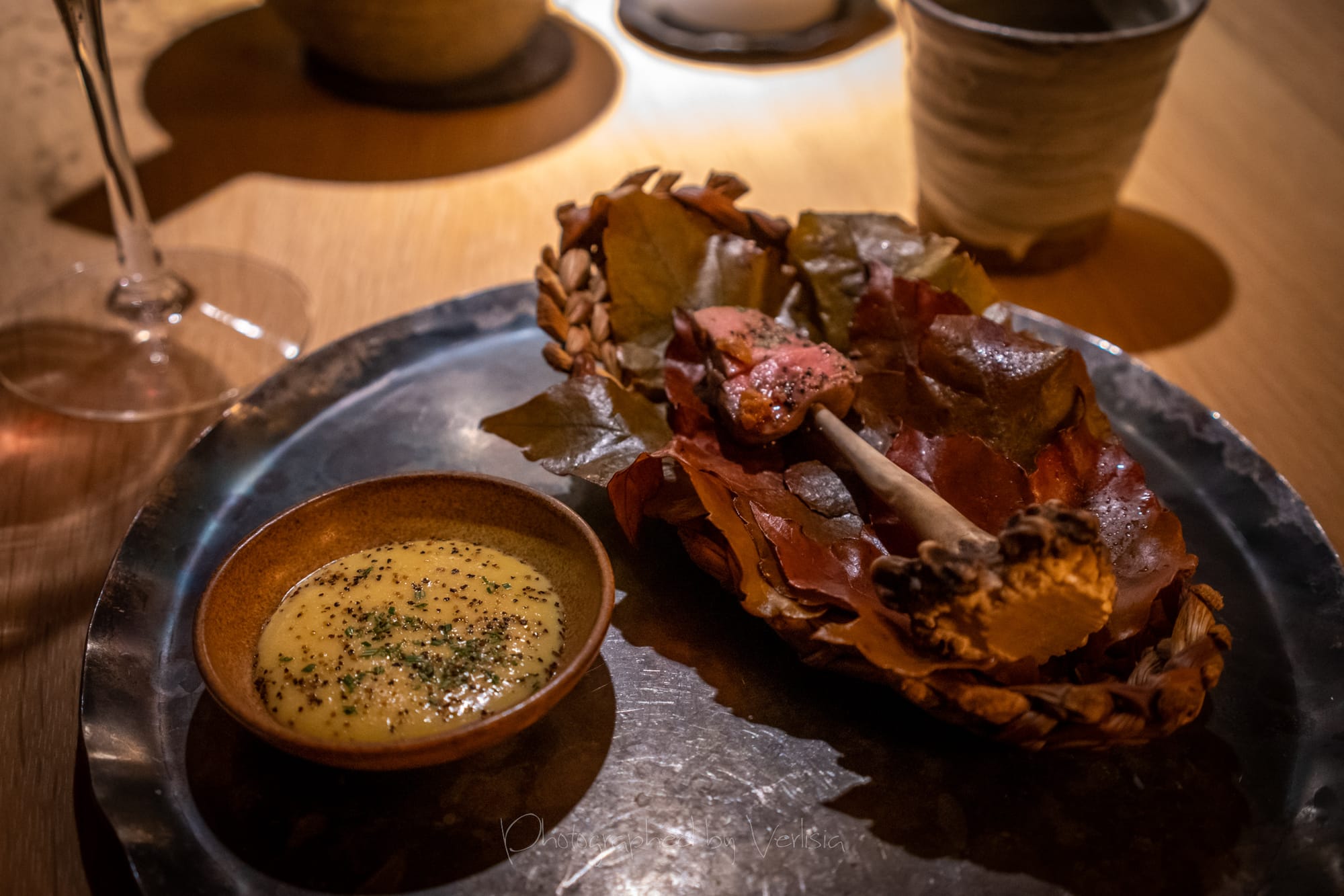 Wine Pairing - 2022 Niida Shizenshu Junmai Ginjo - Yasuhiko Niida, Koriyama, Fukushima, Japan (served warm). Juice Pairing - Tea stem & fig leaf