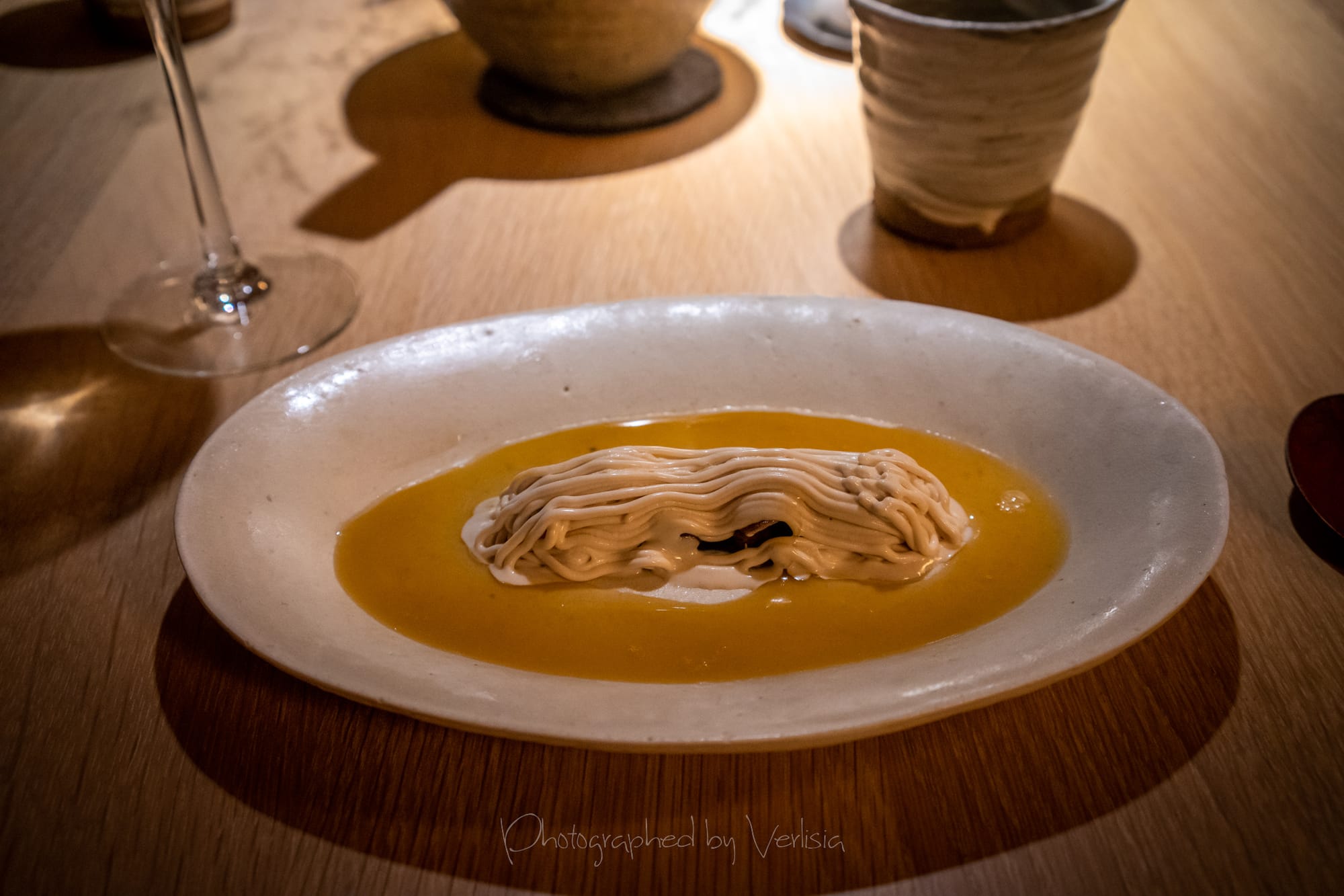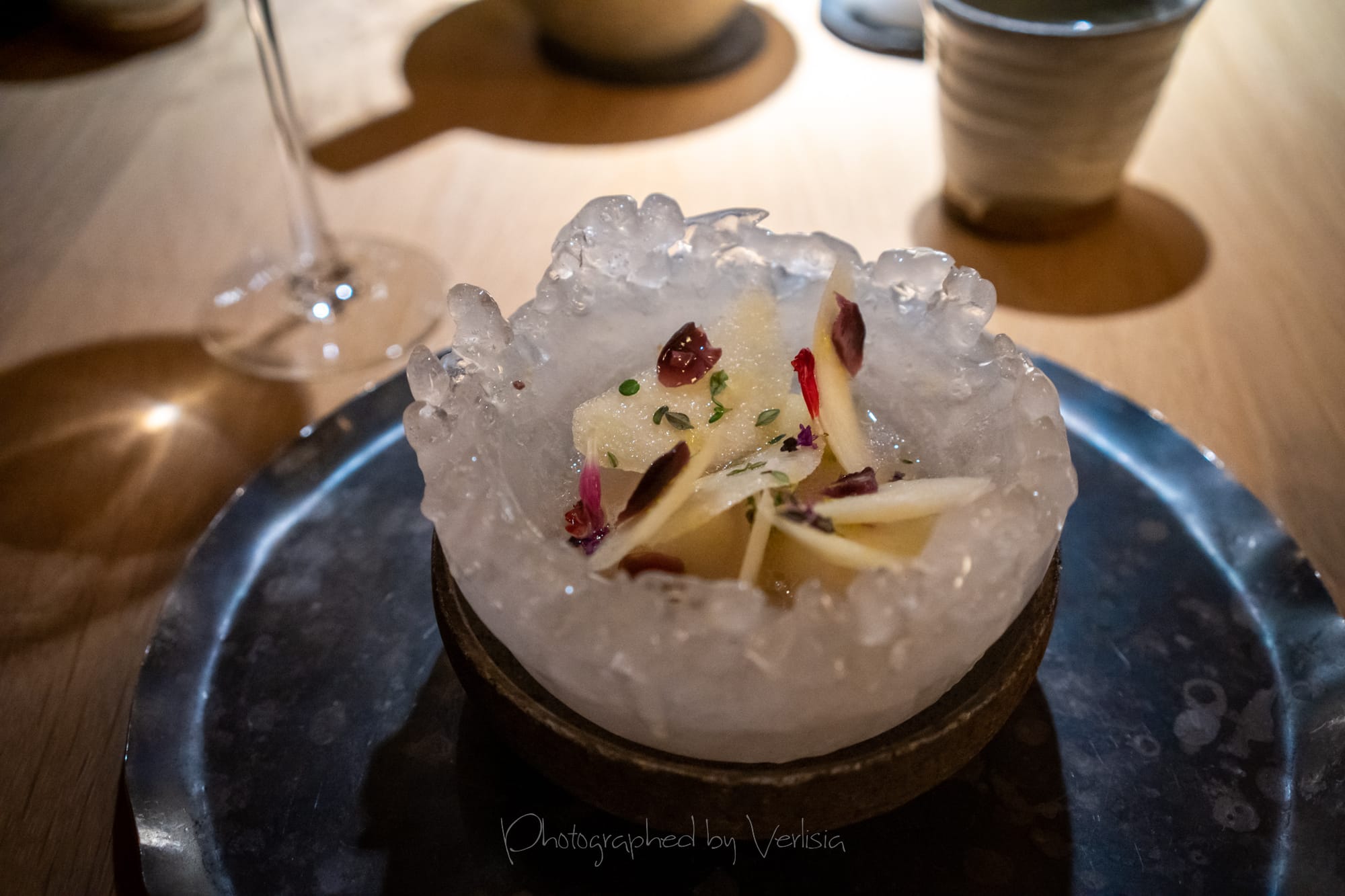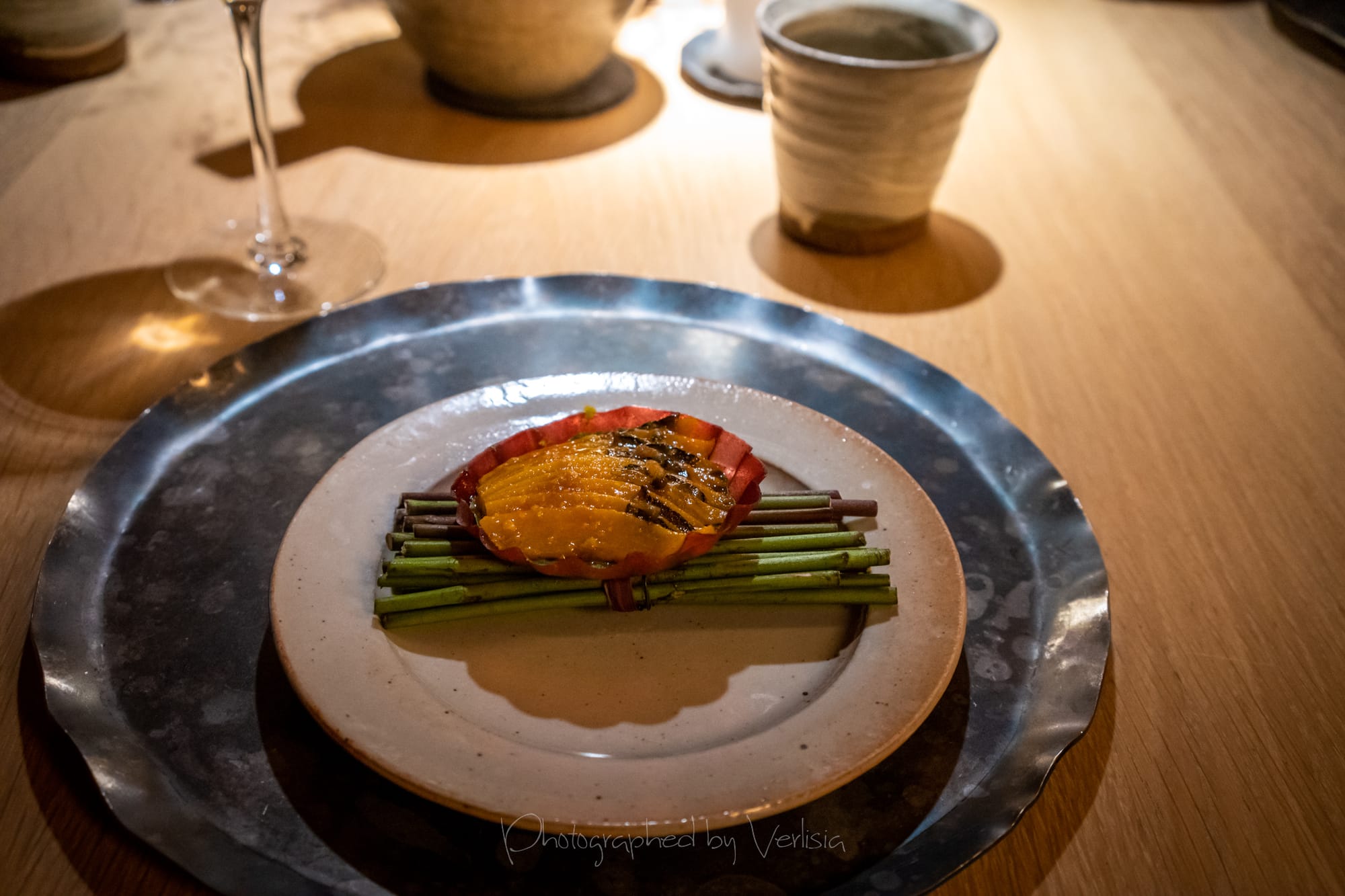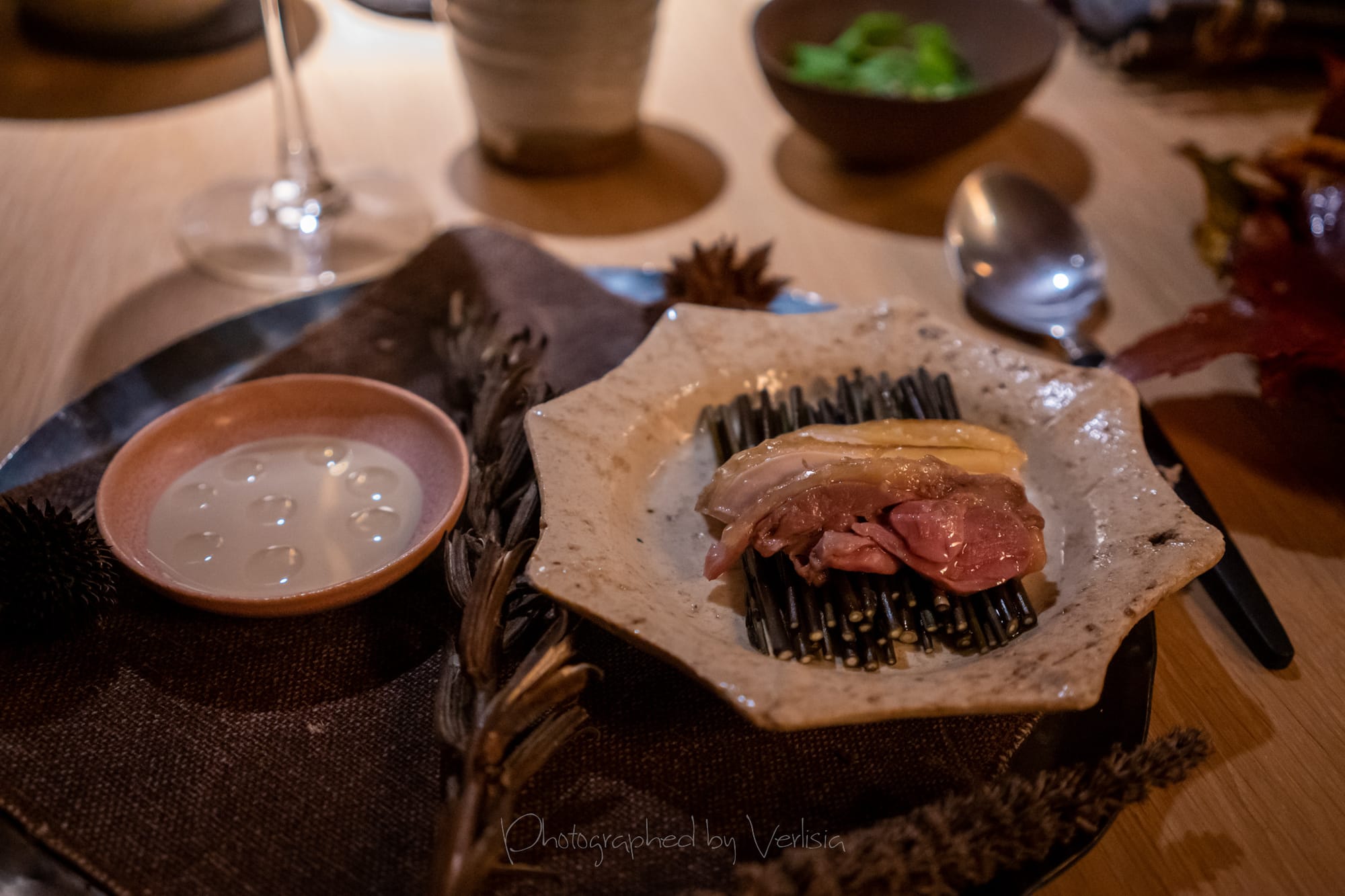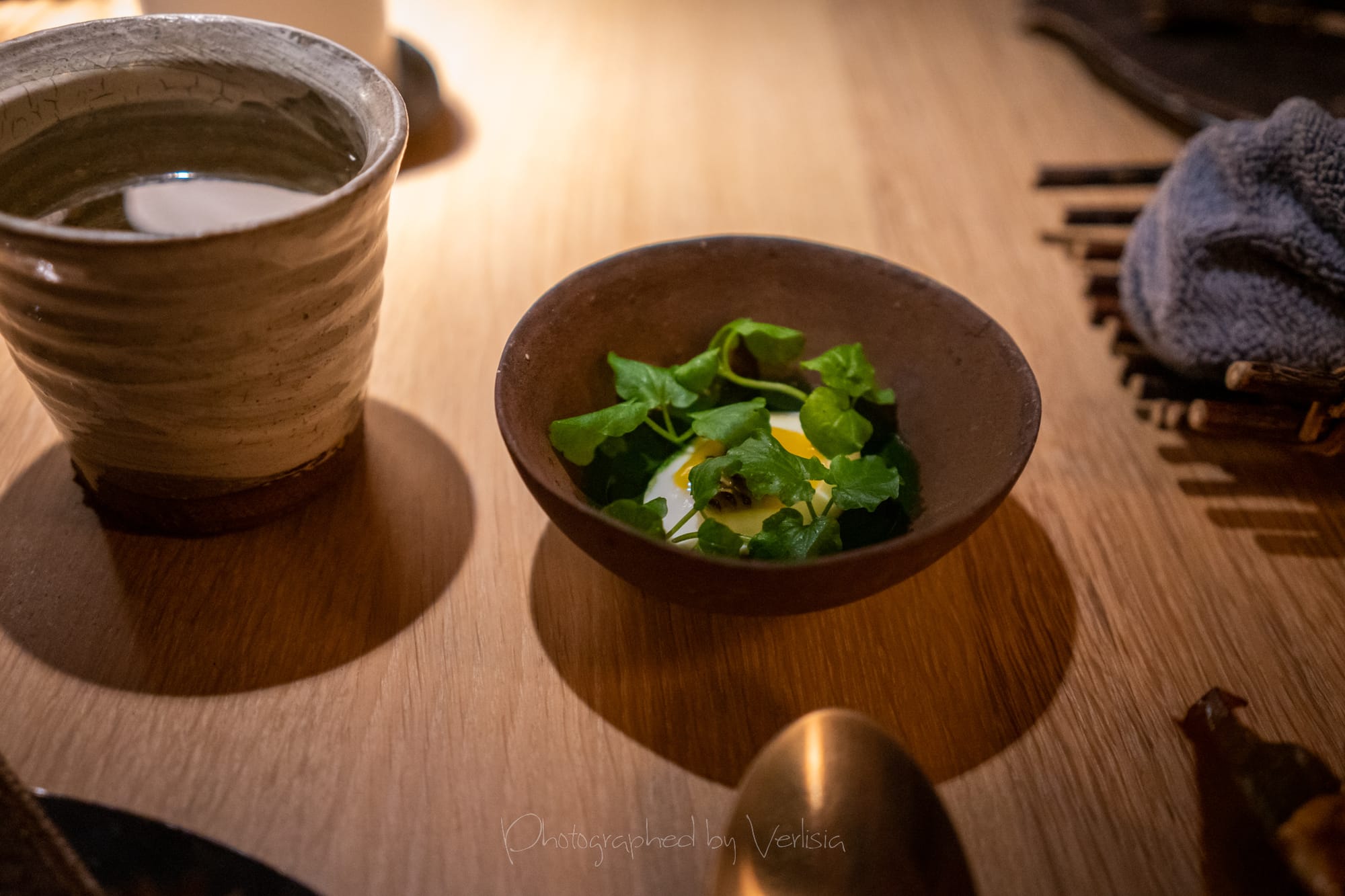 Wine Pairing - 2022 Niida Shizenshu Junmai Ginjo - Yasuhiko Niida, Koriyama, Fukushima, Japan (served warm). Juice Pairing - Tea stem & fig leaf