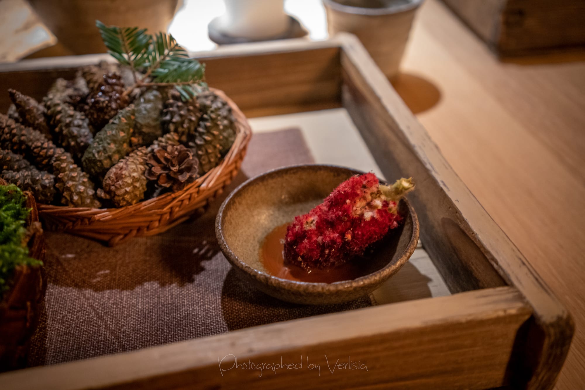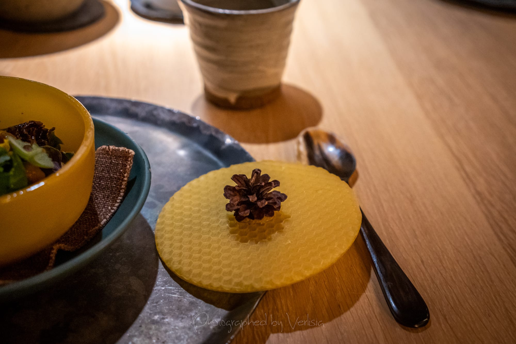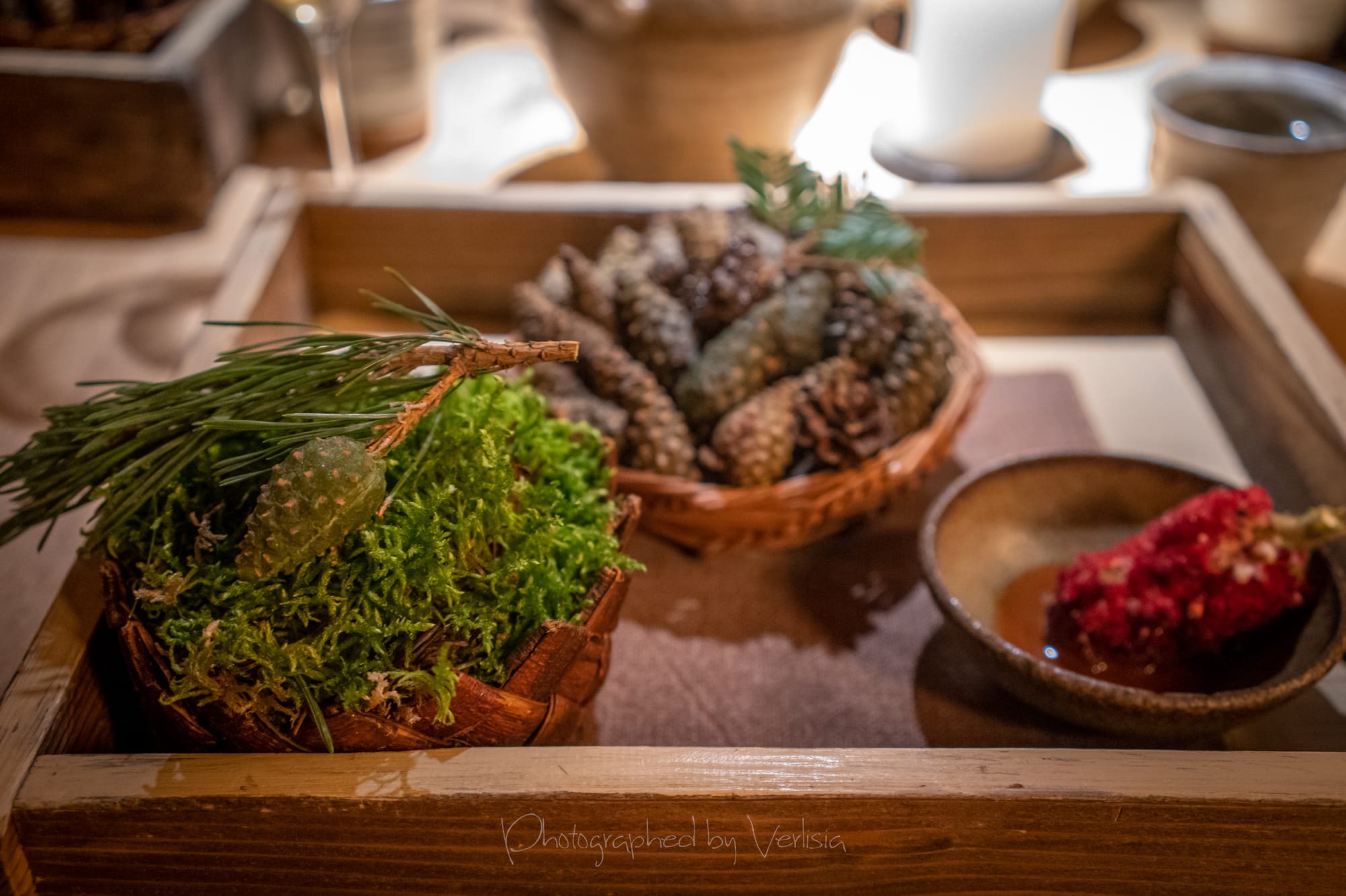 Woodruff and pine caramel. Sumac in chocolate. Candied pinecone