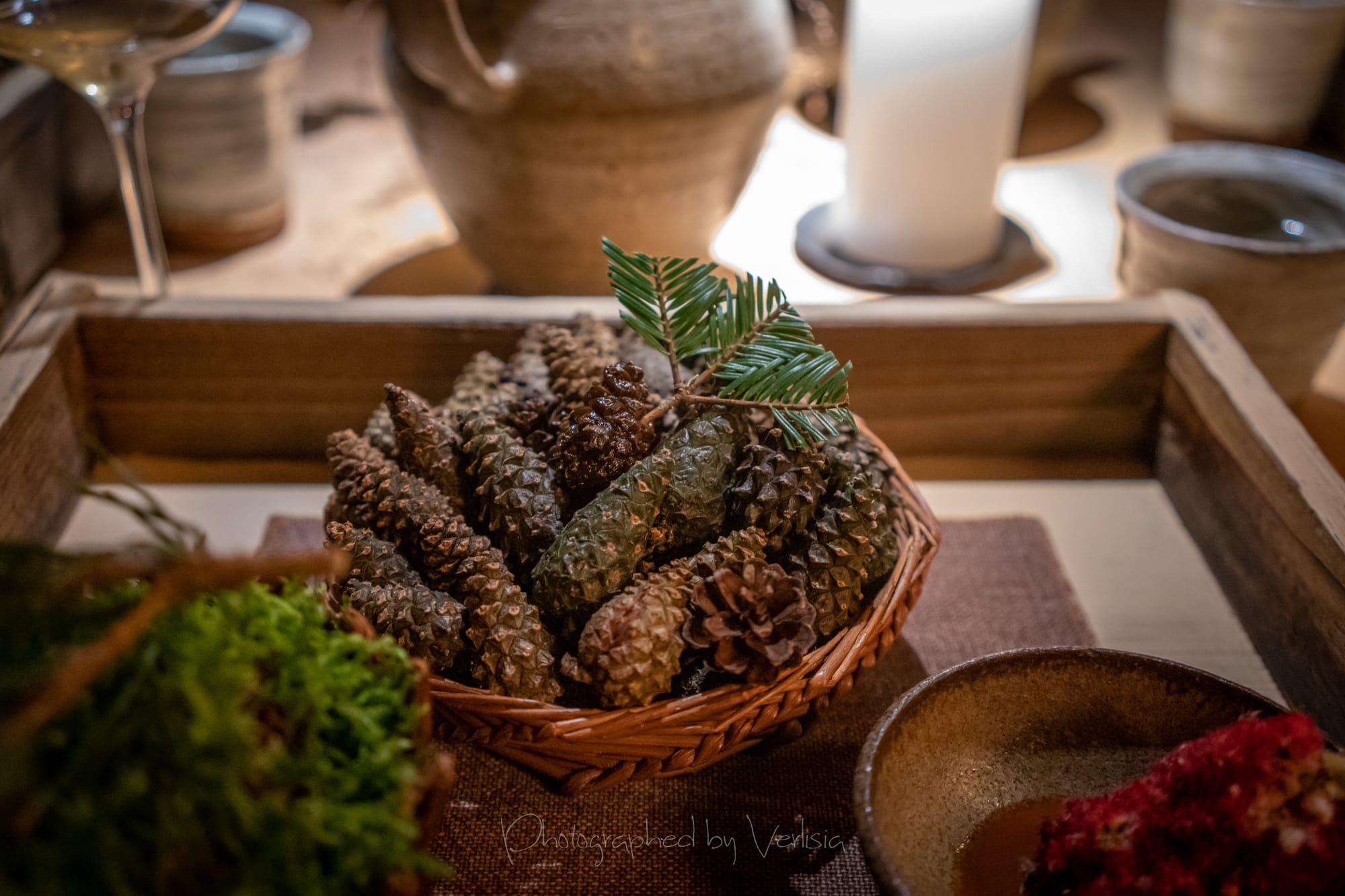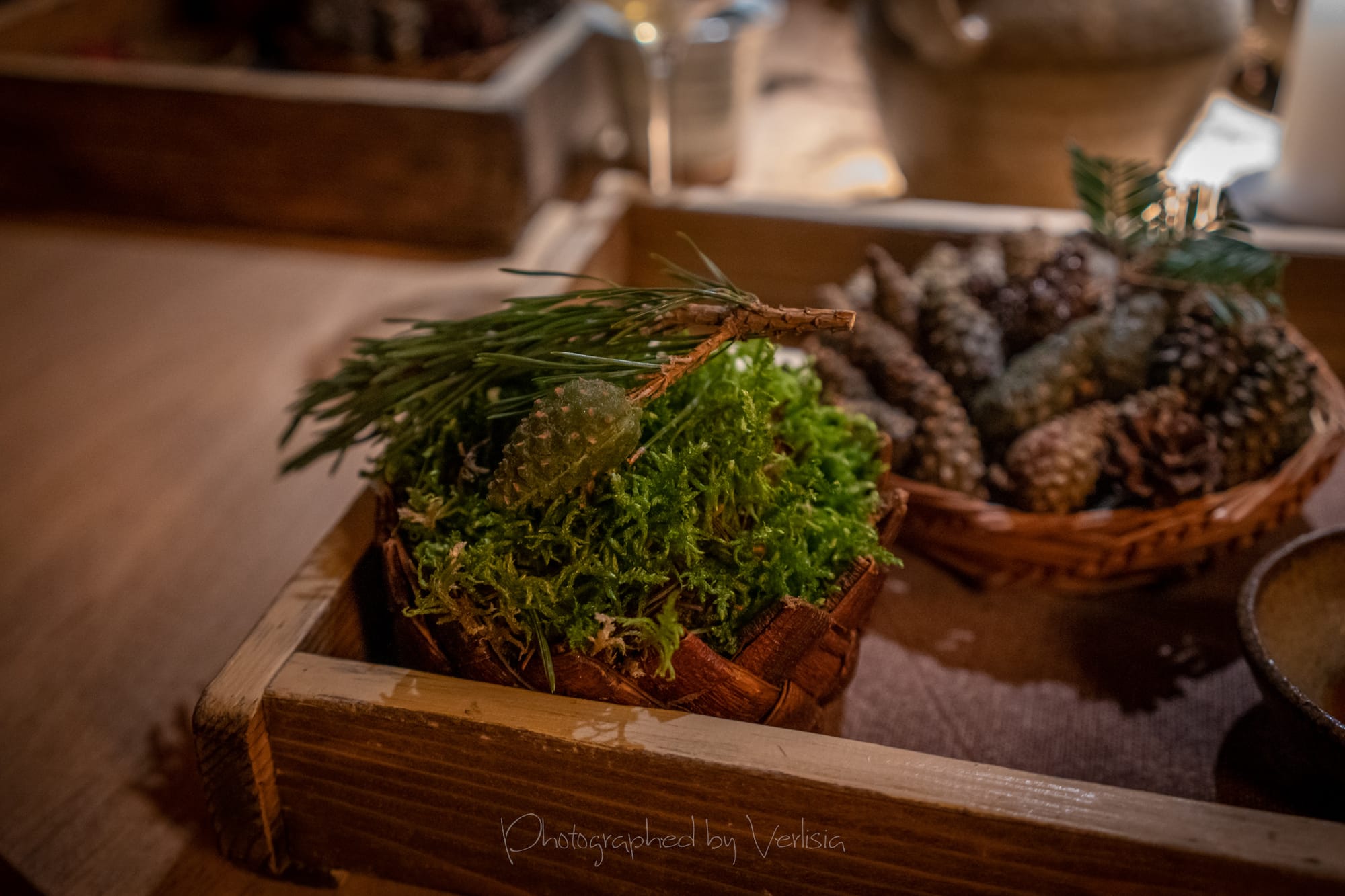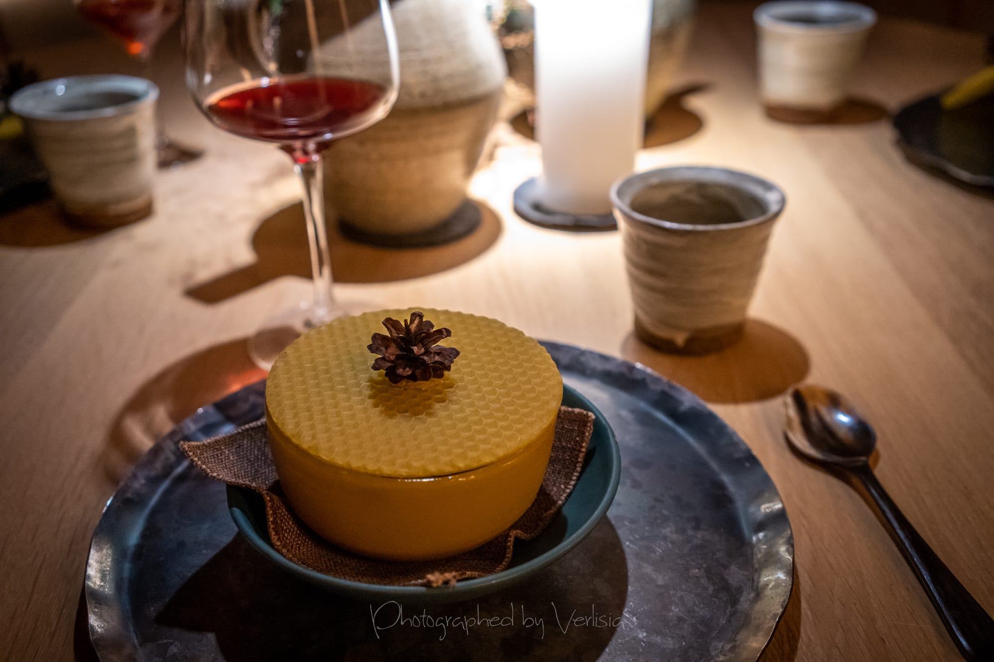 Woodruff and pine caramel. Sumac in chocolate. Candied pinecone