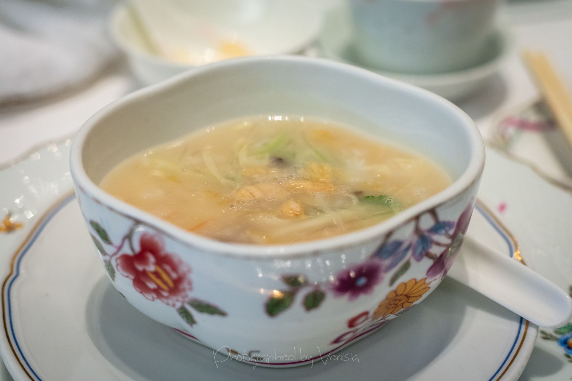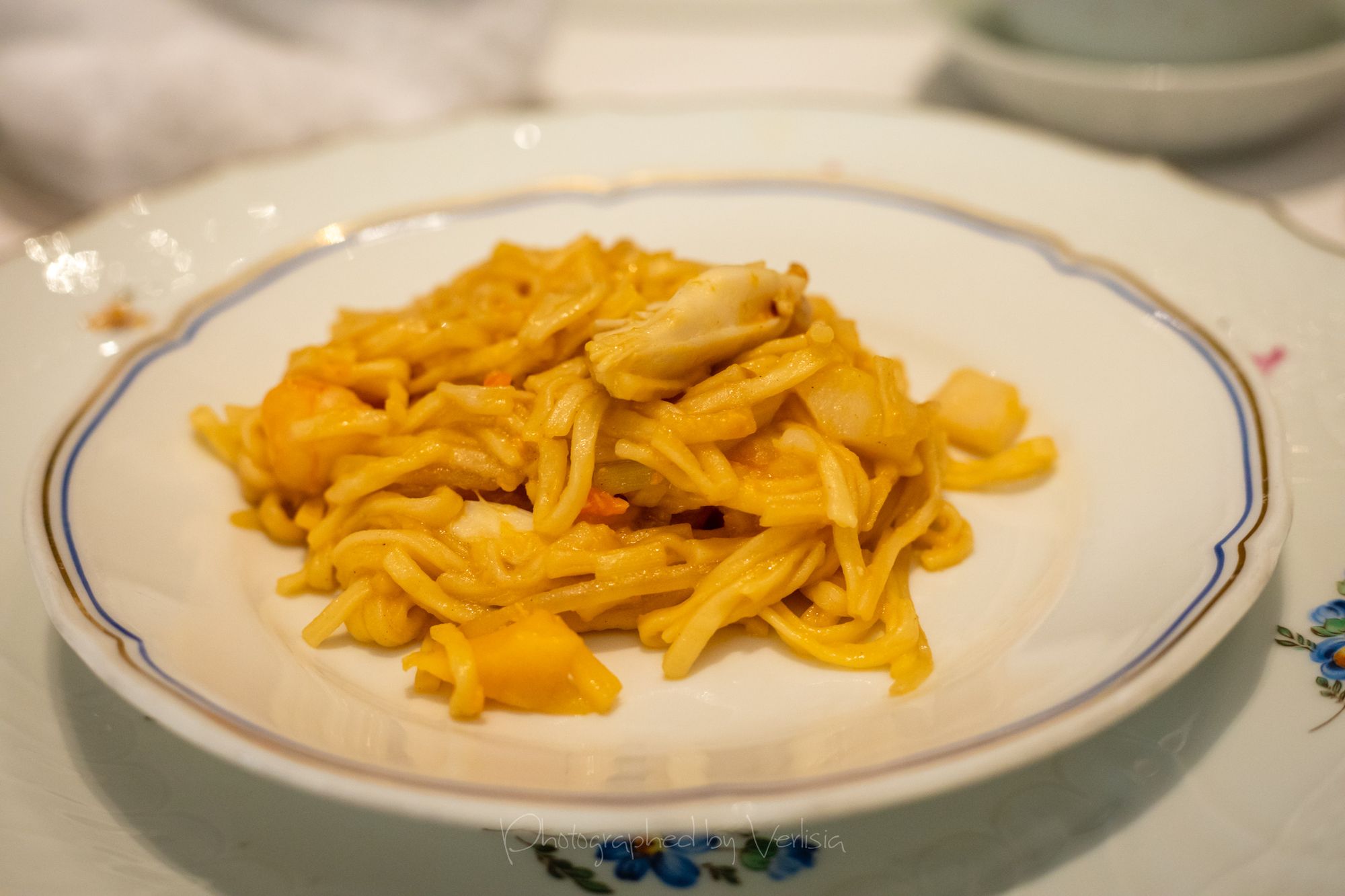 Fish and asserted vegetable soup, Braised seafood egg noodles with crab roe and lobster broth