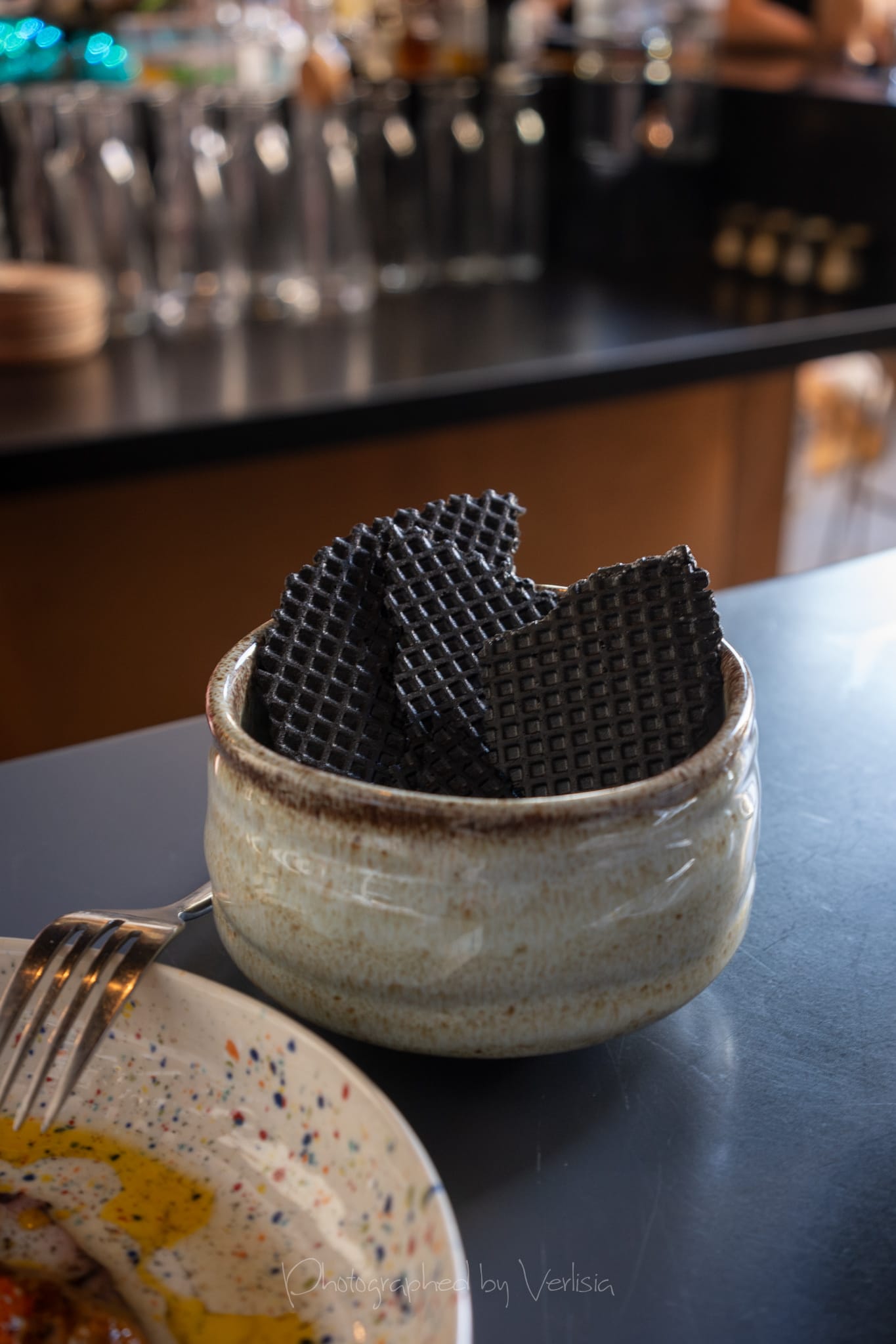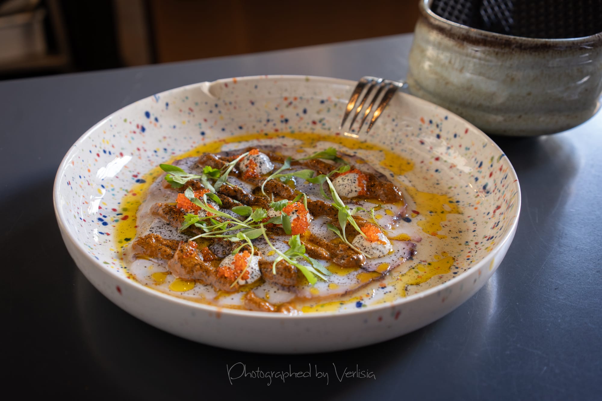 Pulpo Carpaccio (octopus, squid ink tuile, roasted red pepper vinaigrette, labneh dip, flying fish roe)