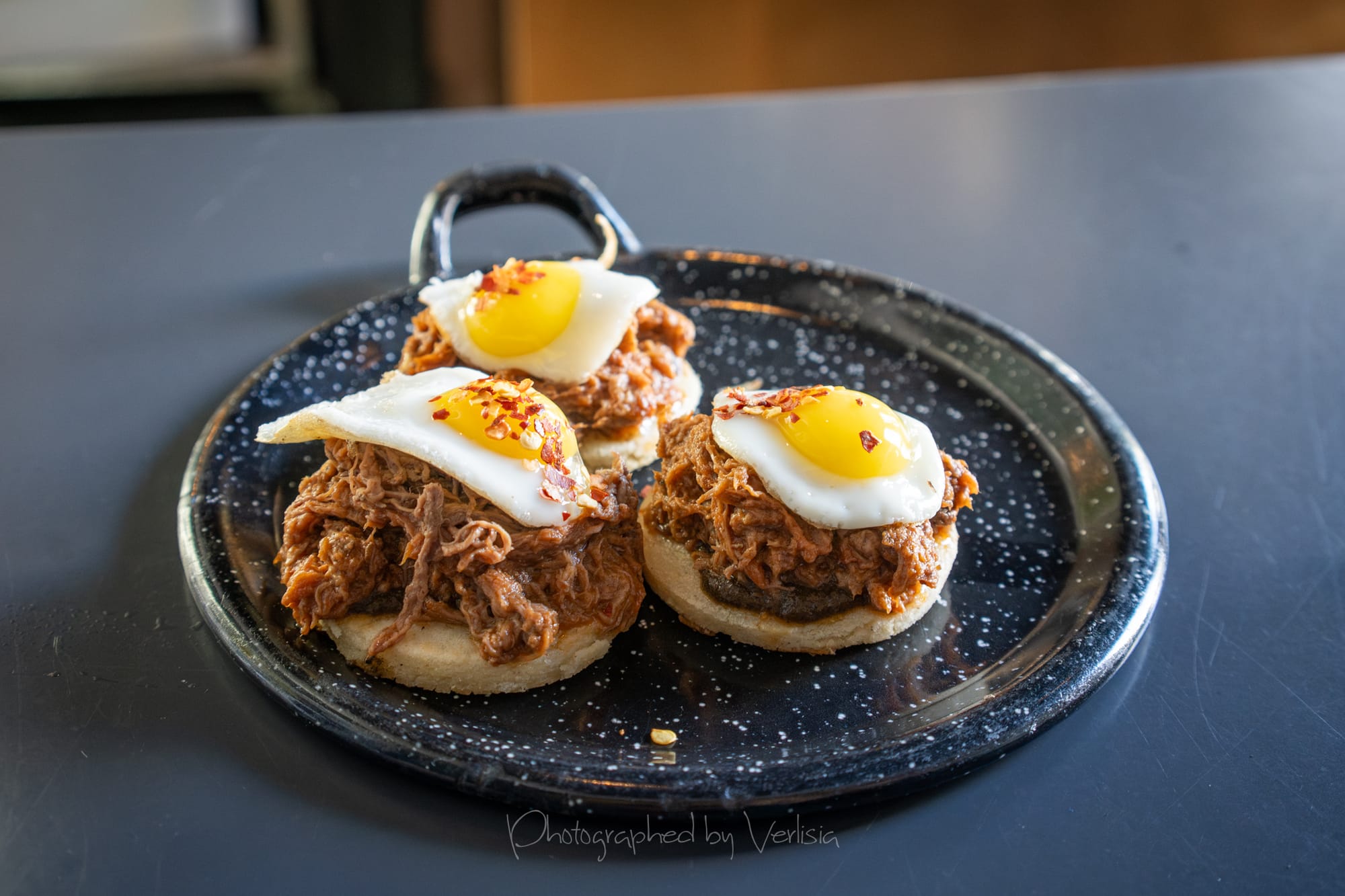Arepa Paisa (slow n' low shredded beef, criolla sauce, fried quail egg), Trucha a la Plancha (whole McFarland trout wrapped in plantain leaf with achiote & citrus, patacones)