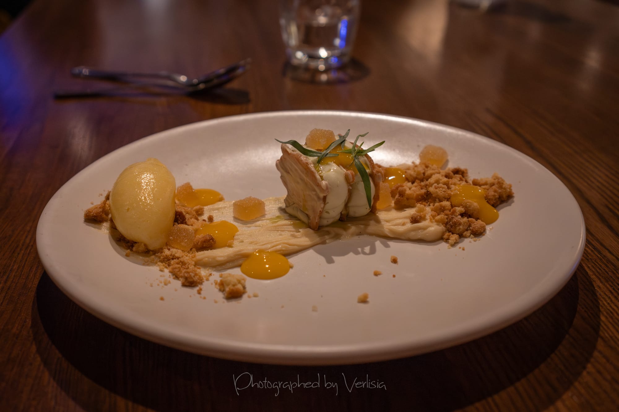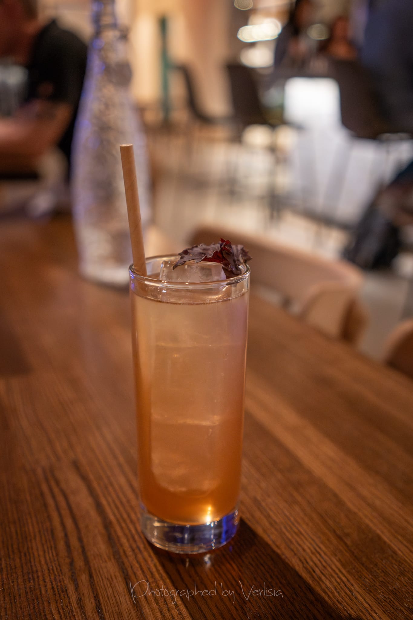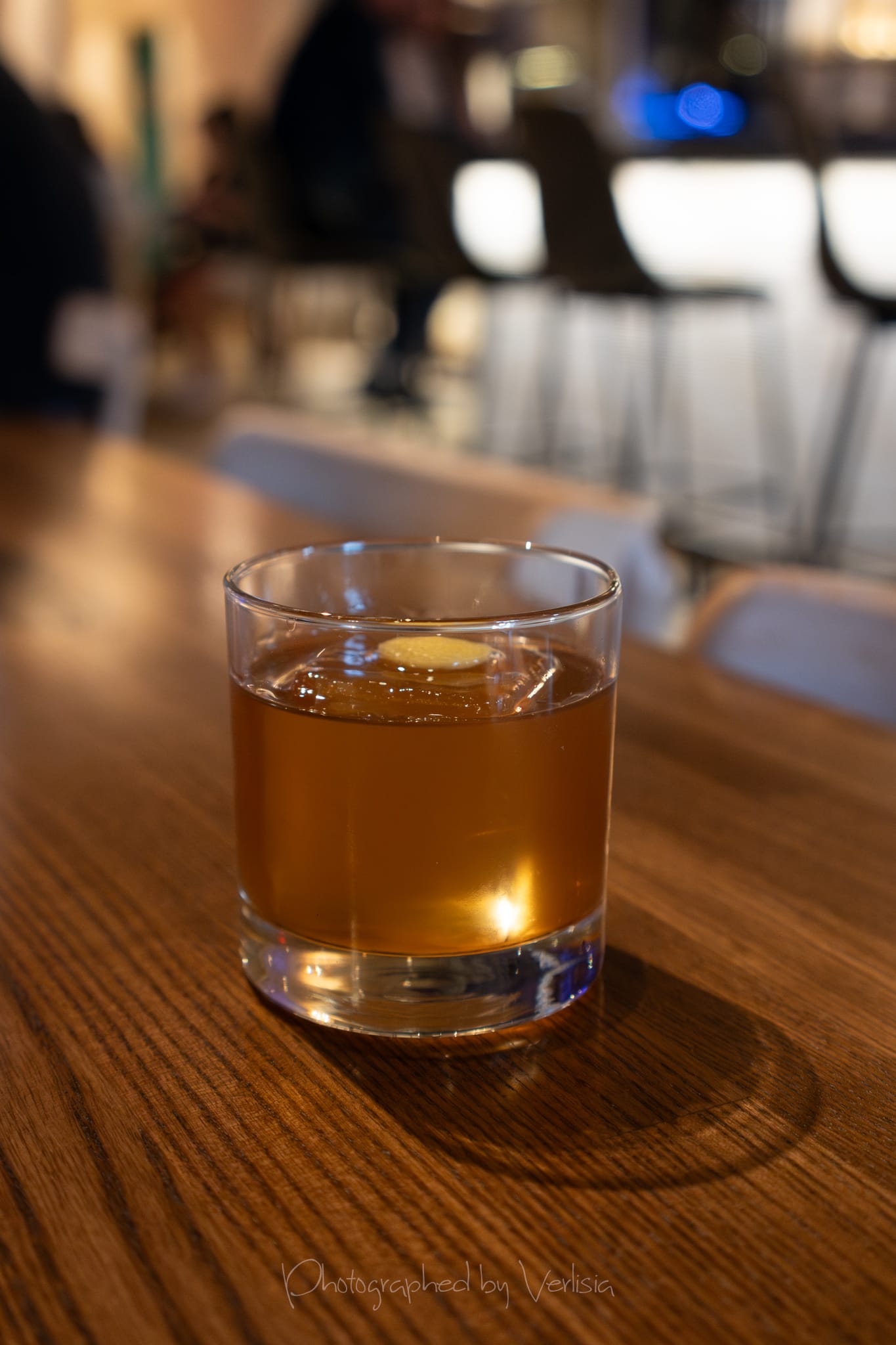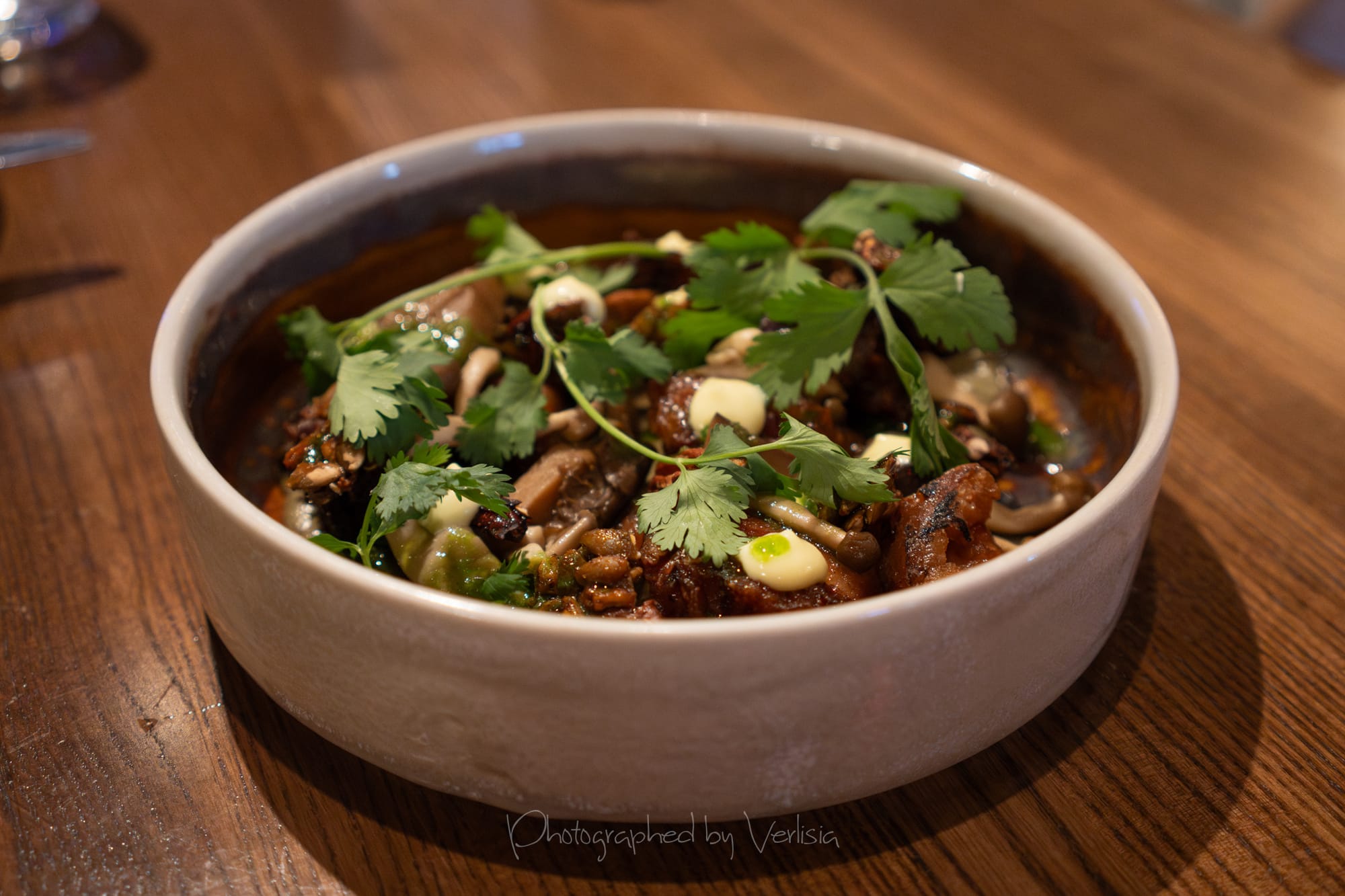 Cocktail - Broken Flowers (chamomile infused rye, spiced citrus honey, orange & aromatic bitters), Cocktail - Chilly Villain (N/A aperitif, grapefruit soda, lemon, rose water), Tea Braised Pig Tails (burnt mushroom, pickled maitake mushroom, ham dashi braised shiitake, herbs, seeded crunch)