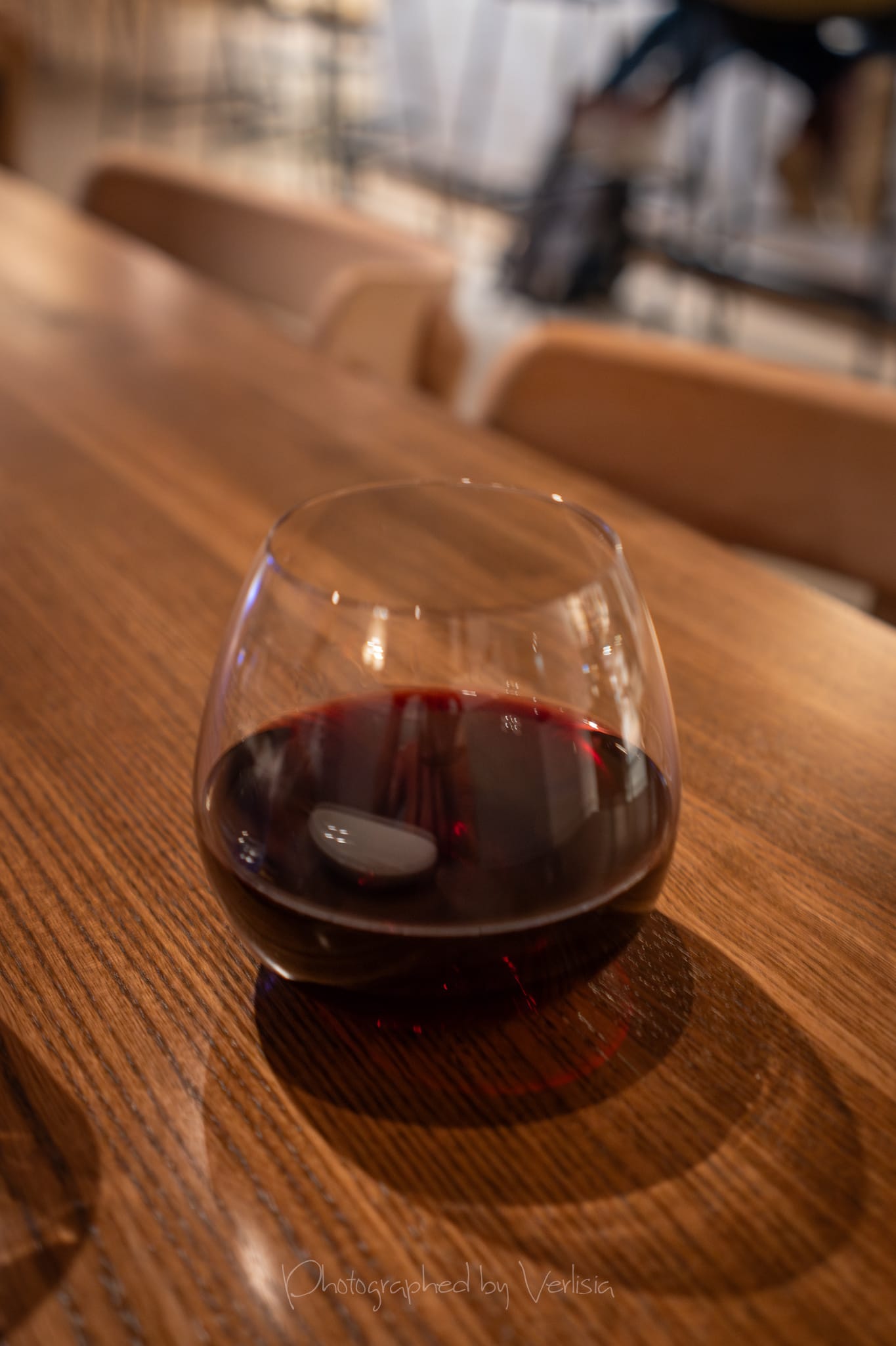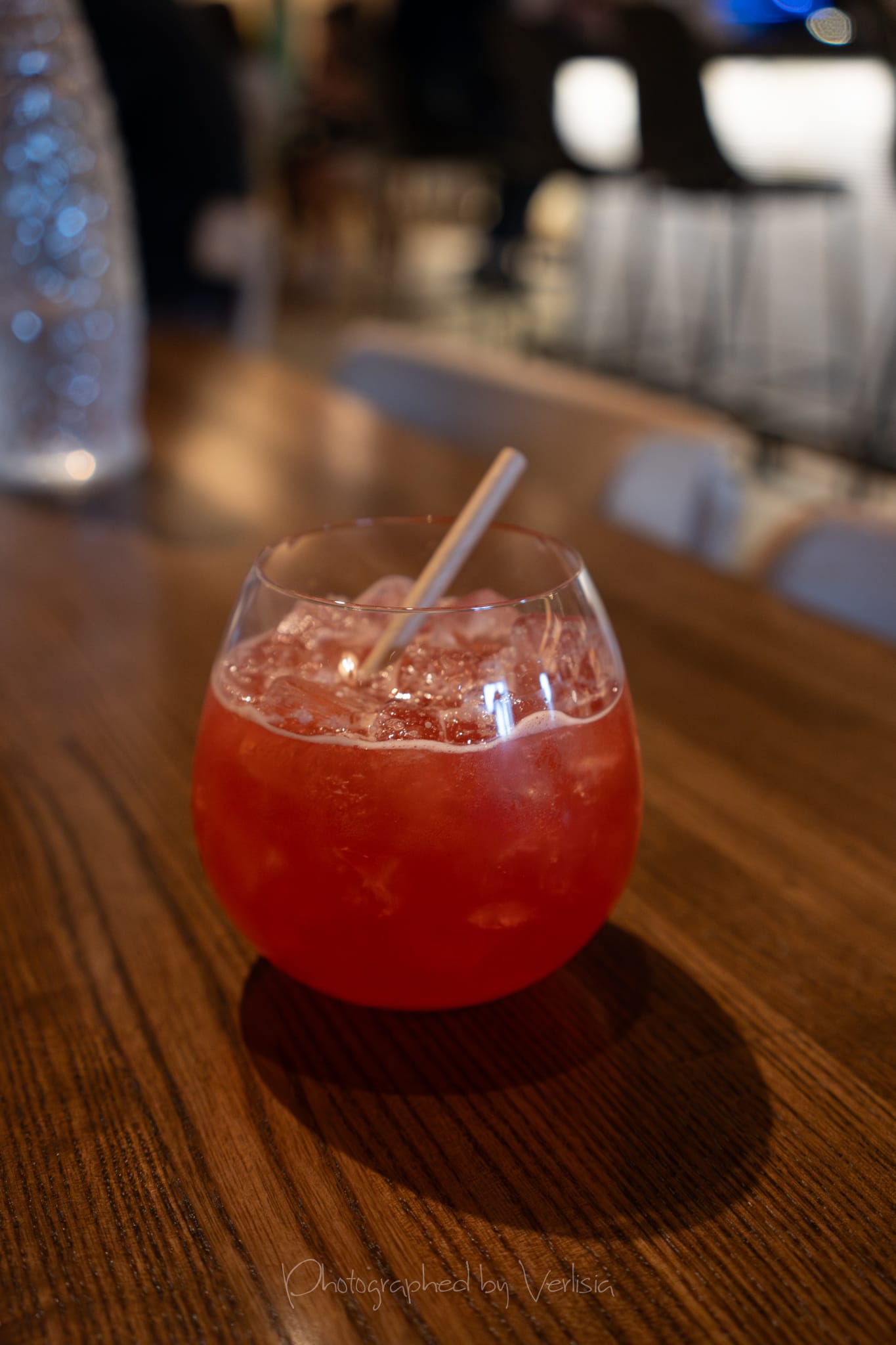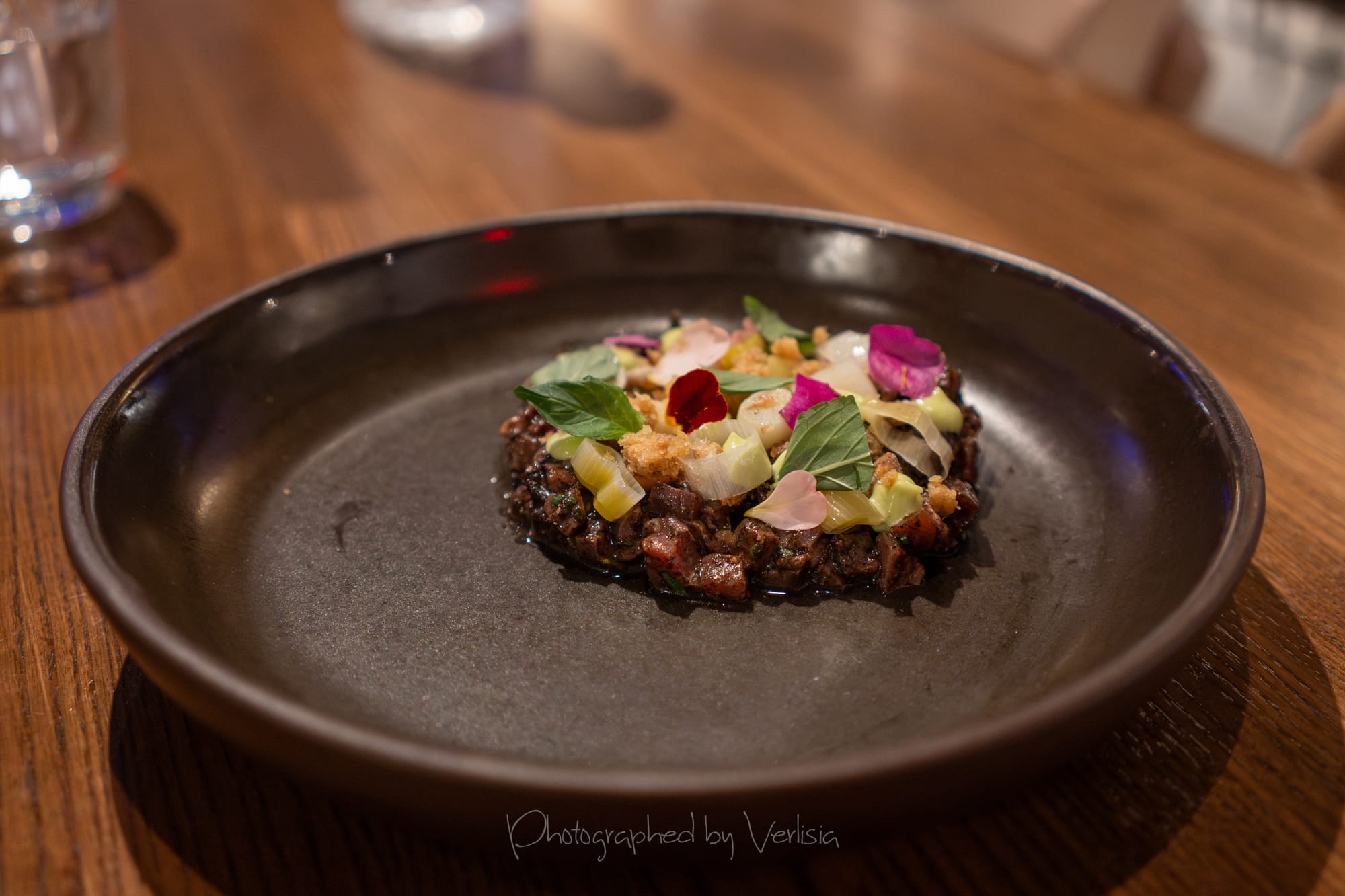 Green Peppercorn Cured and Lightly Smoked Duck Crudo (green garlic, herbs, lemon oil confit green garlic, crispy duck skin), Wine (Chateau Bel-Air Eiffel: Graves de Vayres Bourdeaux FR 2020), Cocktail - Shi-Shore (shochu, yuzu liqueur, red shiso, yaupon syrup, sparkling hop water)