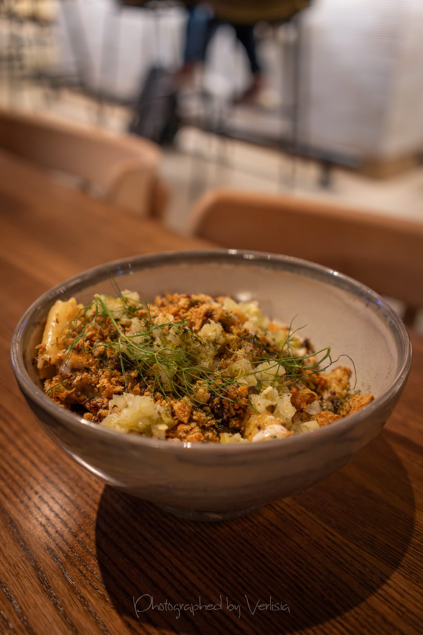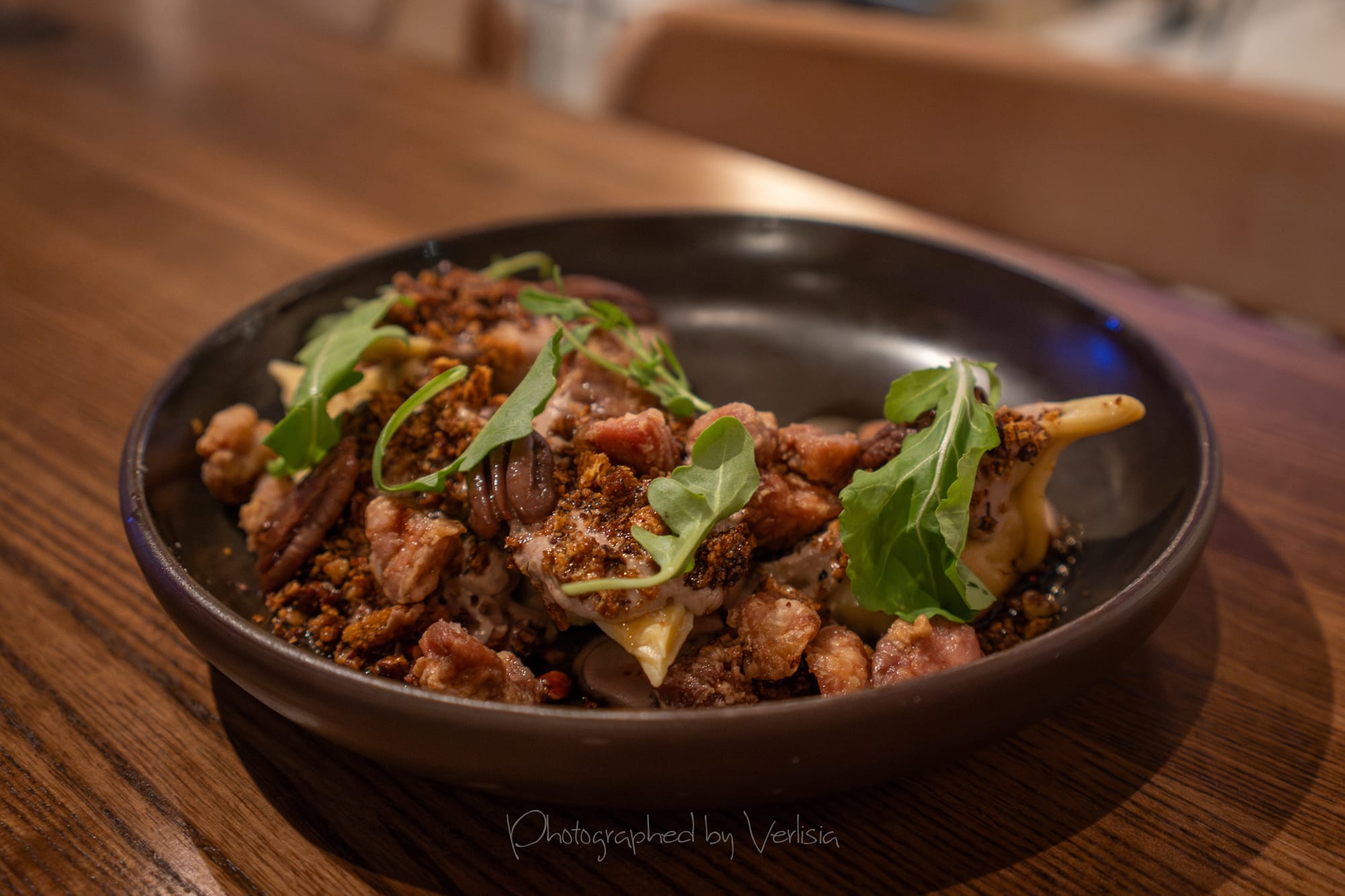 Whole TX Lamb Lasagnette (fennel and apple braised ragout, fennel, koji buttermilk emulsion, smoked lambs tongue focaccia crunch), Smoked Sweetbread and Chevre Cappelletti (buttered pecan, comeback creek arugula, black butter, sherry pecans)