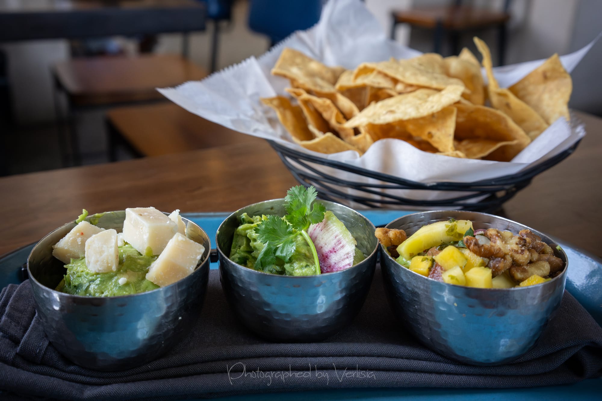 Guacamole Sampler - Puesto Perfect (classic guacamole & Parmigiano-Reggiano), Classic Guacamole (avocado, cilantro, fresh squeezed lime and orange), Nogada (classic guacamole & pomegranate, mango pico, candied walnuts); Pineapple Agua Frescas