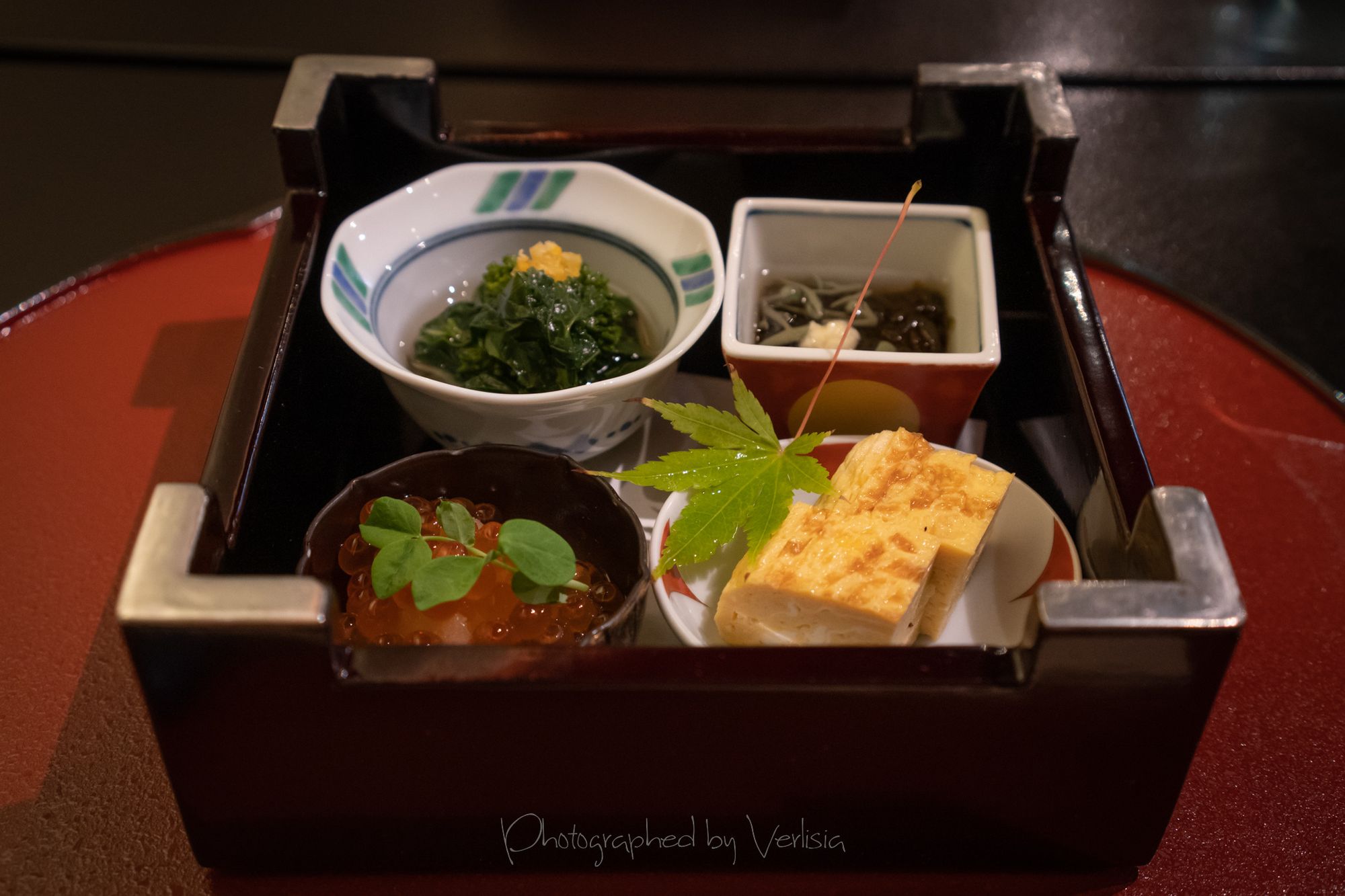 Sakizuke (Starter) - House made Tofu, Zensai (Appetizers) - Marinated Ikura, Tamago, Green Vegetables steeped in Broth, Mozuku VinaigretteOtsukuri (Sashimi Dish) - Shima Aji, Nimono (Simmered Dish) - Simmered Anago with VegetablesYakimono (Grilled Dish) - Miso Marinated Sawara, Mushimono (Steamed Dish) - Soymilk Chawanmushi with Japanese UniSunomono (Vinaigrette Dish) - Cutlass Fish with Grated Daikon Vinaigrette, Gohan (Rice Dish) - Steamed Rice with Baby Fishes