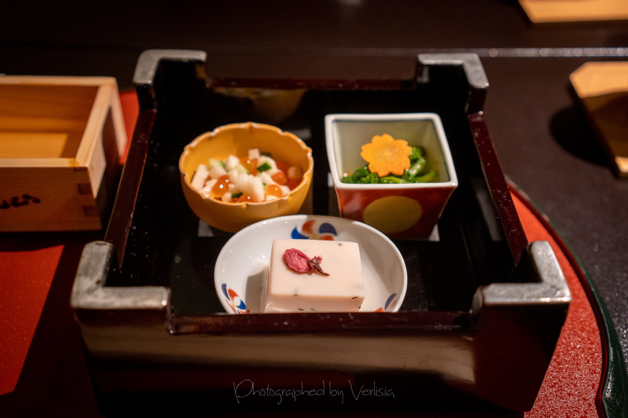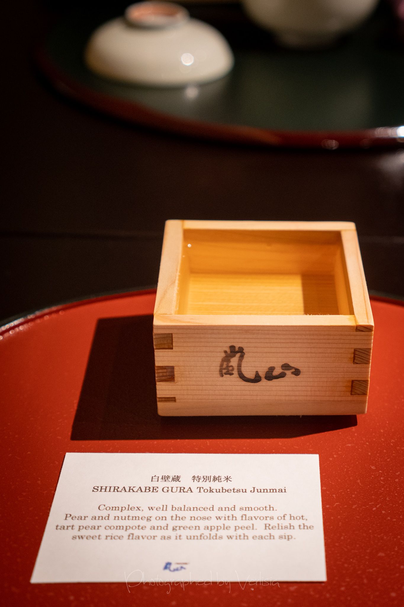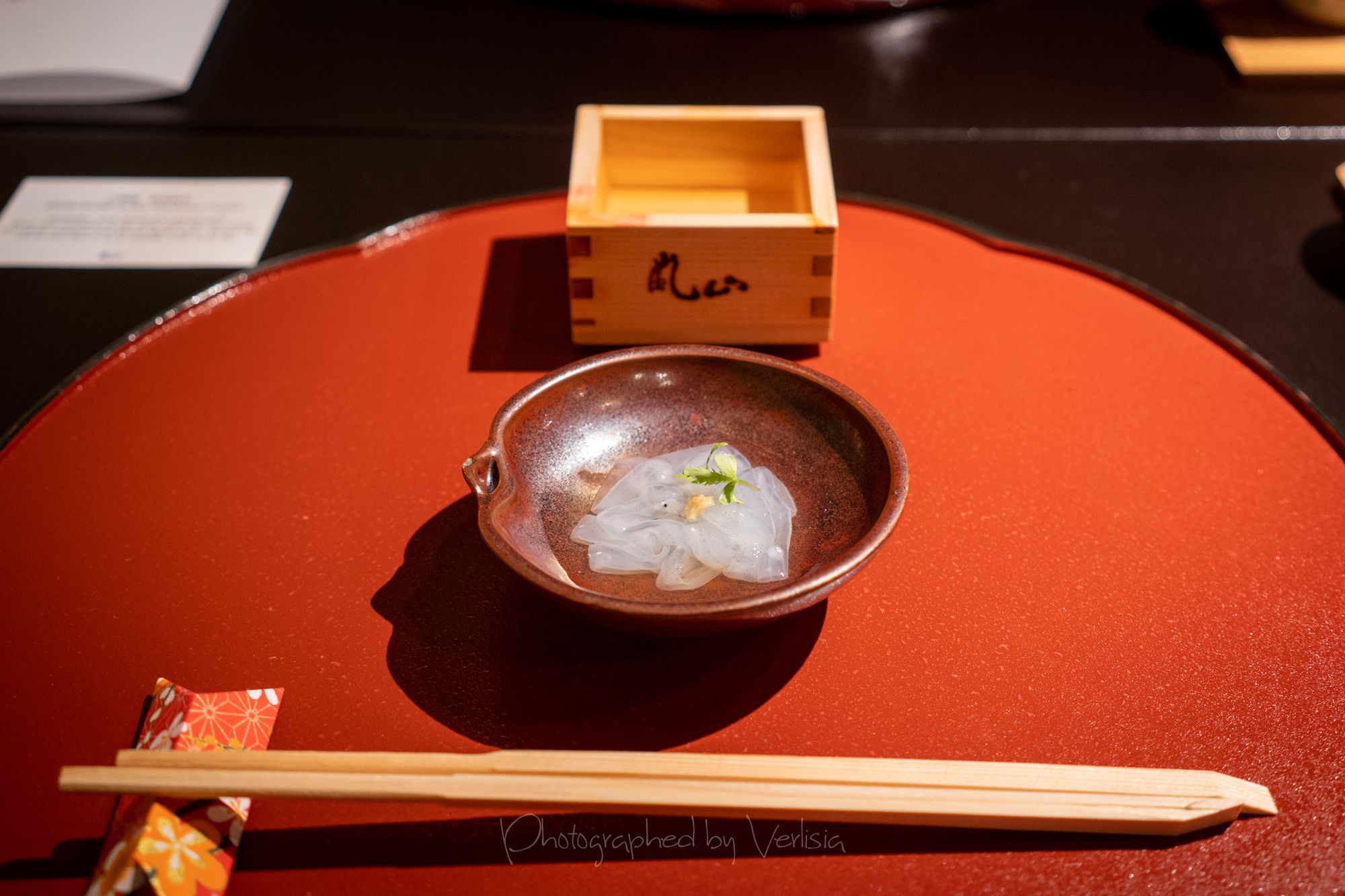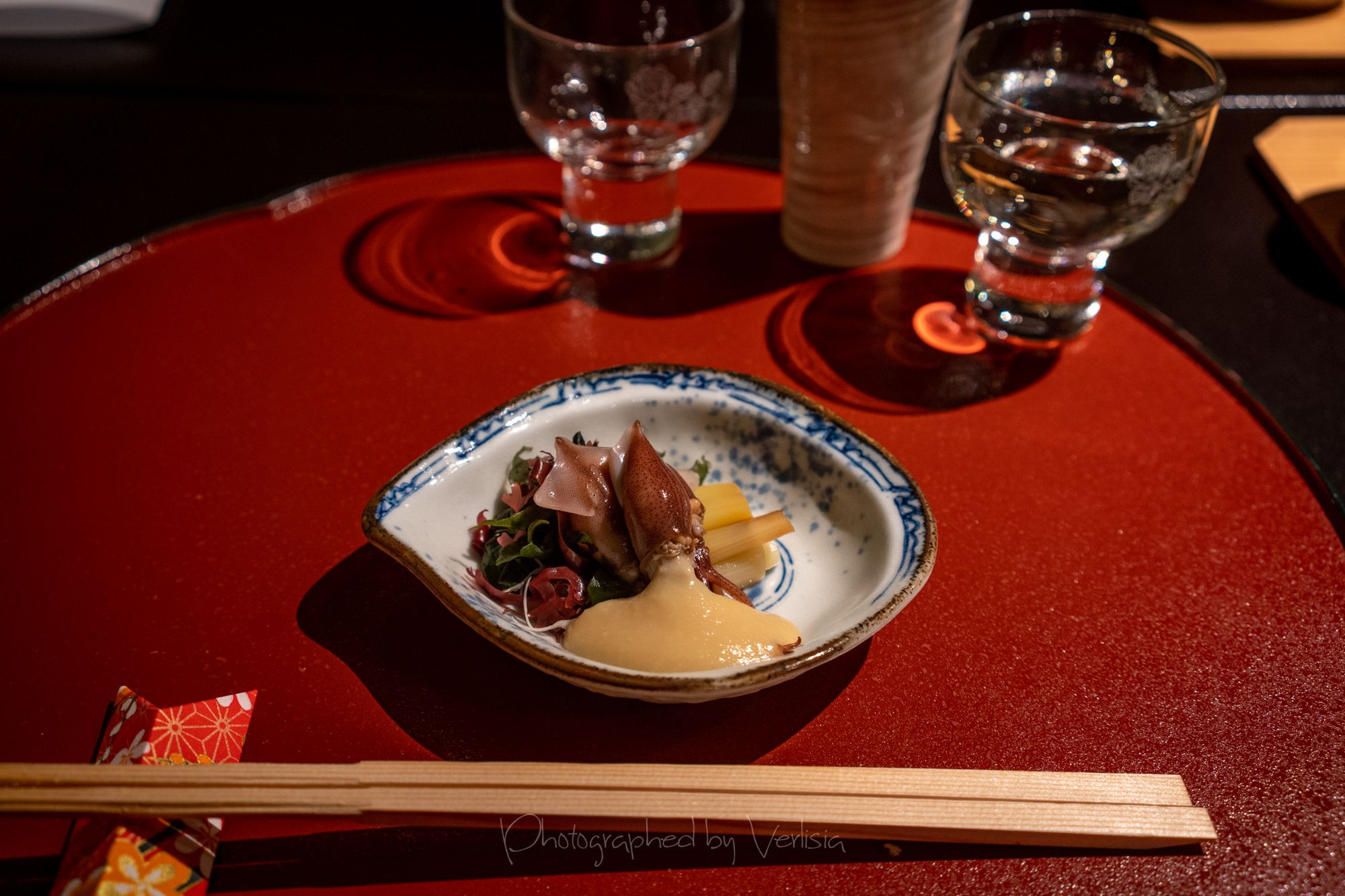 Sakizuke (Starter - Cuttlefish with Caviar), Chinmi (Delicacy - Noresore with Sweet Vinigrette), Shirakabe Gura Tokubetsu Junmai