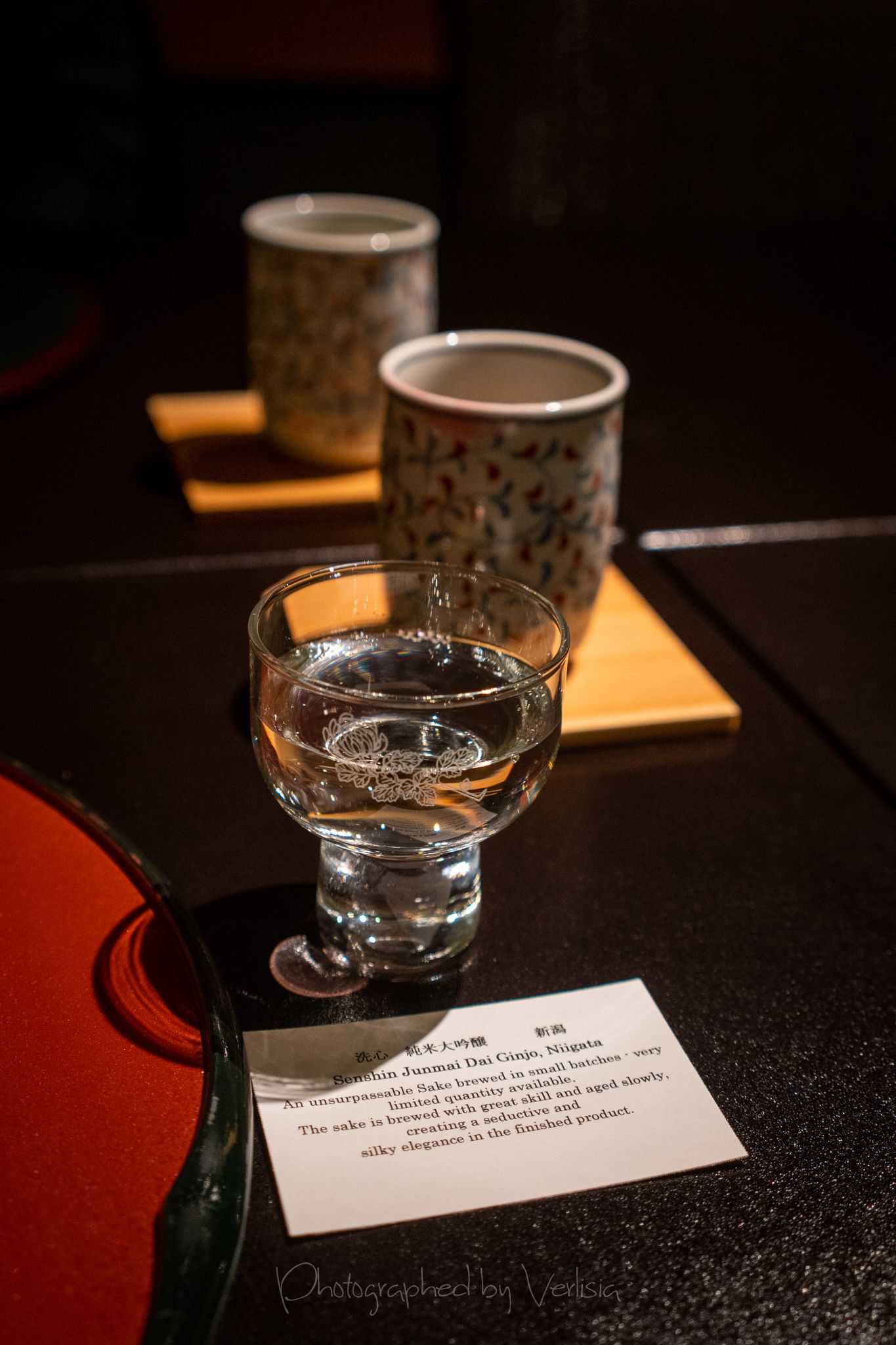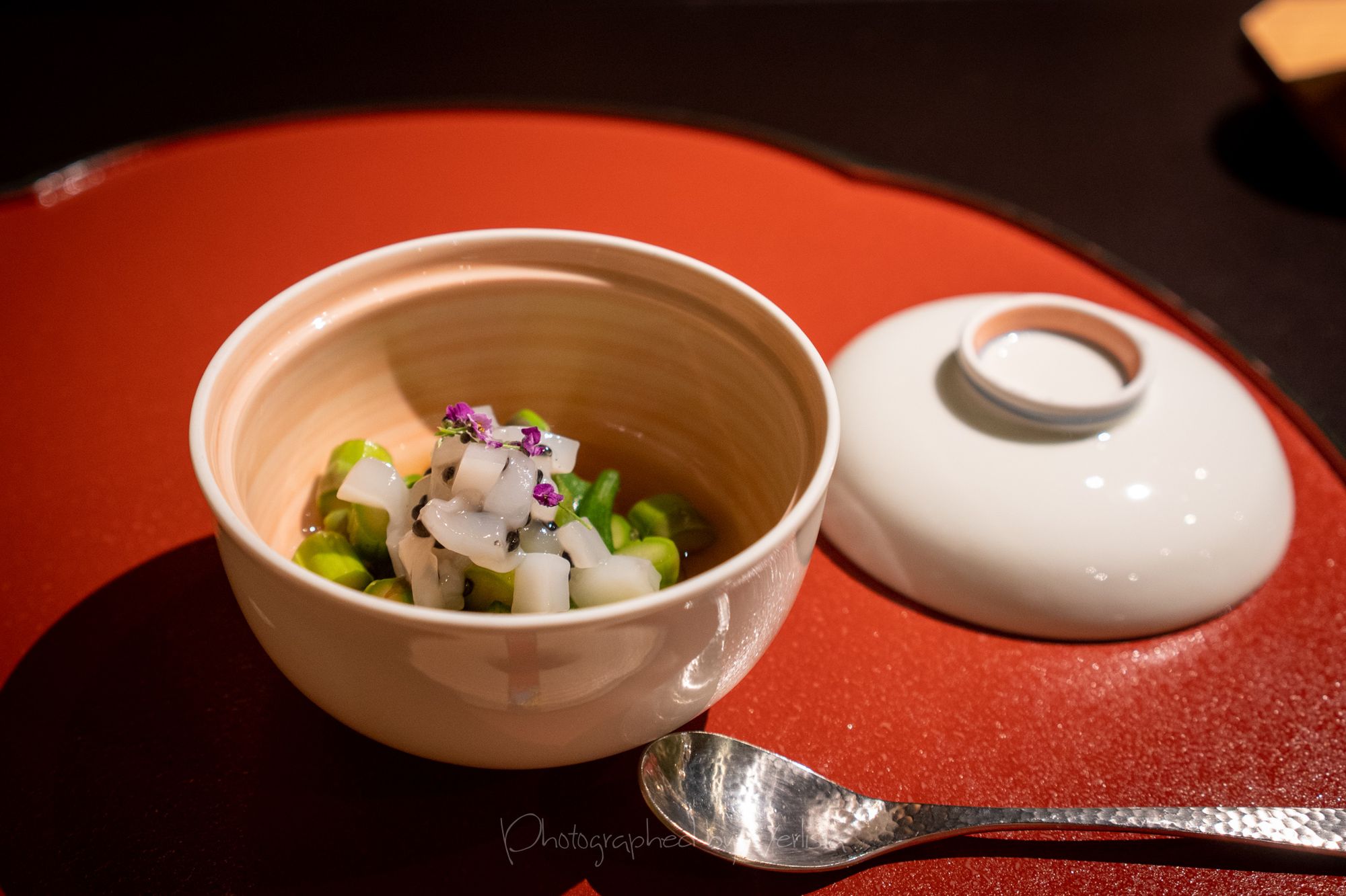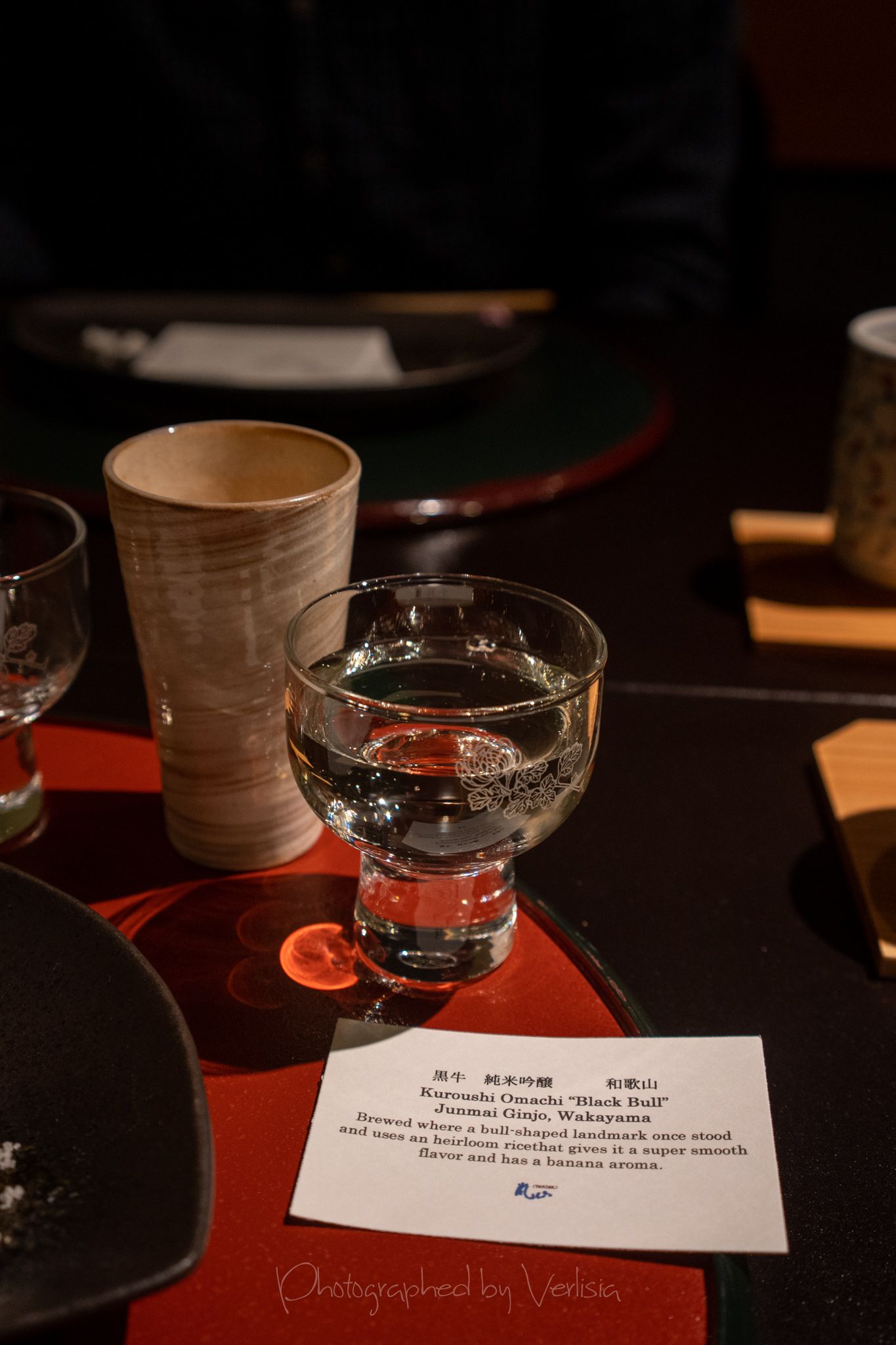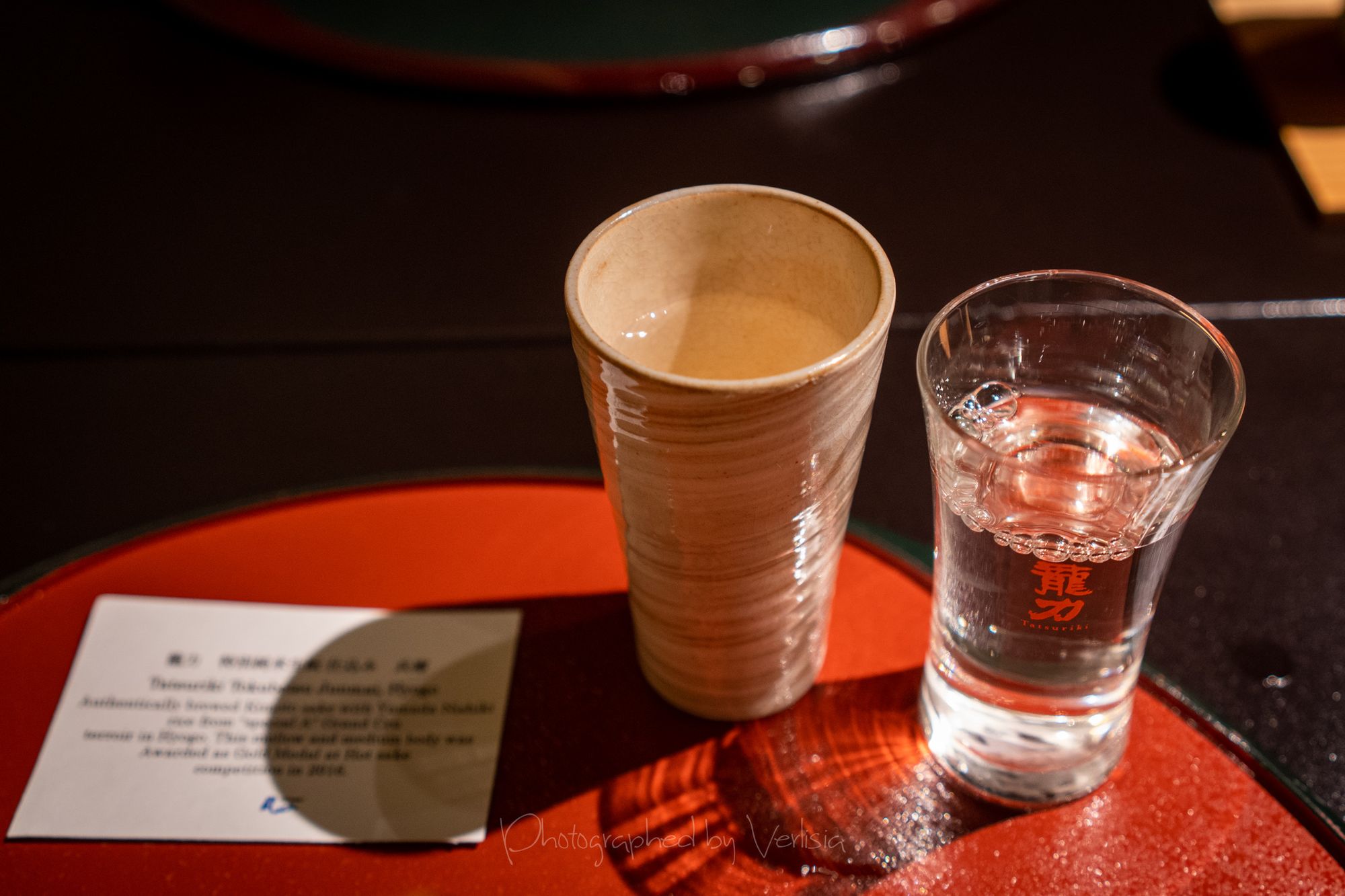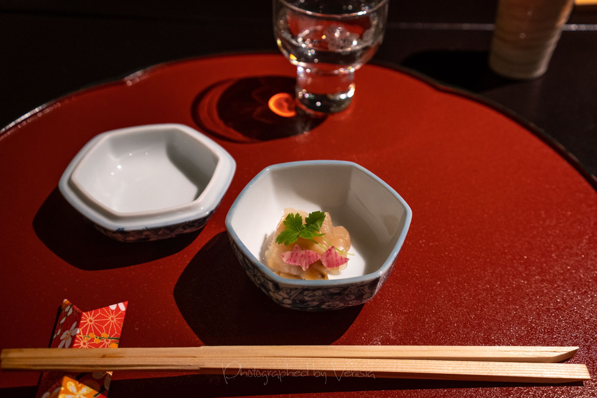 Sakizuke (Starter - Cuttlefish with Caviar), Chinmi (Delicacy - Noresore with Sweet Vinigrette), Shirakabe Gura Tokubetsu Junmai