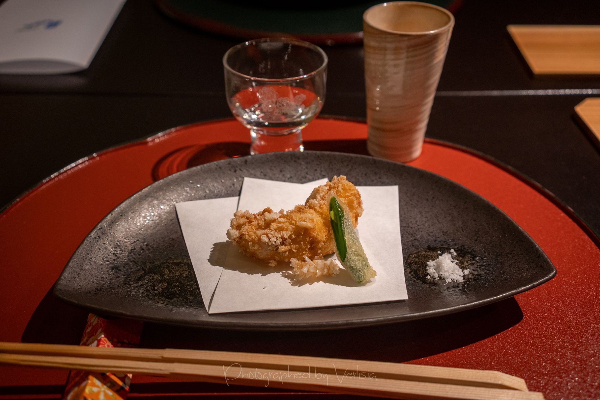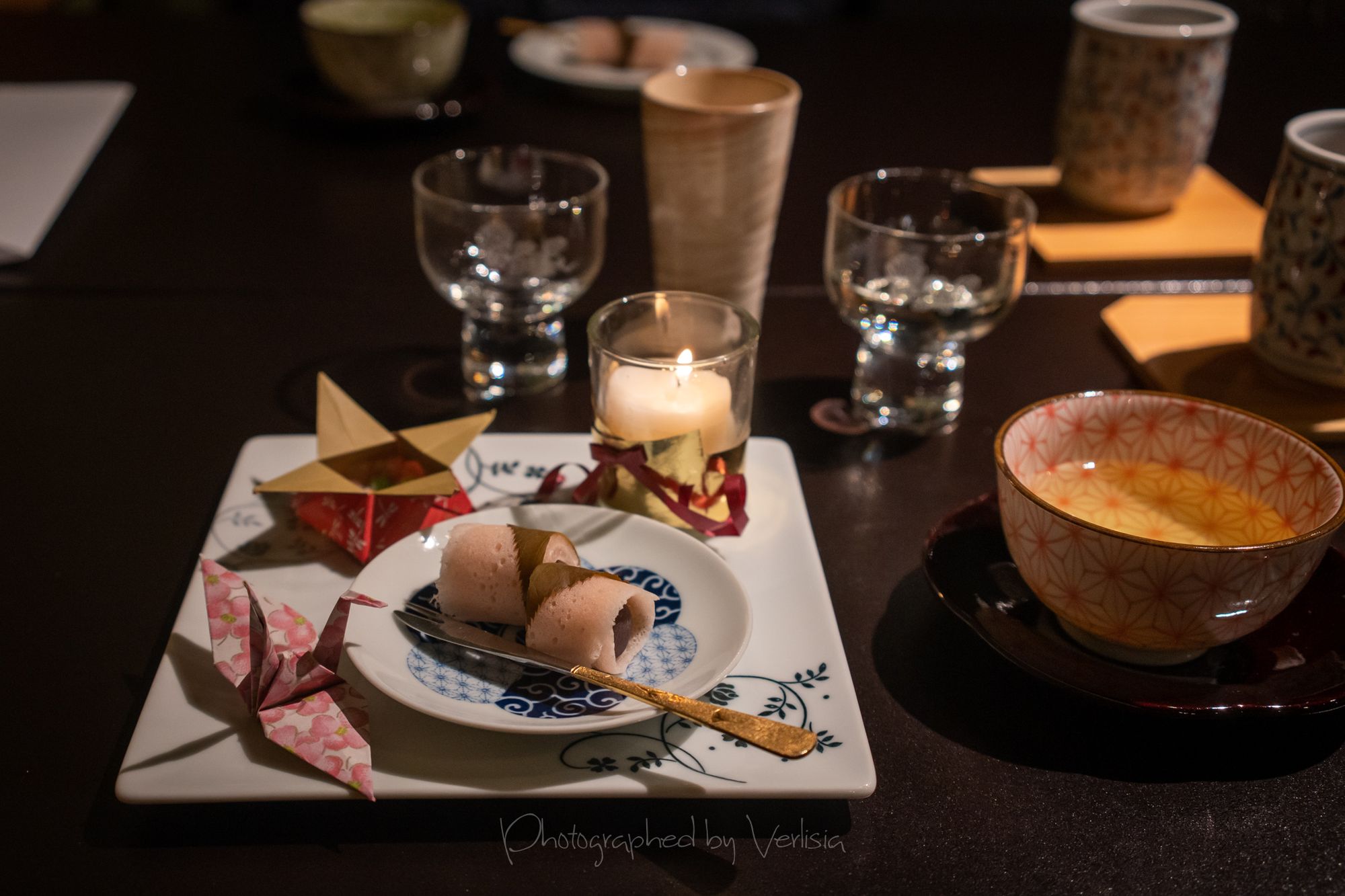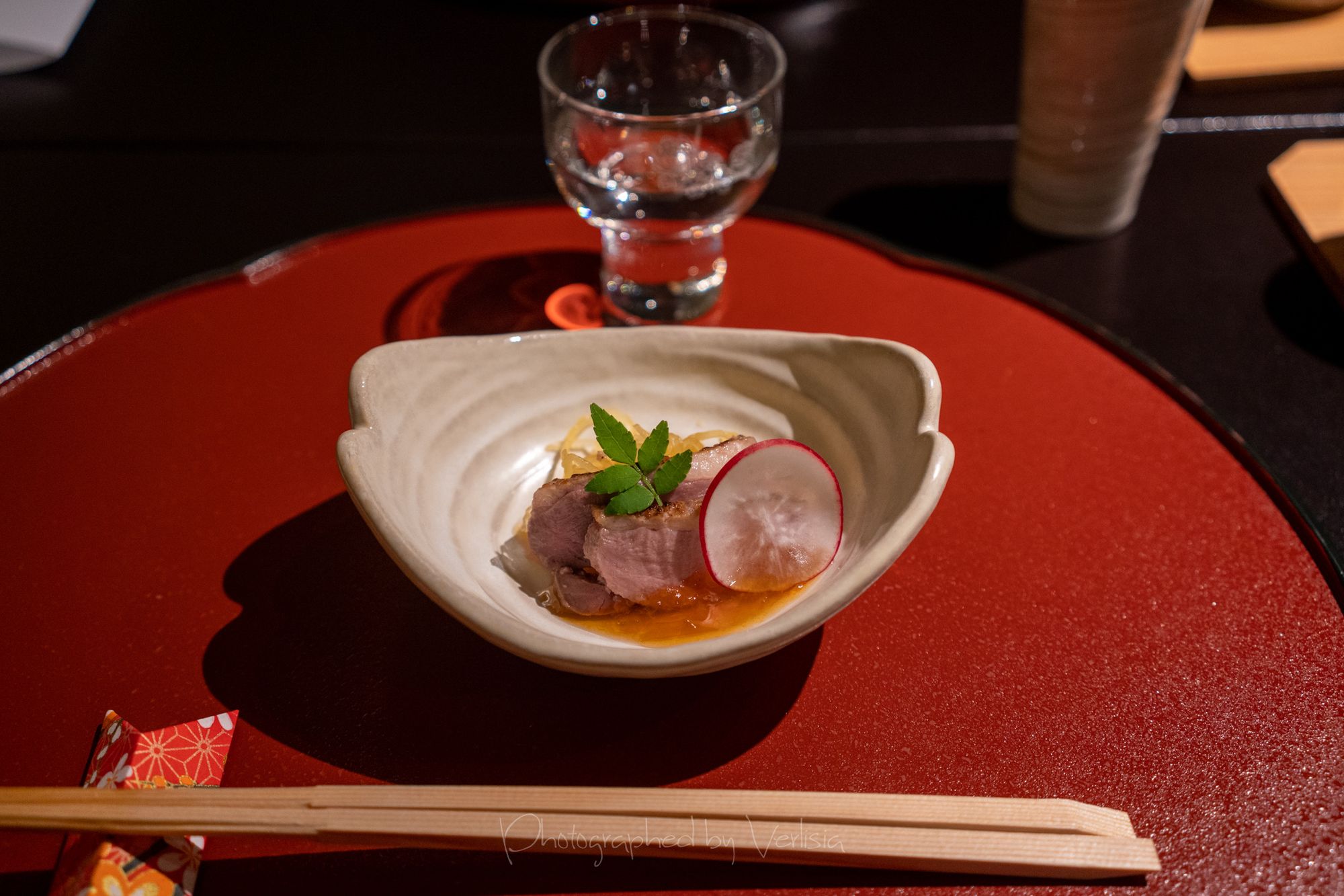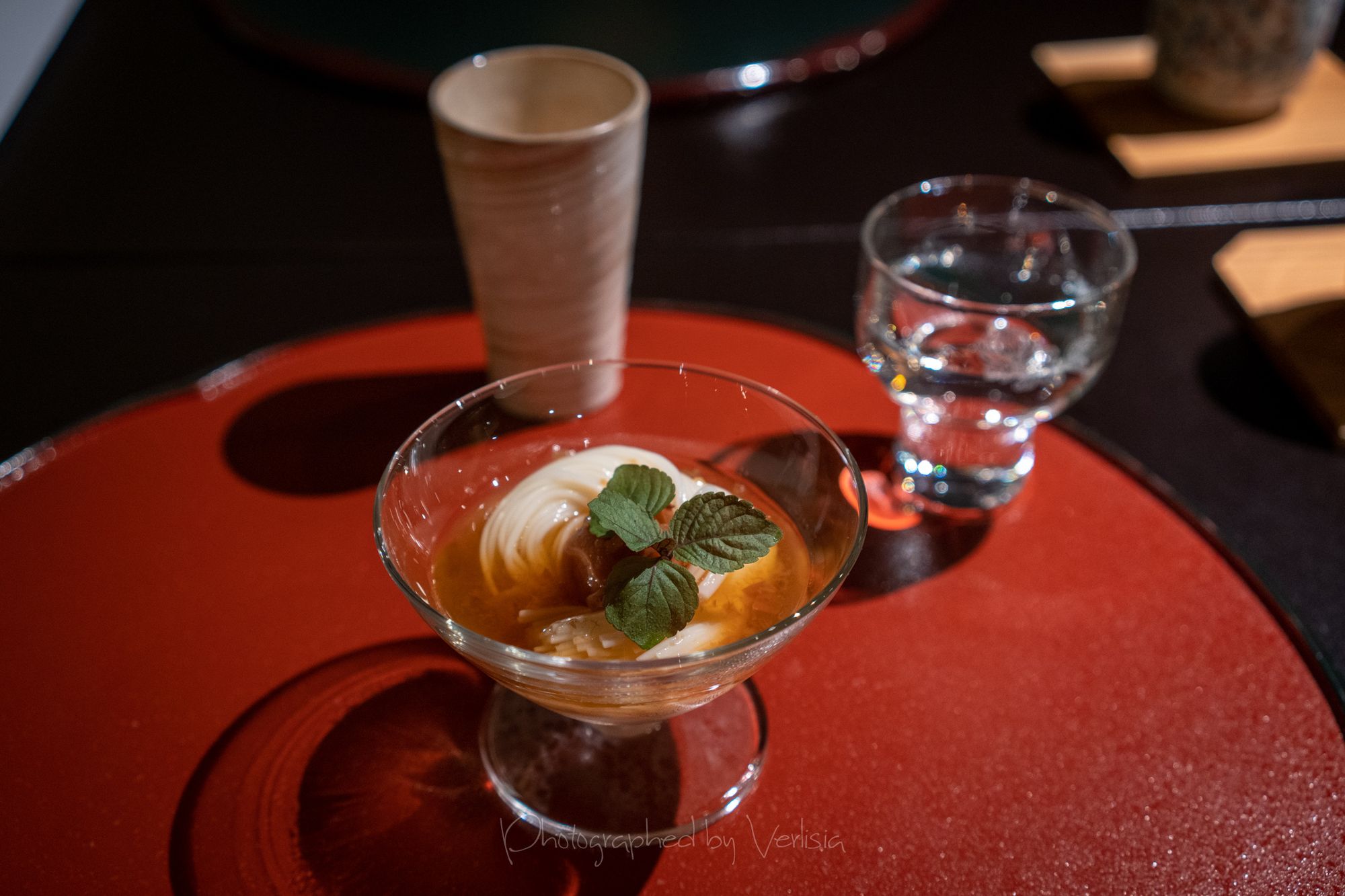 Sakizuke (Starter - Cuttlefish with Caviar), Chinmi (Delicacy - Noresore with Sweet Vinigrette), Shirakabe Gura Tokubetsu Junmai
