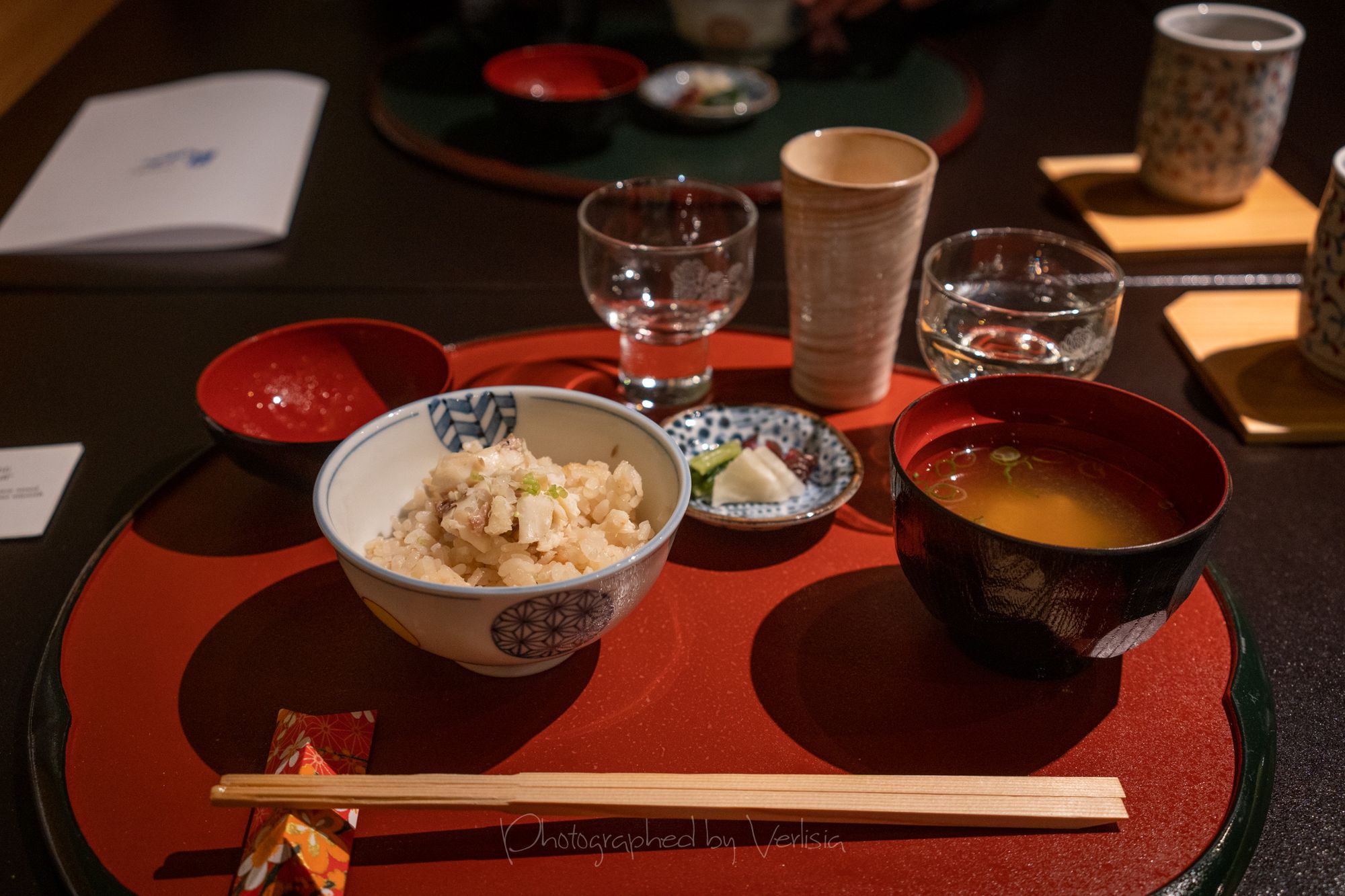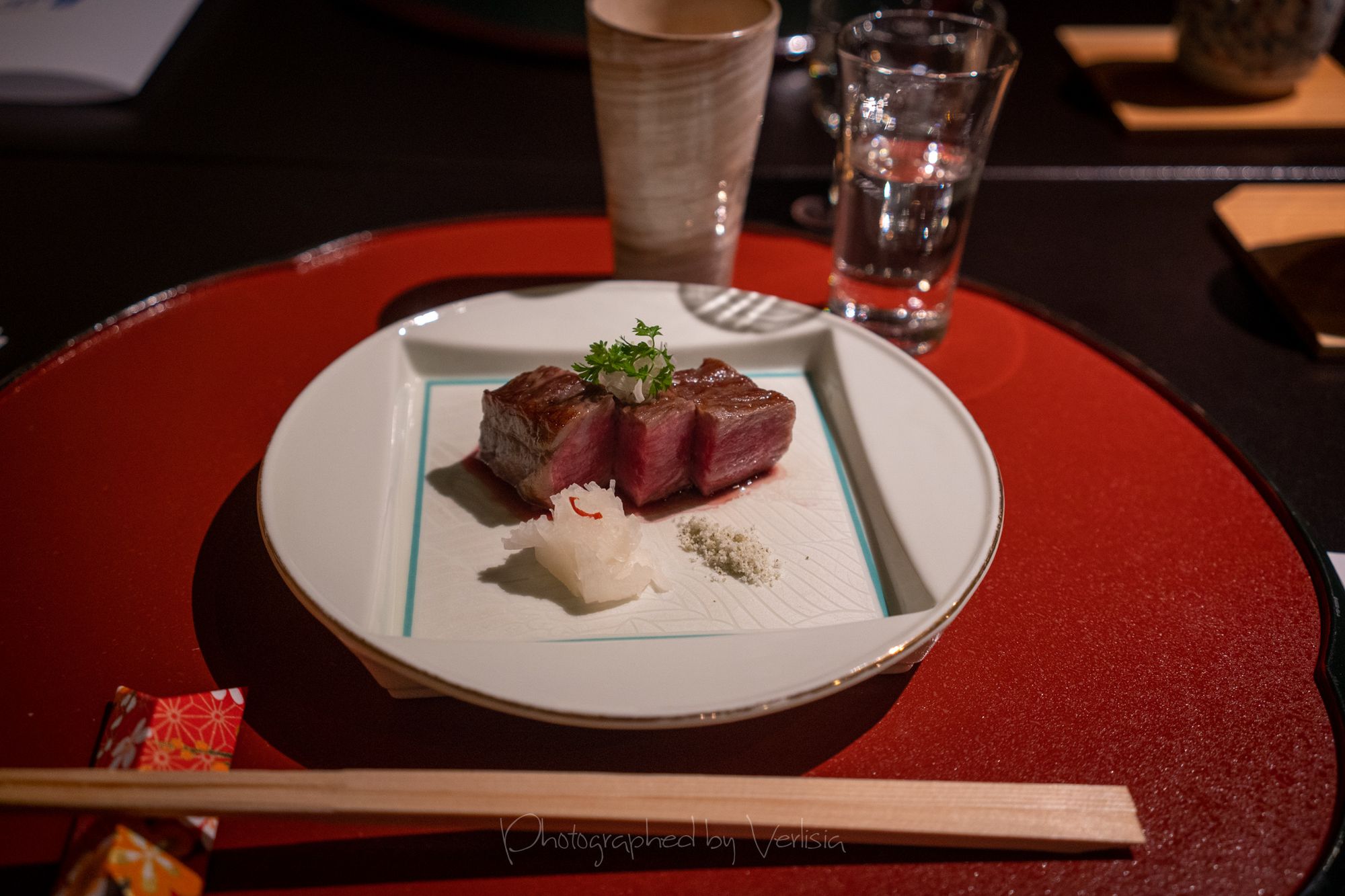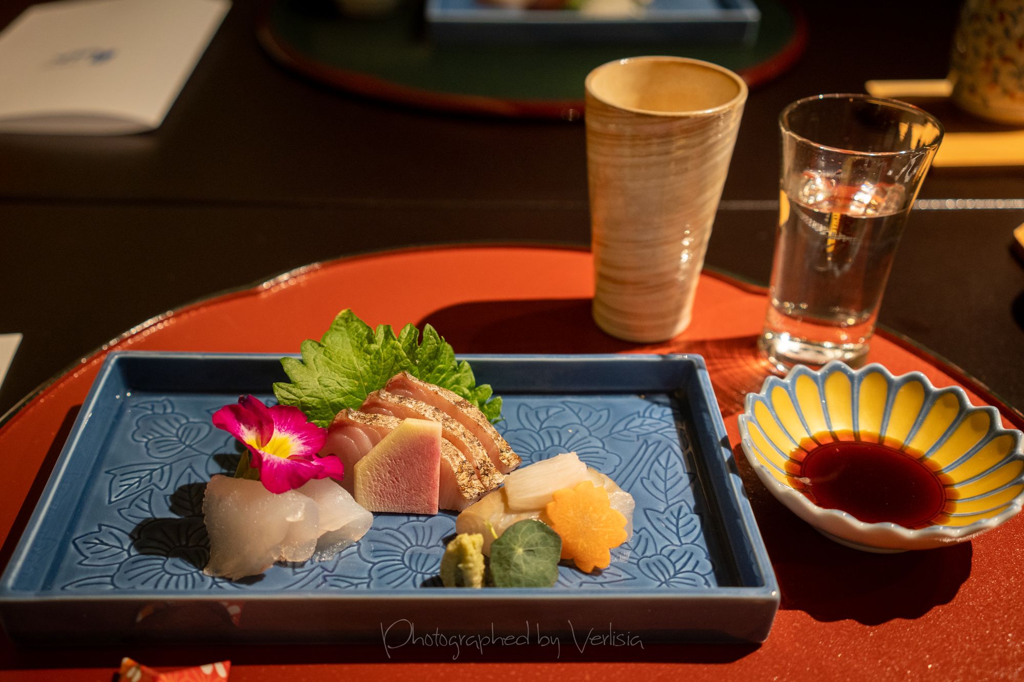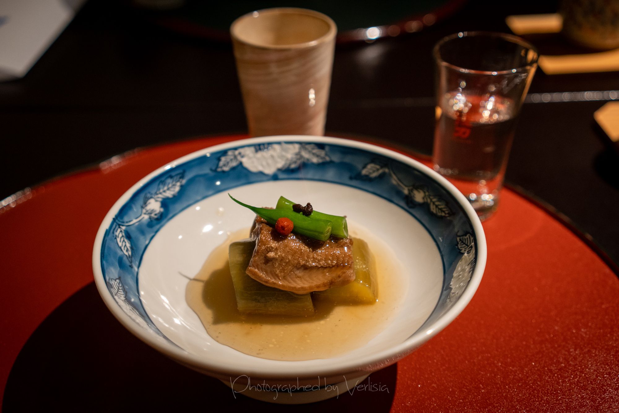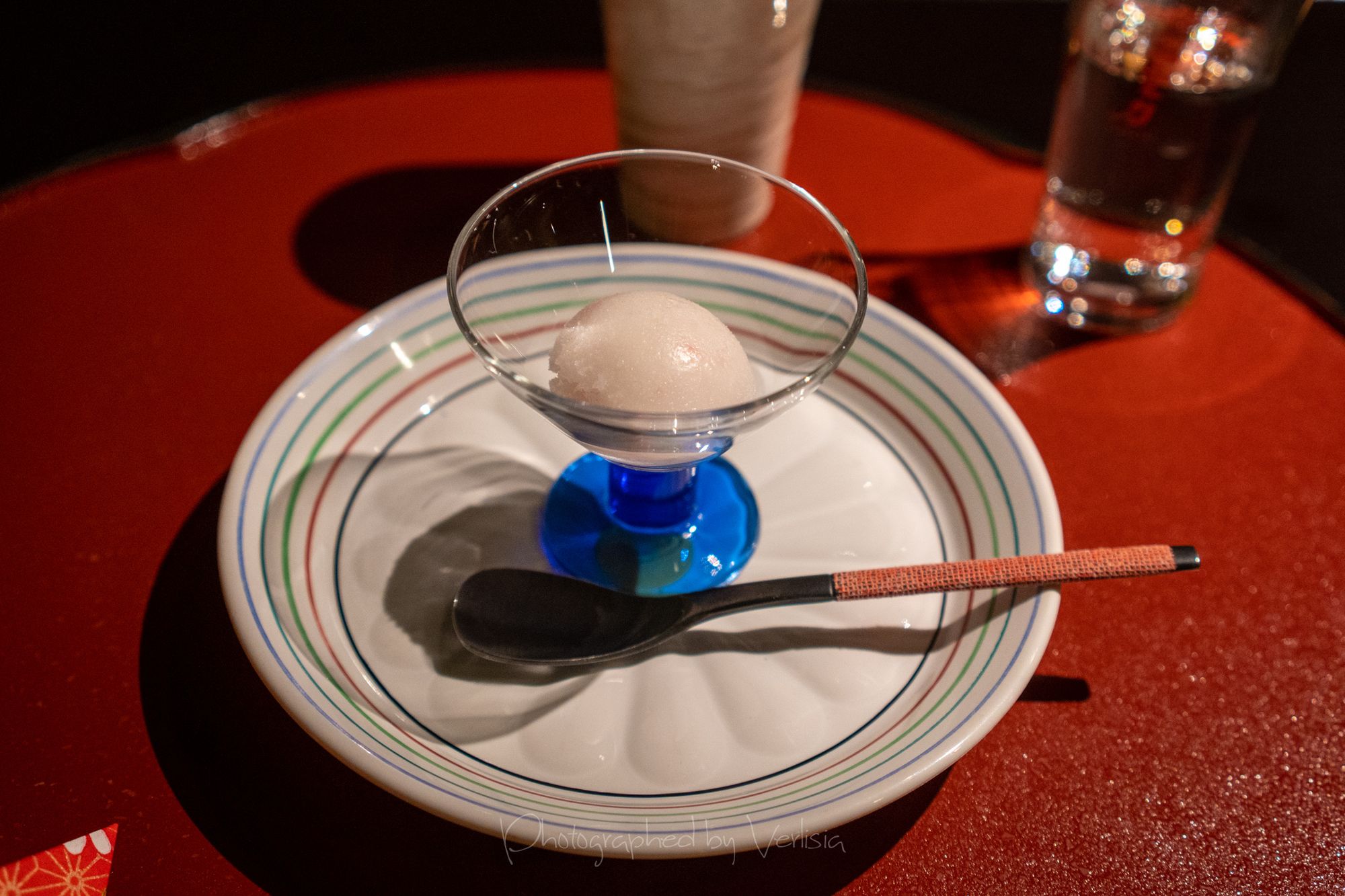 Sakizuke (Starter - Cuttlefish with Caviar), Chinmi (Delicacy - Noresore with Sweet Vinigrette), Shirakabe Gura Tokubetsu Junmai