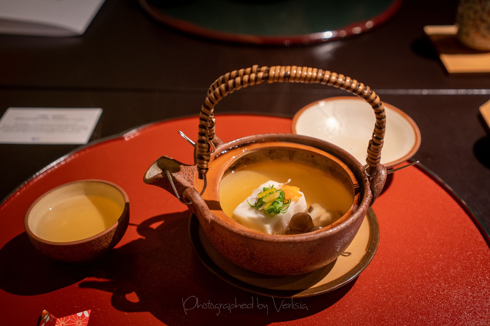 Zensai (Appetizers - Sakura Tofu, Green Vegetables with Mustard, Ikura, Nagaimo and Cucumber), Owan (Soup Dish - Lotus Root Fish Cake in a Clay Pot), Tatsuriki Tokubetsu Junmai Hyogo served Cold and Warm