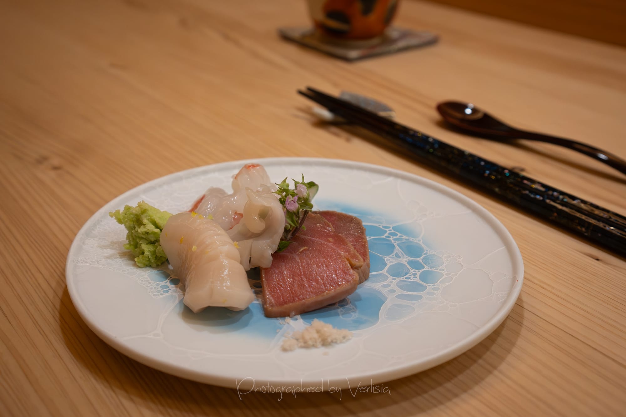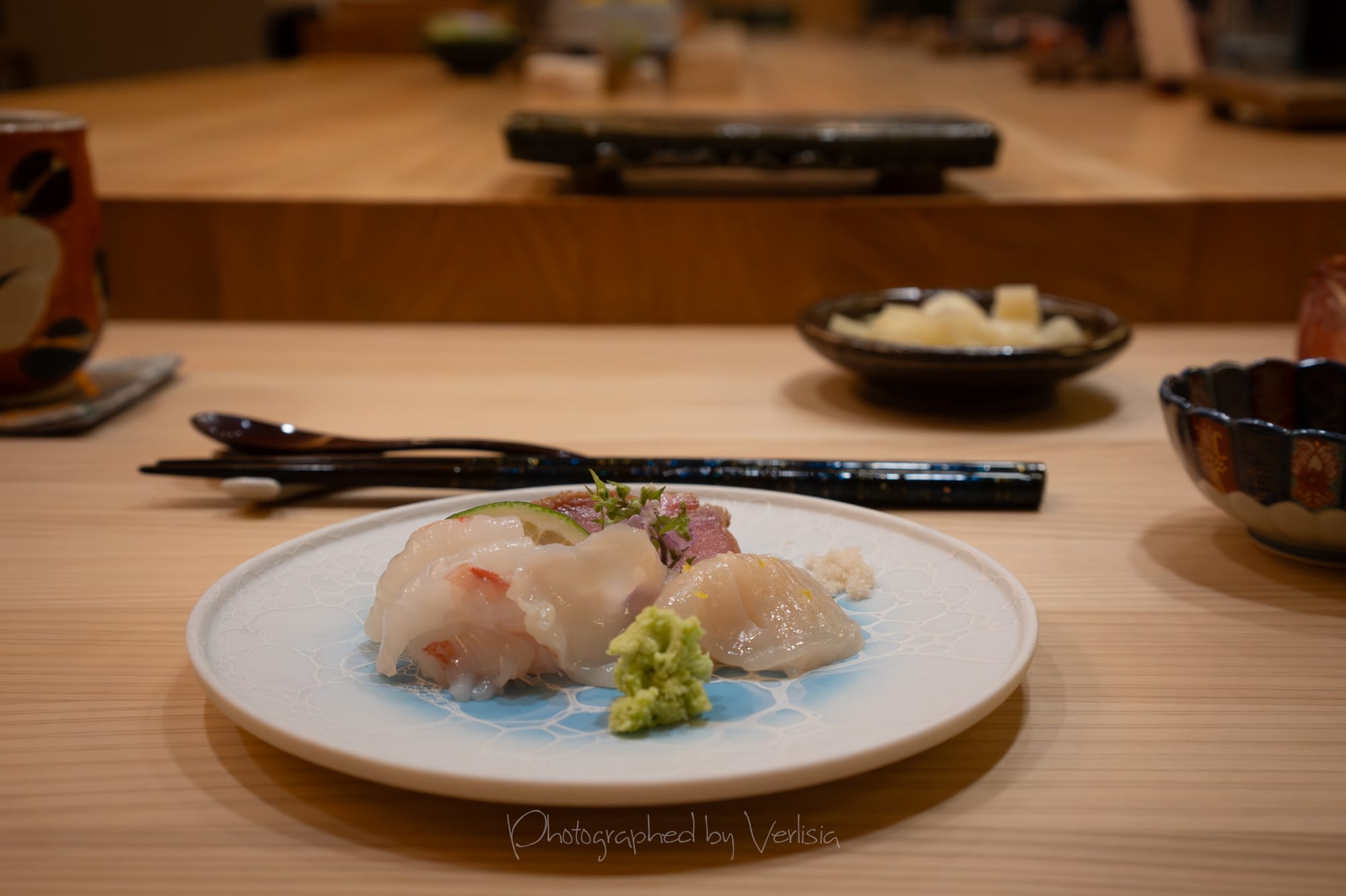 Sashimi Plate - Hotate (Scallop, from Hokkaido), Mirugai (Geoduck), Amaebi (Sweet Shrimp), Bluefin Tuna (from Washington)
