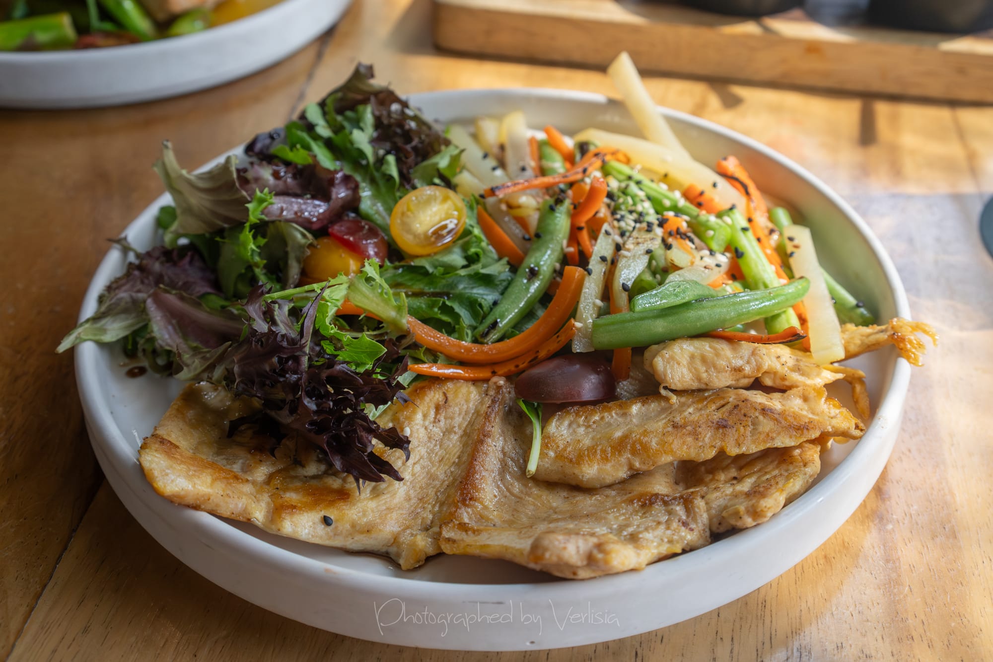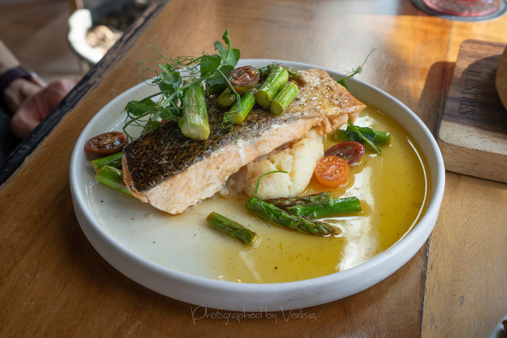 Salmon en Salsa de Limon con Miel (Lonja de salmon glaseada con salsa de limon y miel servida con esparragos salteados y pure ligero de papa); Pollo a la Plancha (Milanesa de pechuga de pollo a la plancha, servida con vegetales salteados)