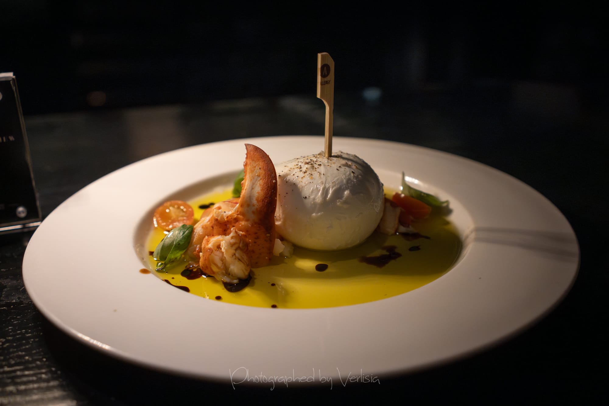 Cocktail - Crystal Paloma (Flecha Azul Blanco Tequila, Clarified Grapefruit, Citrus Salt), Maine Lobster Caprese (Bufala Mozzarella, Basil)