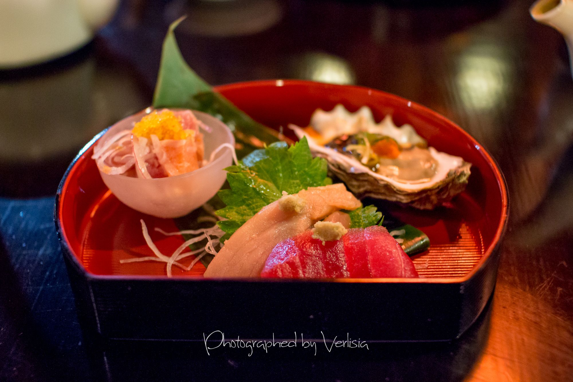 Sushi course dinner - appetizertuna (toro & akame) sashimi (fresh oyster and sashimi salad), Sushi course dinner - Nigiri 1st set (the lighter fare) (kanpachi, isaki, hamachi belly, salmon belly and aoyagi)Sushi course dinner - tempura, Sushi course dinner - chawamushi, Red Miso SoupSushi course dinner - nigiri 2nd set (the stronger fare) - tamago, anago, negi toro maki, uni, hotate and zuke (soy marinated bluefin tuna)