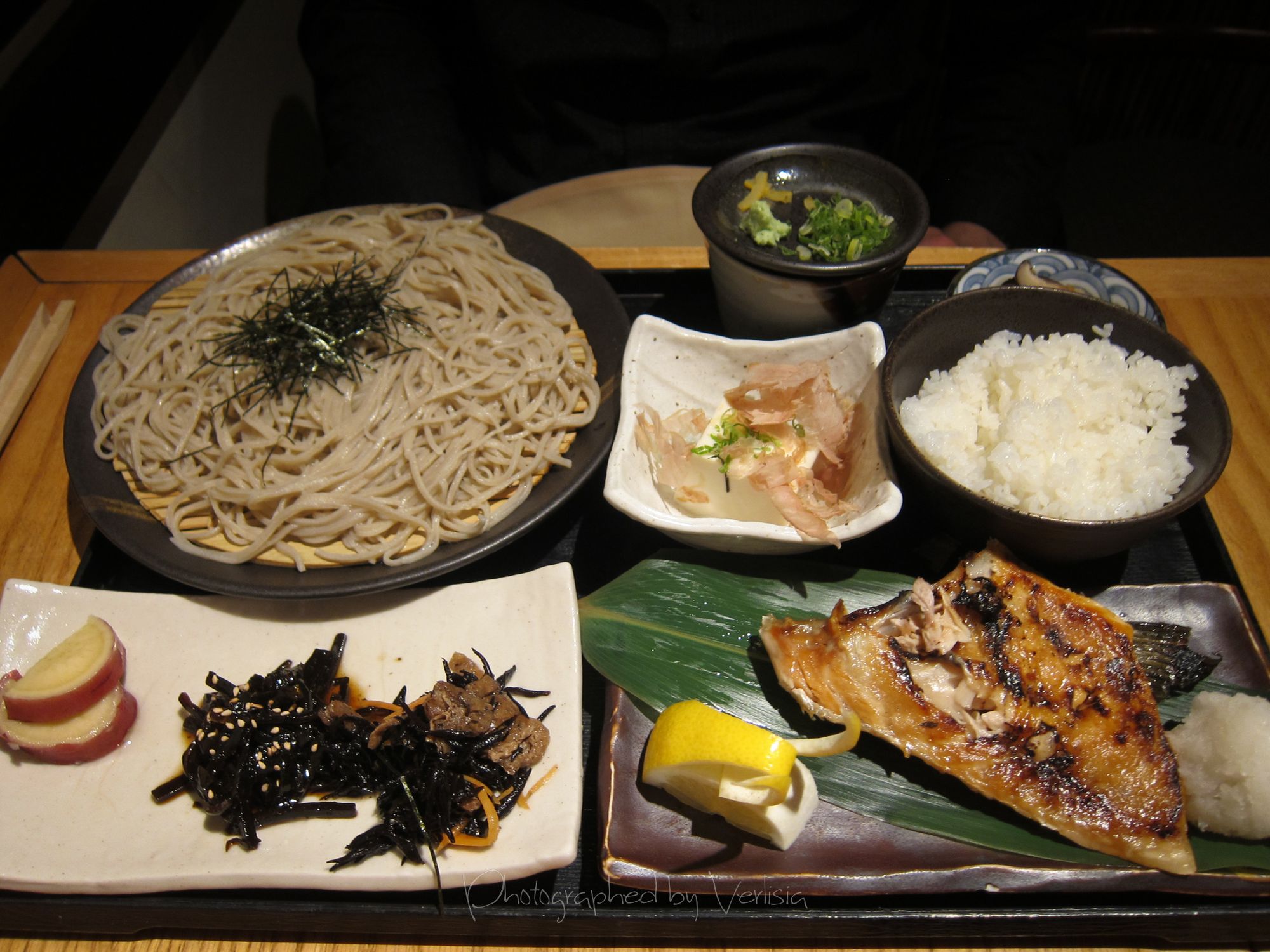 Yakizakana Goze - Seasonal Grilled Fish, Seasonal Appetizers, A Bowl of Rice, Homemade Soba Noodles (Hot or Cold), DessertTofu Appetizer, Seasoned Vegetable Appetizer, Steamed Egg AppetizerHomemade Soba Noodles (Cold), Seasonal Grilled FishGreen Tea Sorbet, Sake ManjuChocolate Souffle with Raspberry Sauce and Ice Cream
