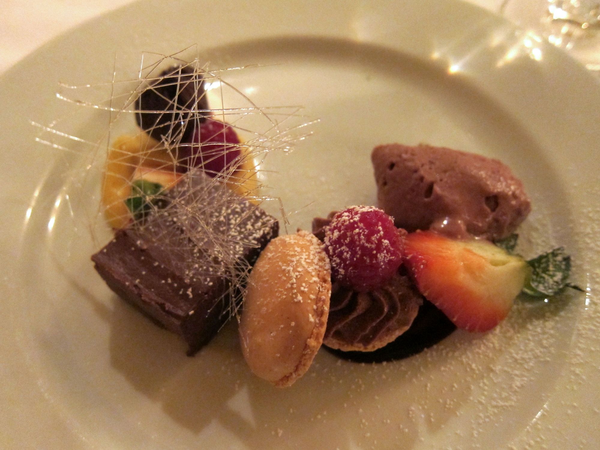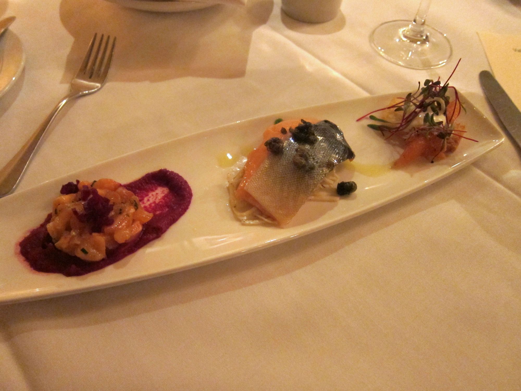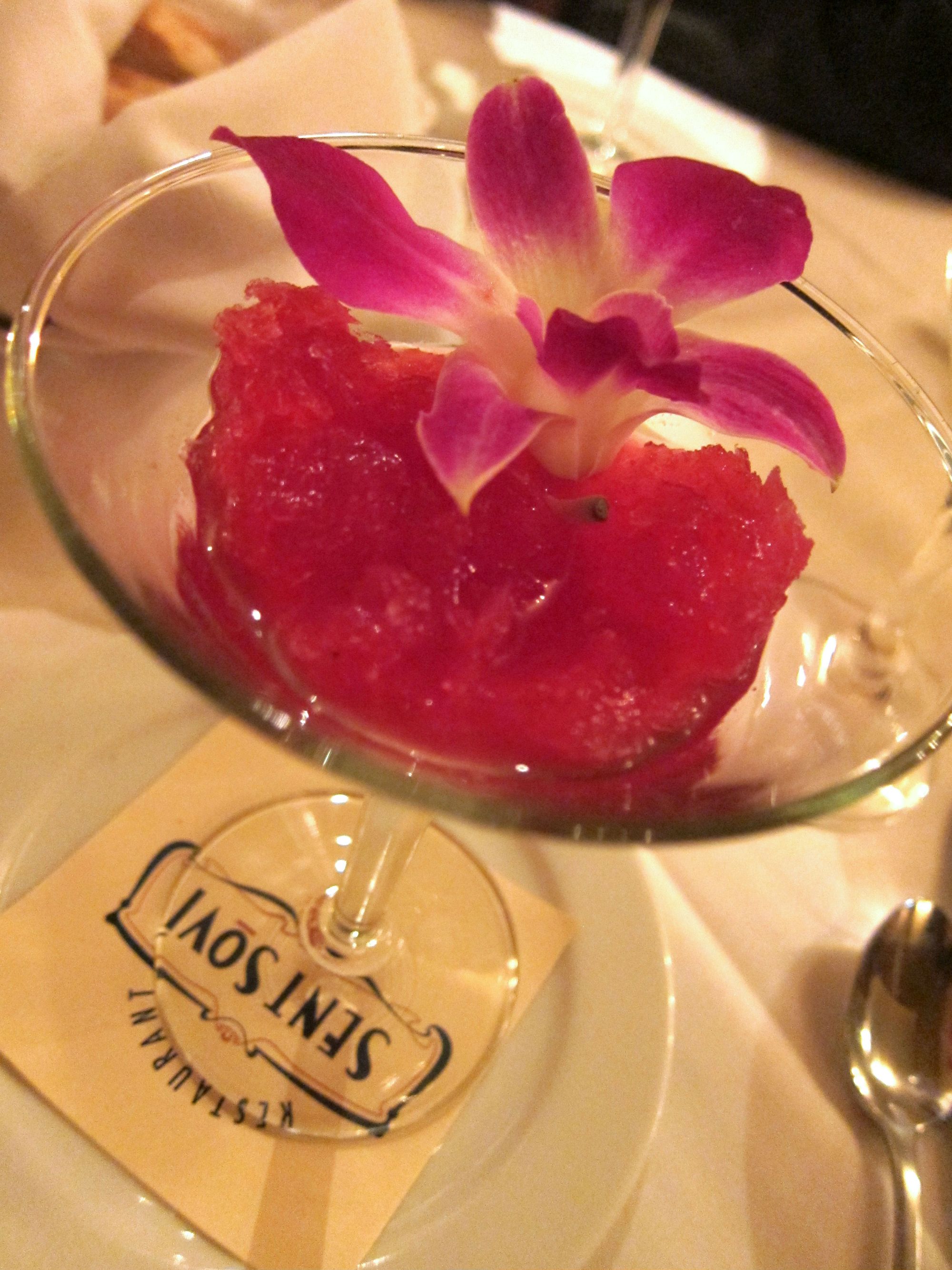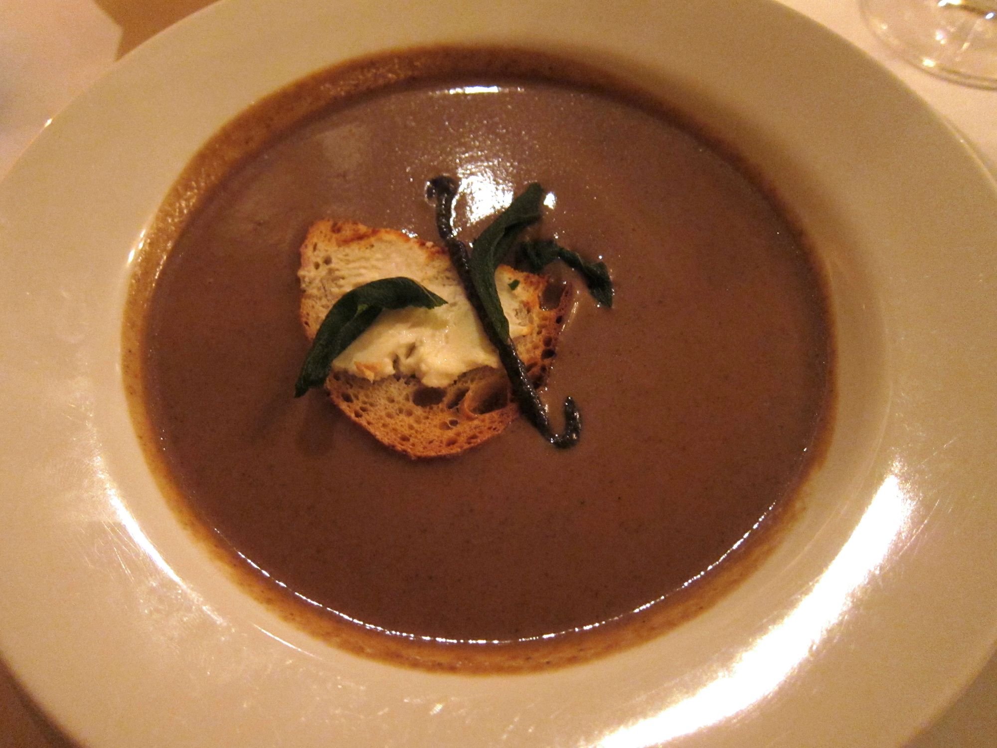 Cuisine - French Sent Sovi, Saratoga, California [Closed] Sent Sovi, Saratoga, California (Feb 2010) 14583 Big Basin Way # 2A, Saratoga, CA 95070Feb 2010[Closed]Valentine Prix Fixe Dinner MenuTriptych of Arctic Char - "Mi Cuit", Gravlax and Tartare, Red Endive and Dungeness Crab SaladPorcini Mushroom and Black Truffle Soup, Rose and Prickly Pear GranitaNew York Steak "Mignon" with French Fingerling Potato Confit, Trio of Chocolates and Red FruitsBrownies Share