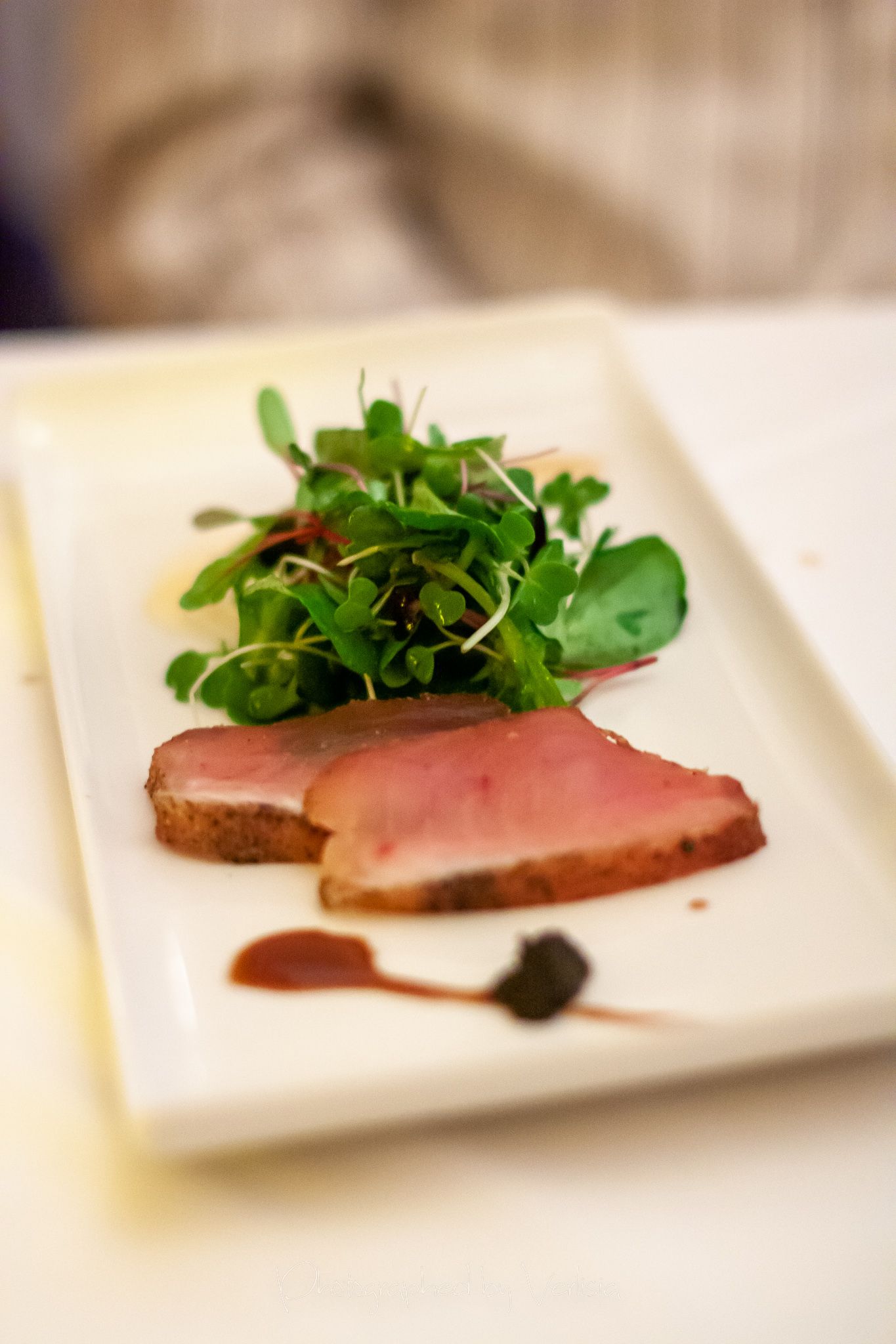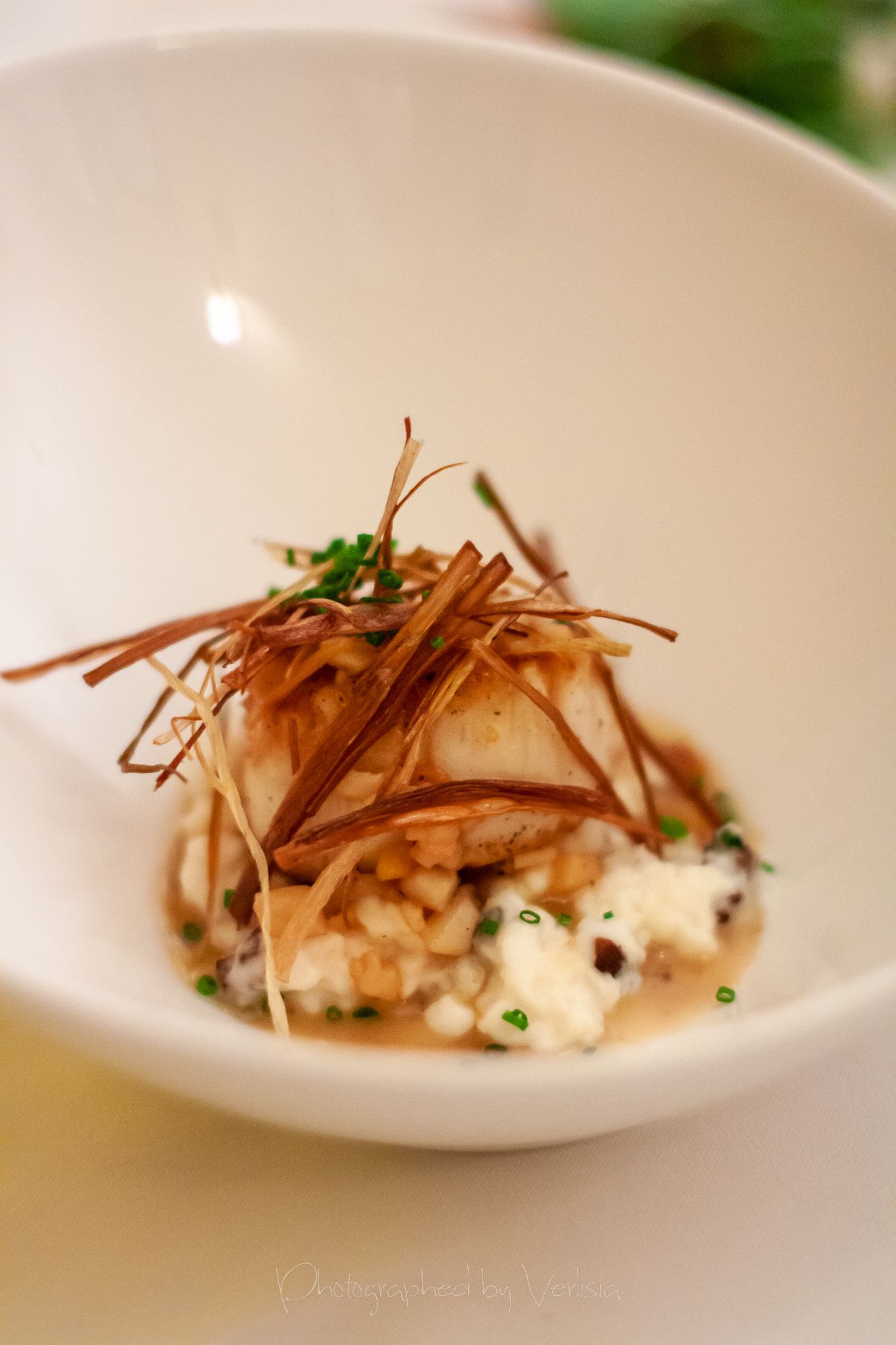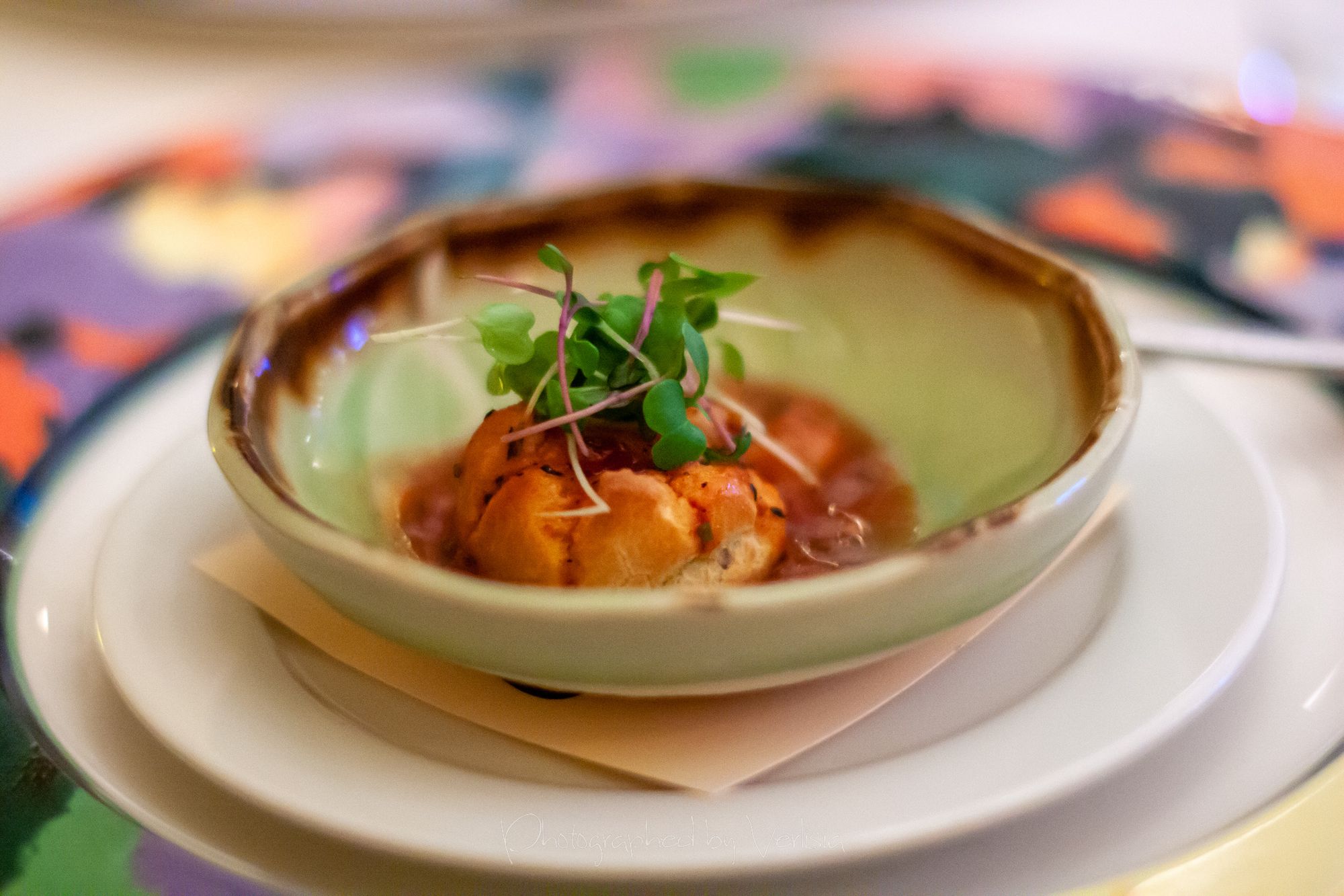 amuse bouche (tomato puff), Smoked Tombo Tuna with Harissa Crème Fraîche and American Sturgeon Caviar, East Coast Scallop on Soft Scrambled Scallops with Caramelized Scallop Jus