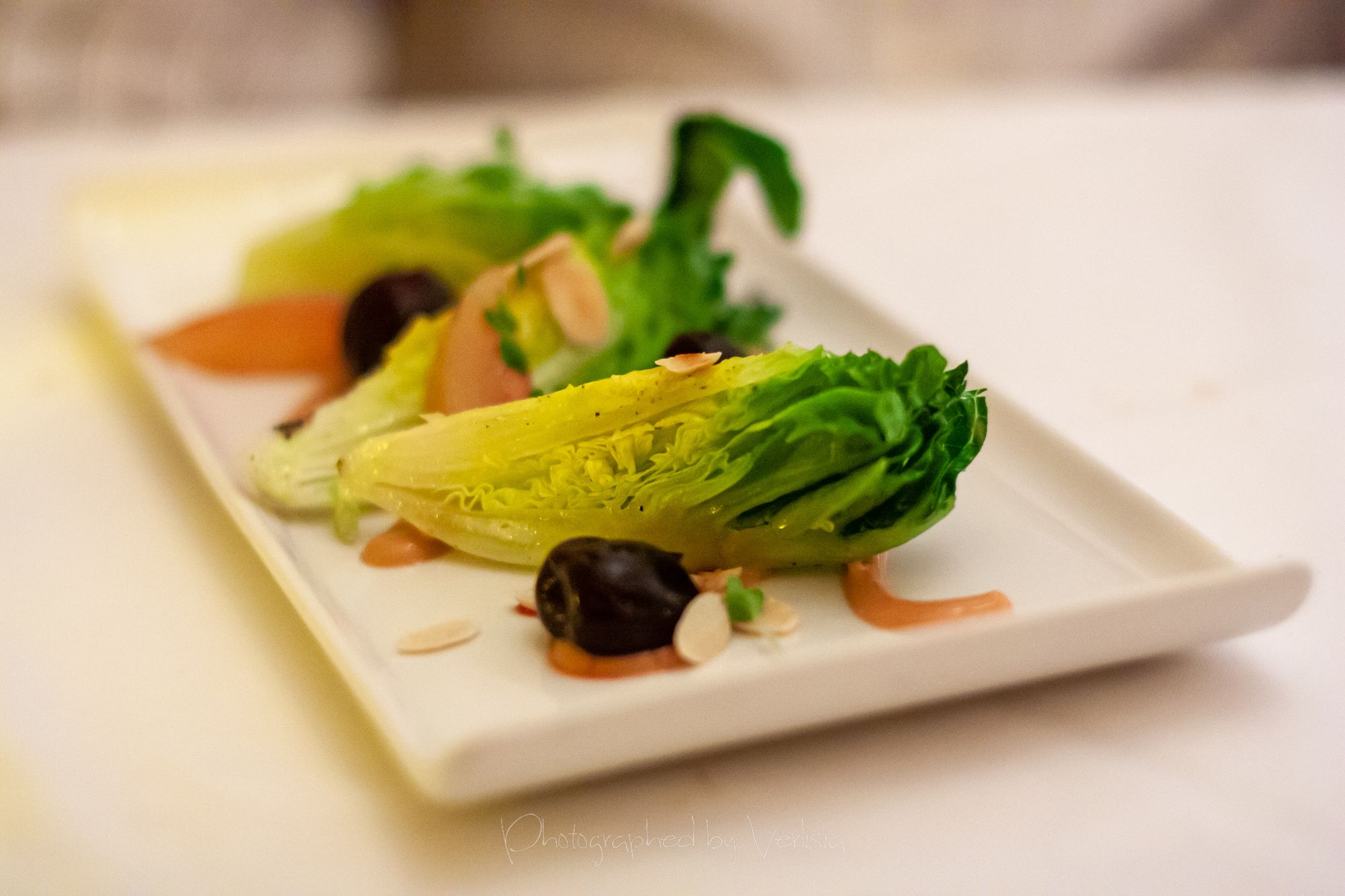 Roasted Golden Beets with Apple and Truffle, Sweet Gem “Wedge” Salad with Stone Fruit and Almonds