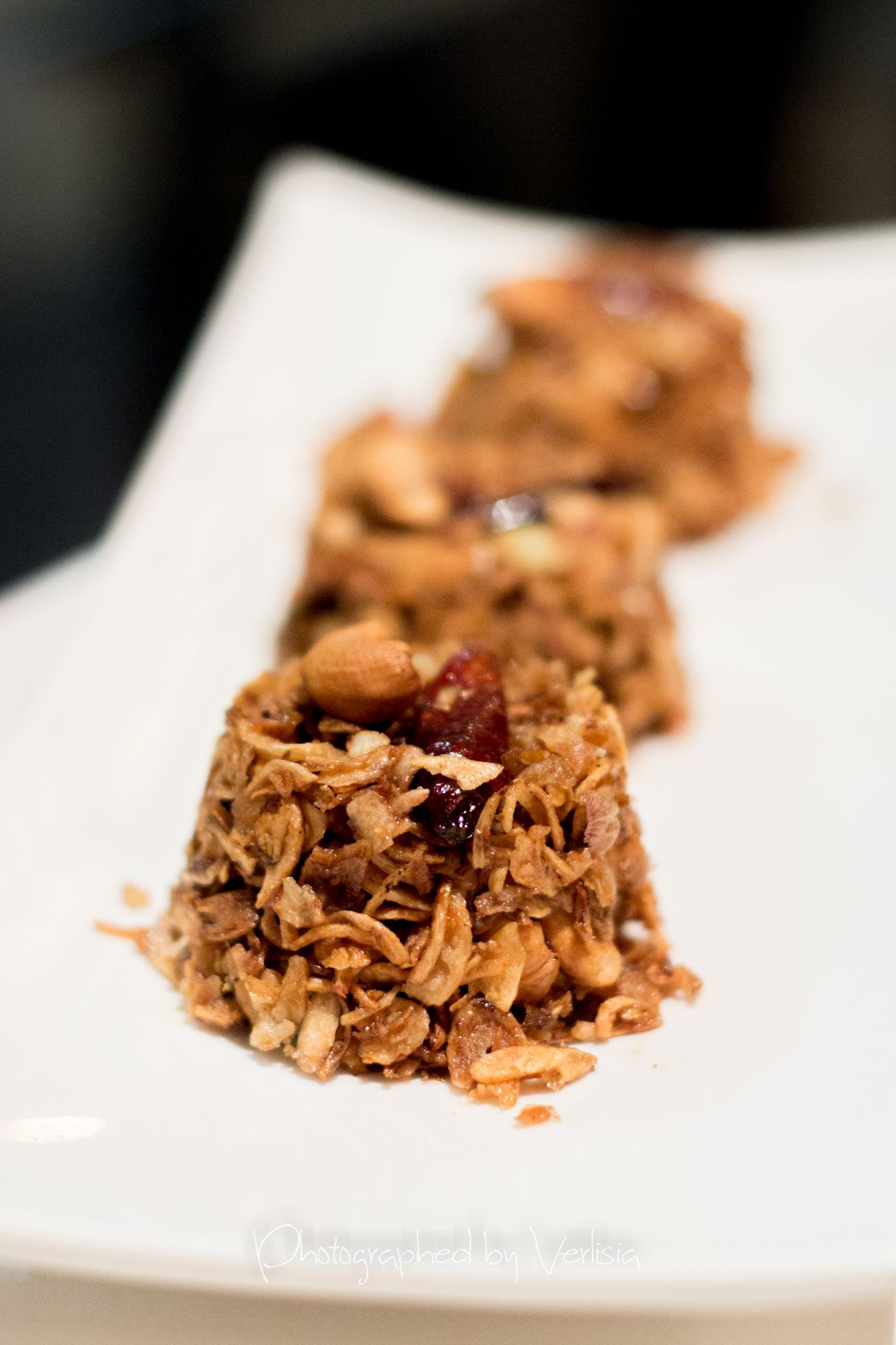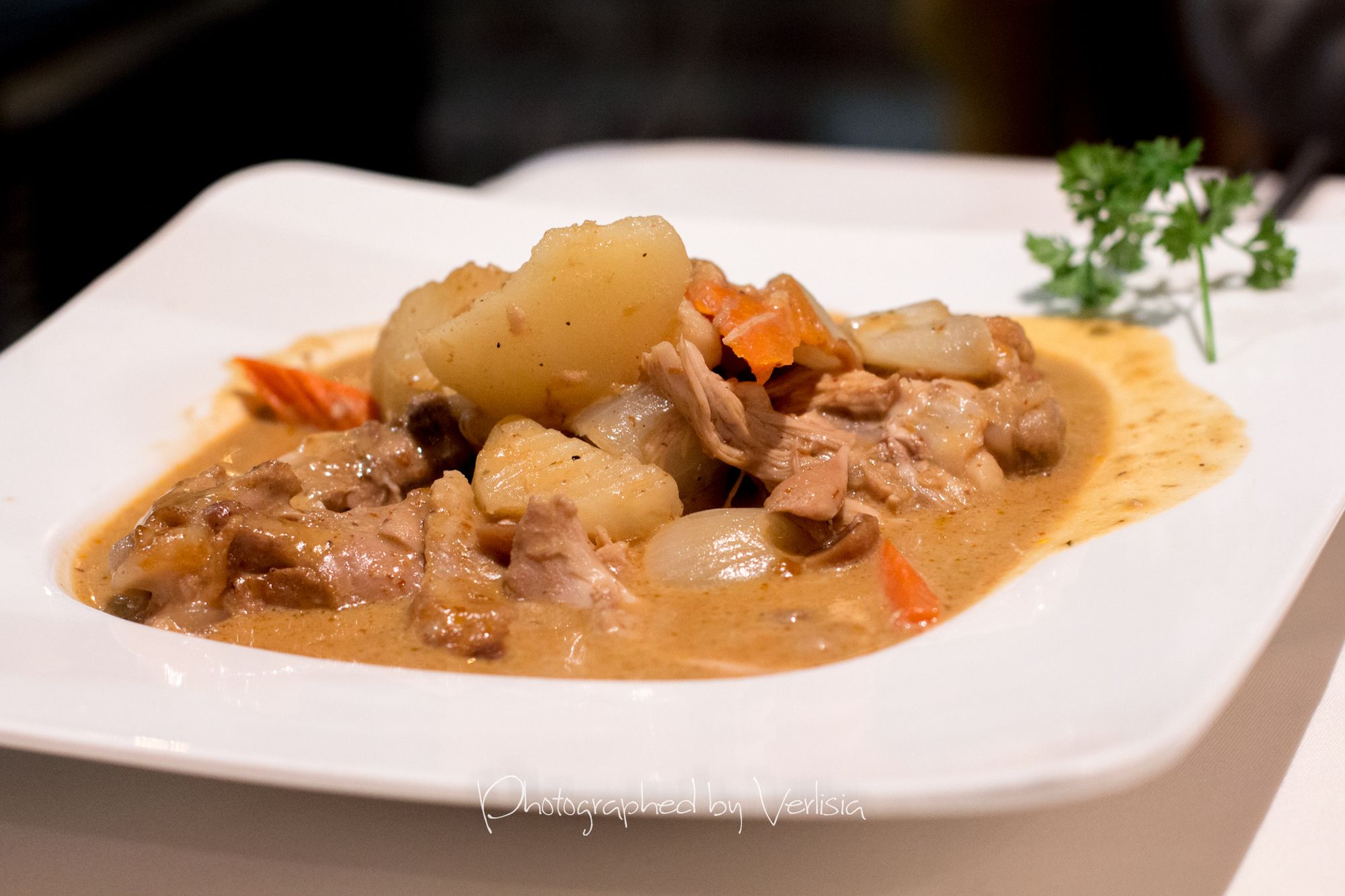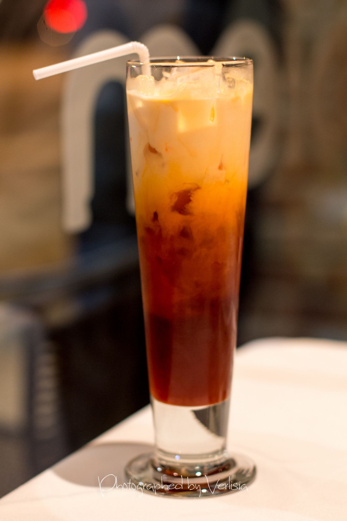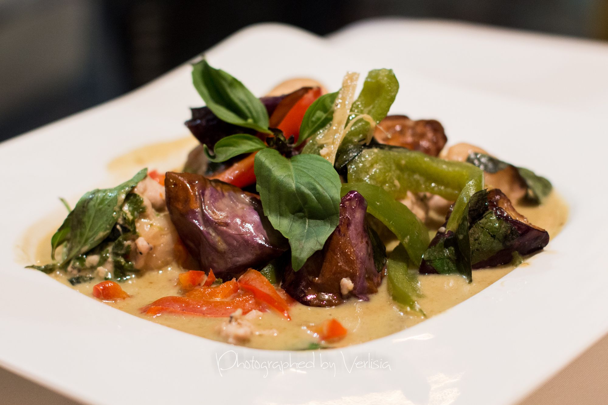 Thai Ice Tea, Samoon Pral Suphan (Thai Herbal Comfort dish, homegrown lemongrass, Kaffir Lime Leave, Organic Red Onion, Cashew Nut, and Roasted Chili in Samoon Prai Sauce), Pomegranate-tini