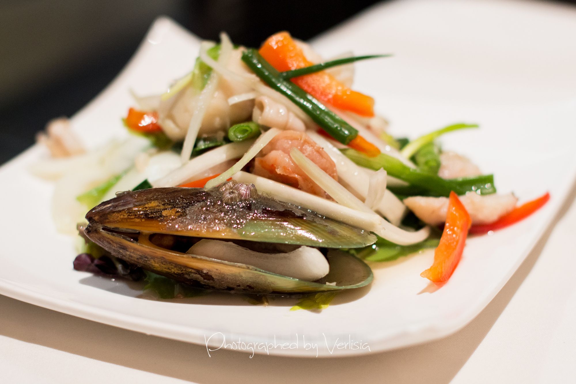 Yum Ruam Mit Talay (Spicy combination seafood salad, tossed with organic tomatoes, organic yellow and green onions, organic sliced red bell peppers, Chinese celery, and organic garlic in chili lime seafood dressing), Massaman Gai (A southern Thai style mild curry with tender chunks of stewed organic chicken thigh in coconut milk with organic potatoes, peanuts, organic carrots and organic onion core)Gang Khaew Wan Lychee Moo-sub (Spicy green coconut milk curry with organic ground pork stuffed in Lychee, Home grown Kaffir lime leaves, organic eggplant, organic bell peppers)