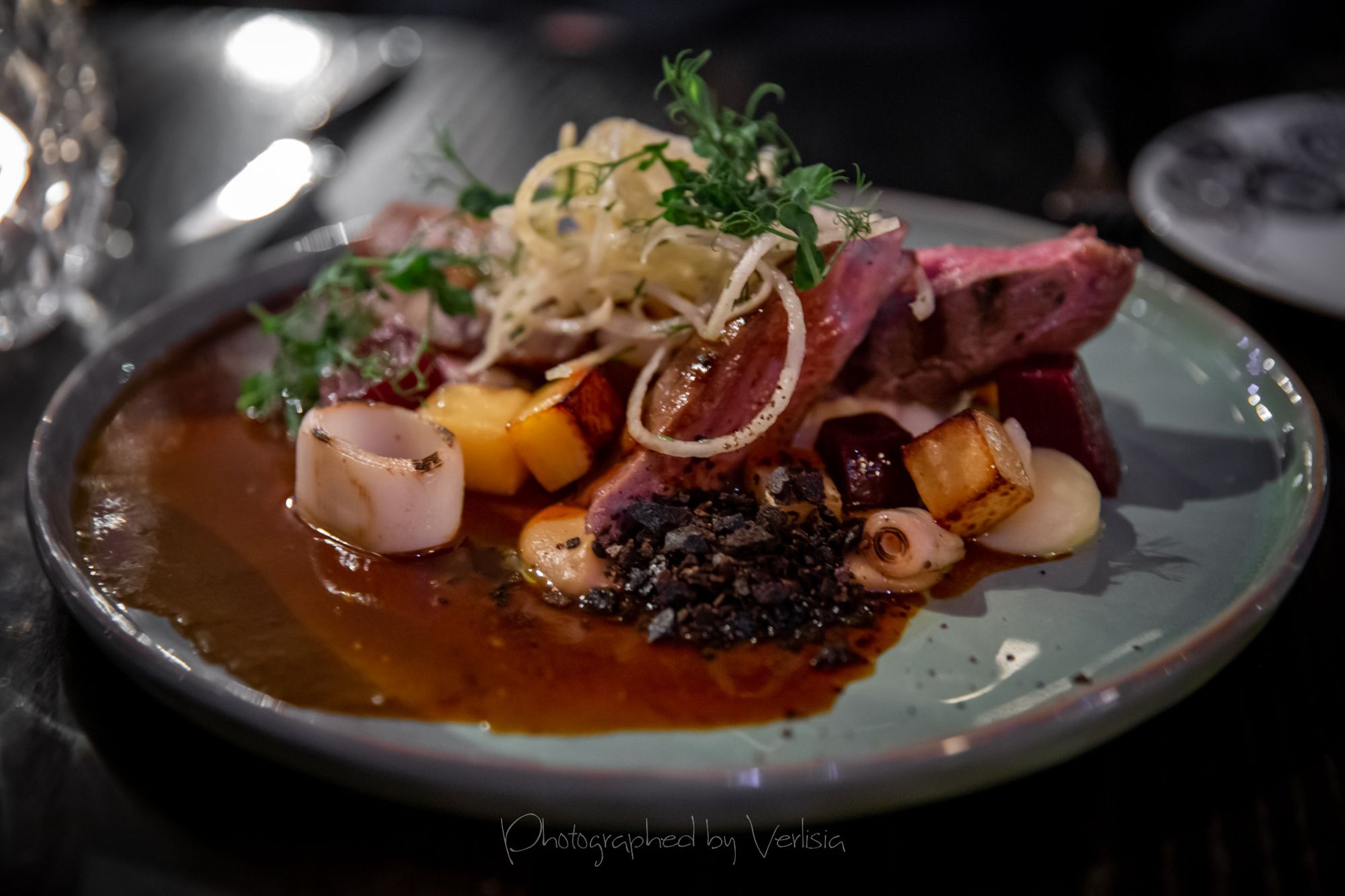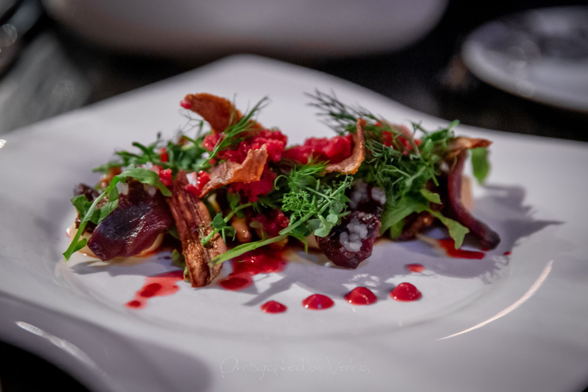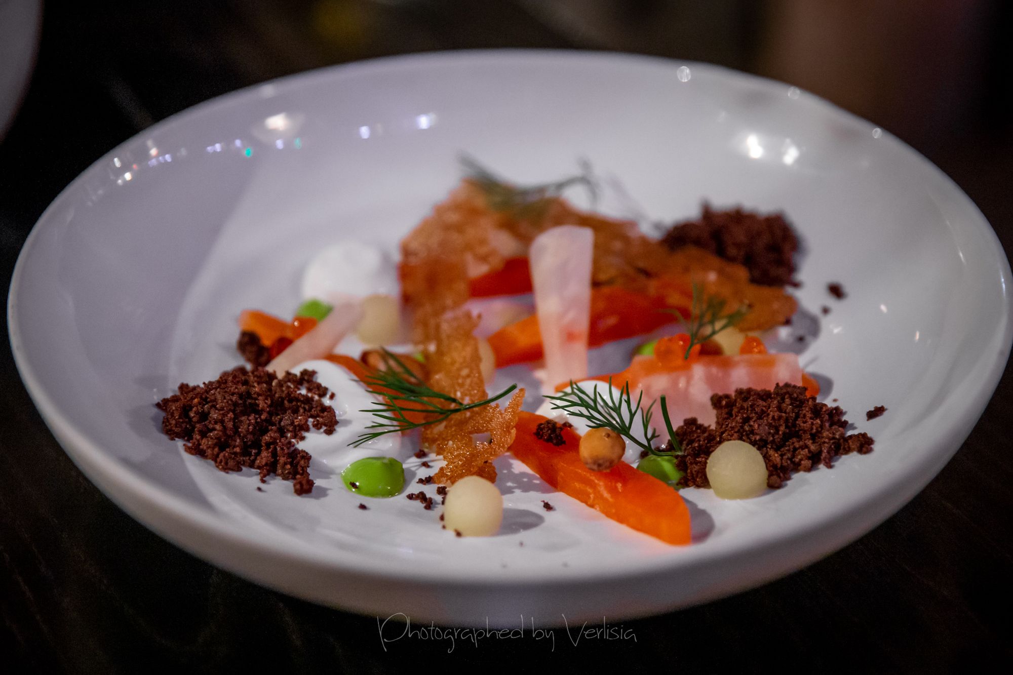 Cuban Mojito, "Our Christmas Soup" (Goose, clove, nut, mushroom)Lightly Cured Artic Char (Butter milk, almond, apple, stout), Cured breast of goose & red currant (Prima donna, parsnip, juniper berry, white chocolate)Grilled Langoustine & Ocean Perch (Sunchoke, pearl onion, chili, dill), Spruce Smoked Leg of lamb & crispy lamb shoulder (Sweet béchamel, leek, beet, swede)