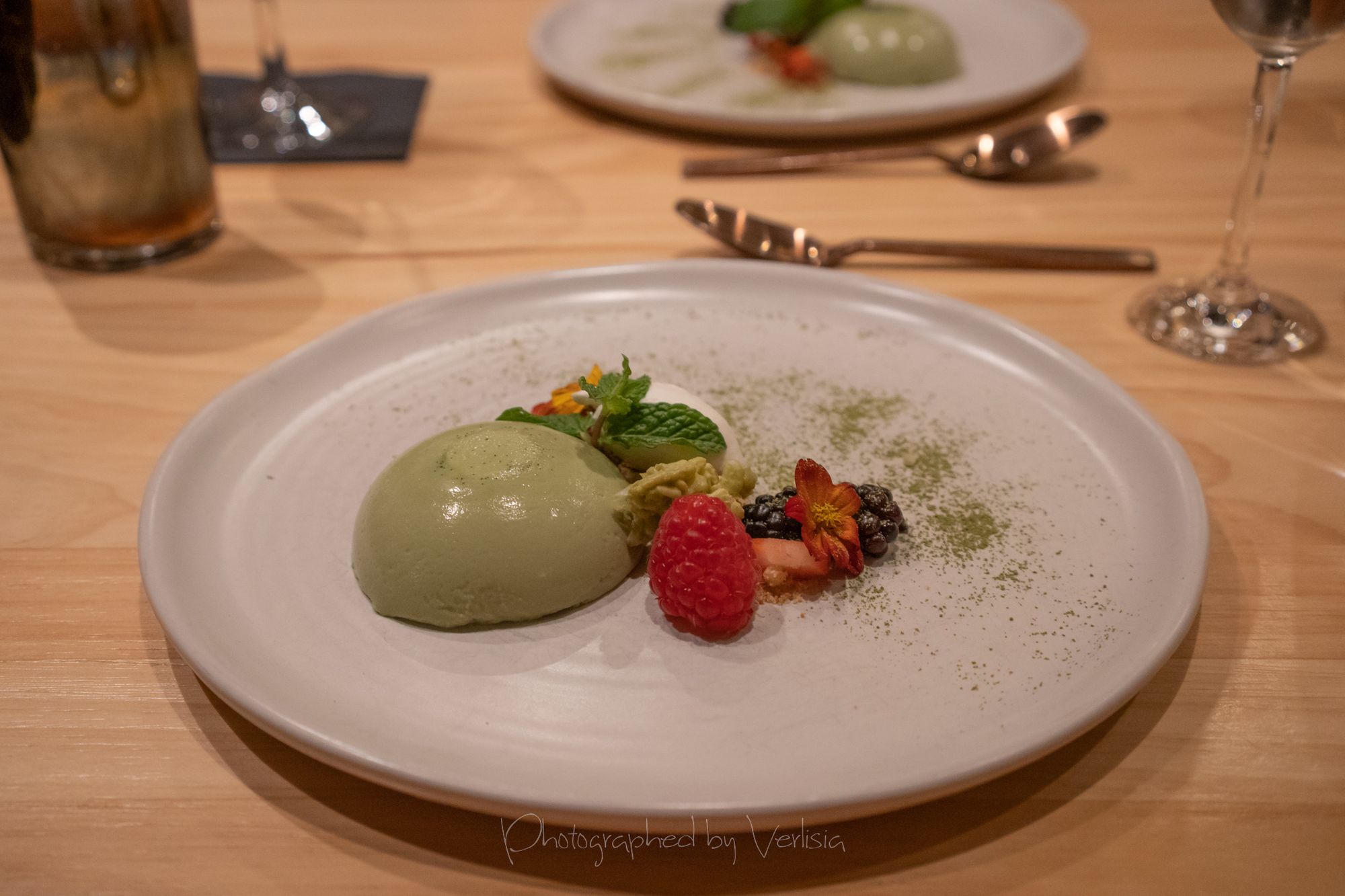 Dessert - Matcha Panna Cotta (Matcha Green Tea, Matcha Glaze, Strawberry). Sake Pairing - Emishiki Monsoon (Kijoshu Junmai Daijinjo)