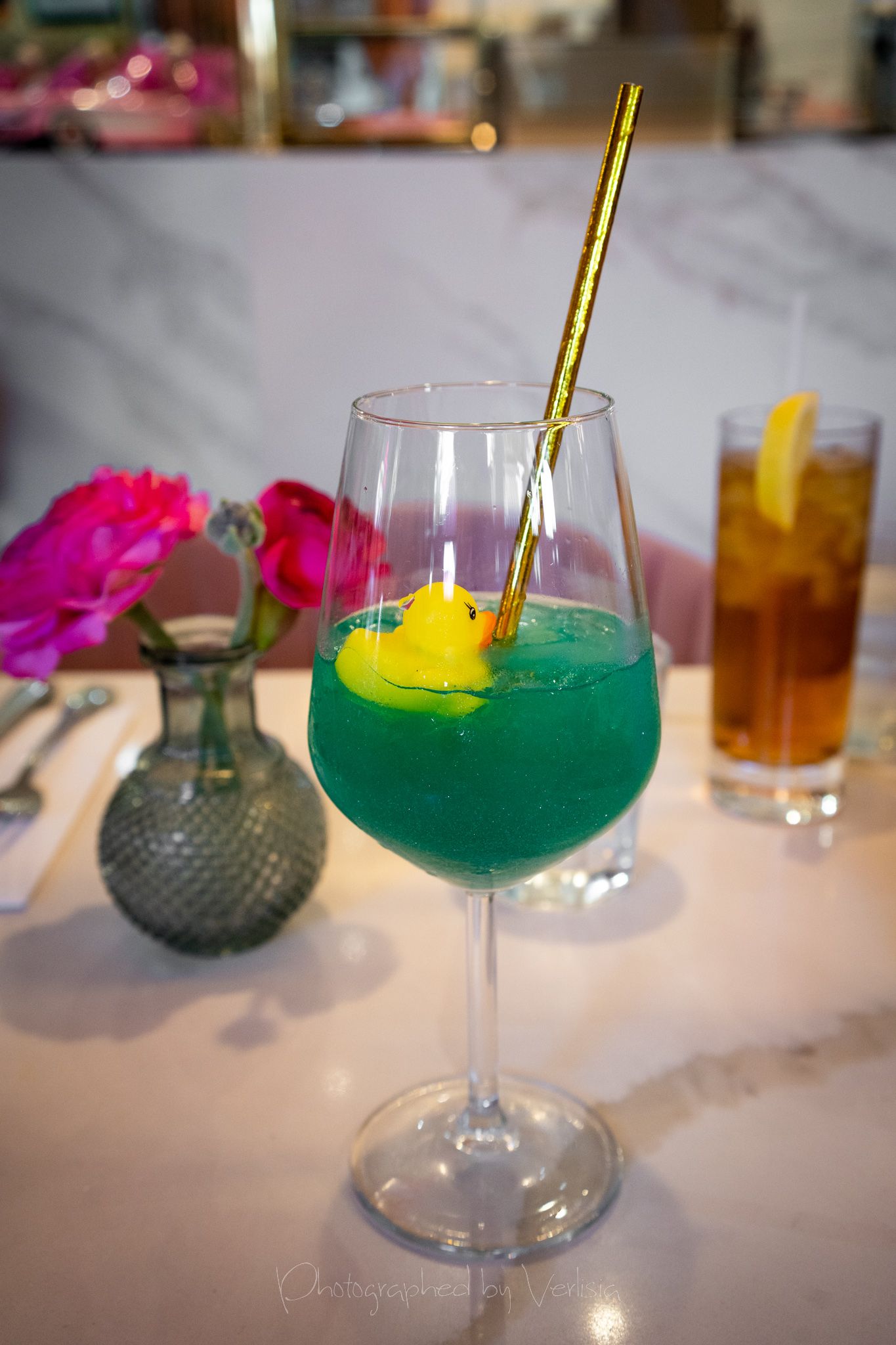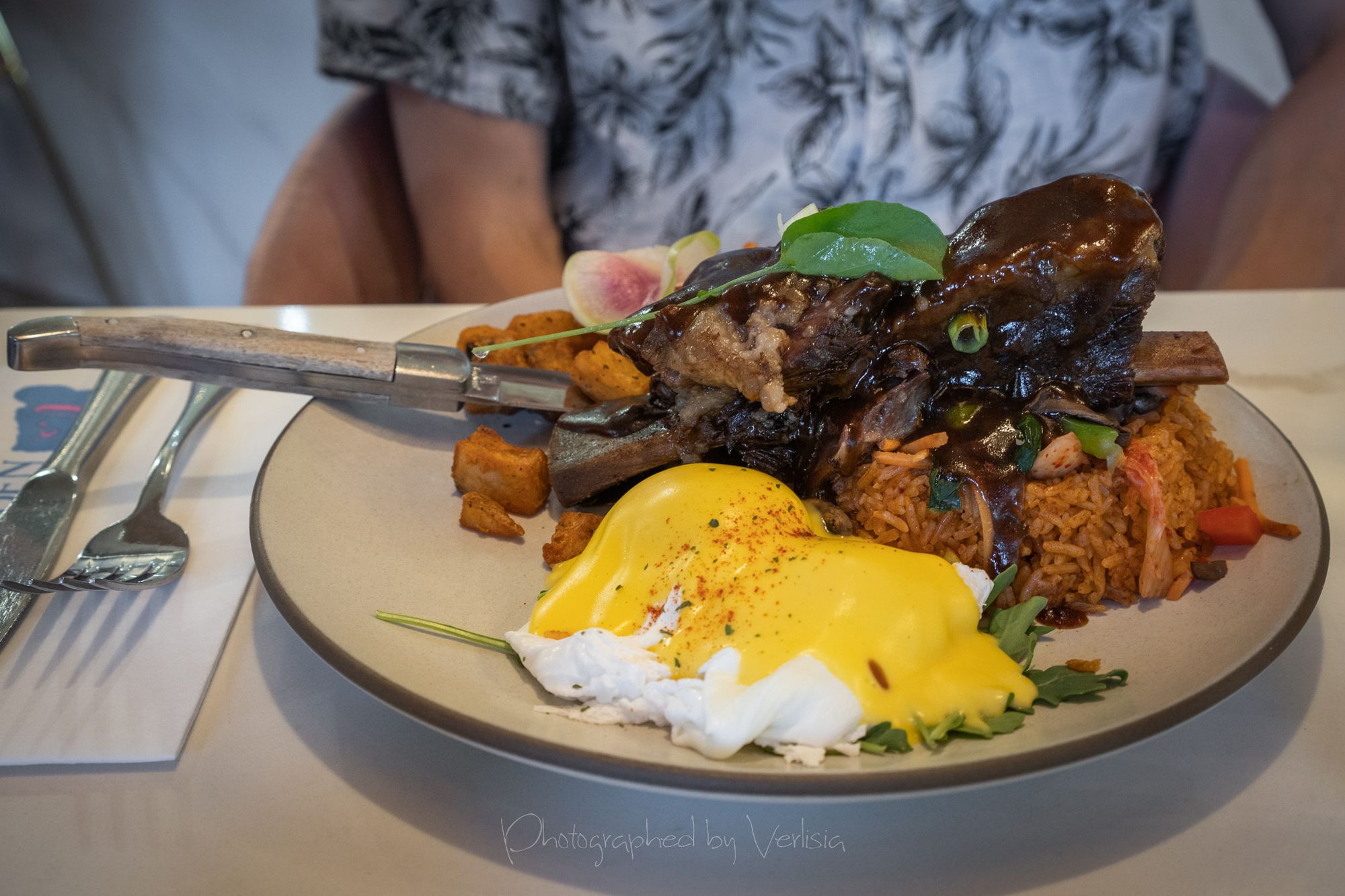 Under the Sea (chili infused blanco tequila, lime, mermaid dust, sparkling wine), Korean Benedict (Bone-in short rib, kimchi Fried rice, chive, mushroom, spinach, carrot, bell pepper, house made hollandaise)