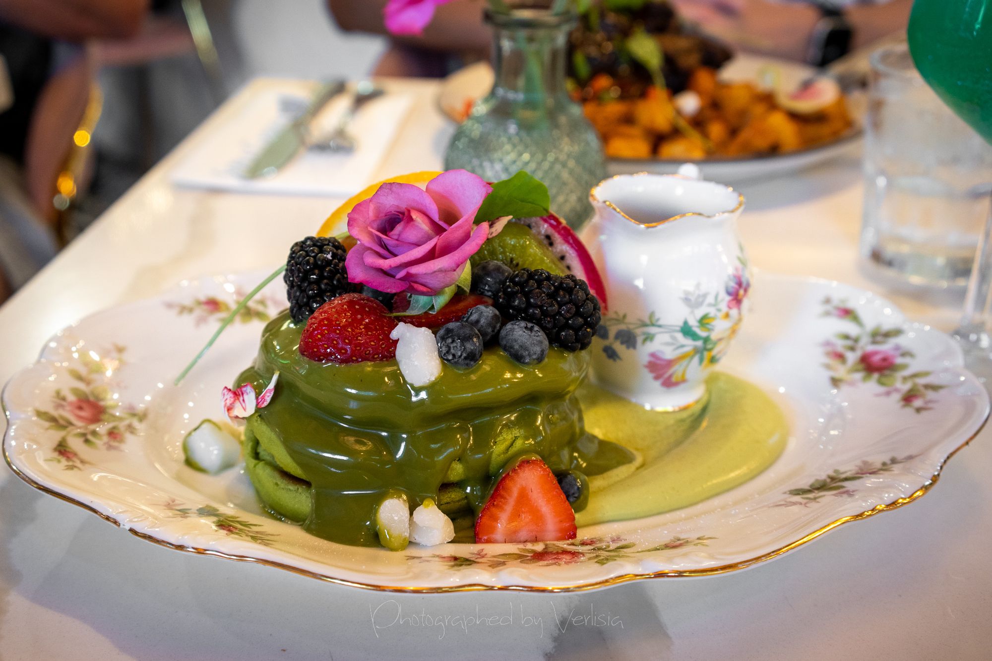 Matcha Mochi Pancakes (Gluten free pancake (rice flour) infused matcha green tea, Mochi, topped with green tea sauce)
