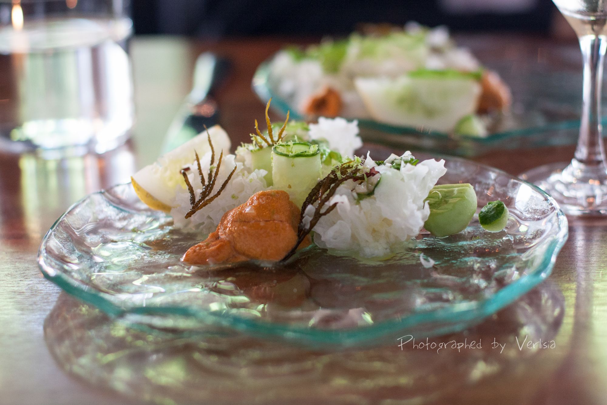 Summer Tasting Menu Course #2 - Fort Bragg sea urchin | Local seaweed | Cucumber, Butter | Sea Salt, Bread Course #1 - Cornbread Toast