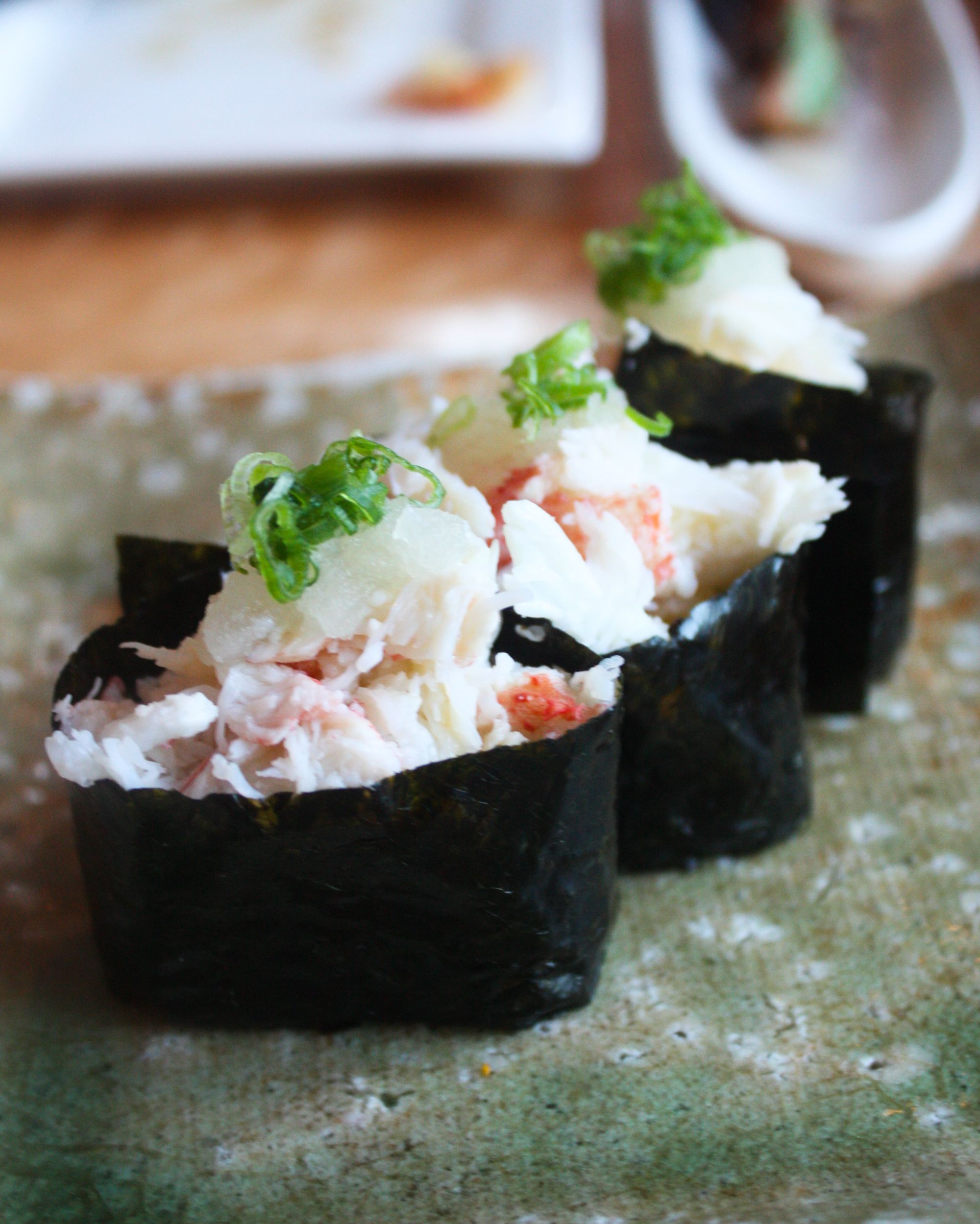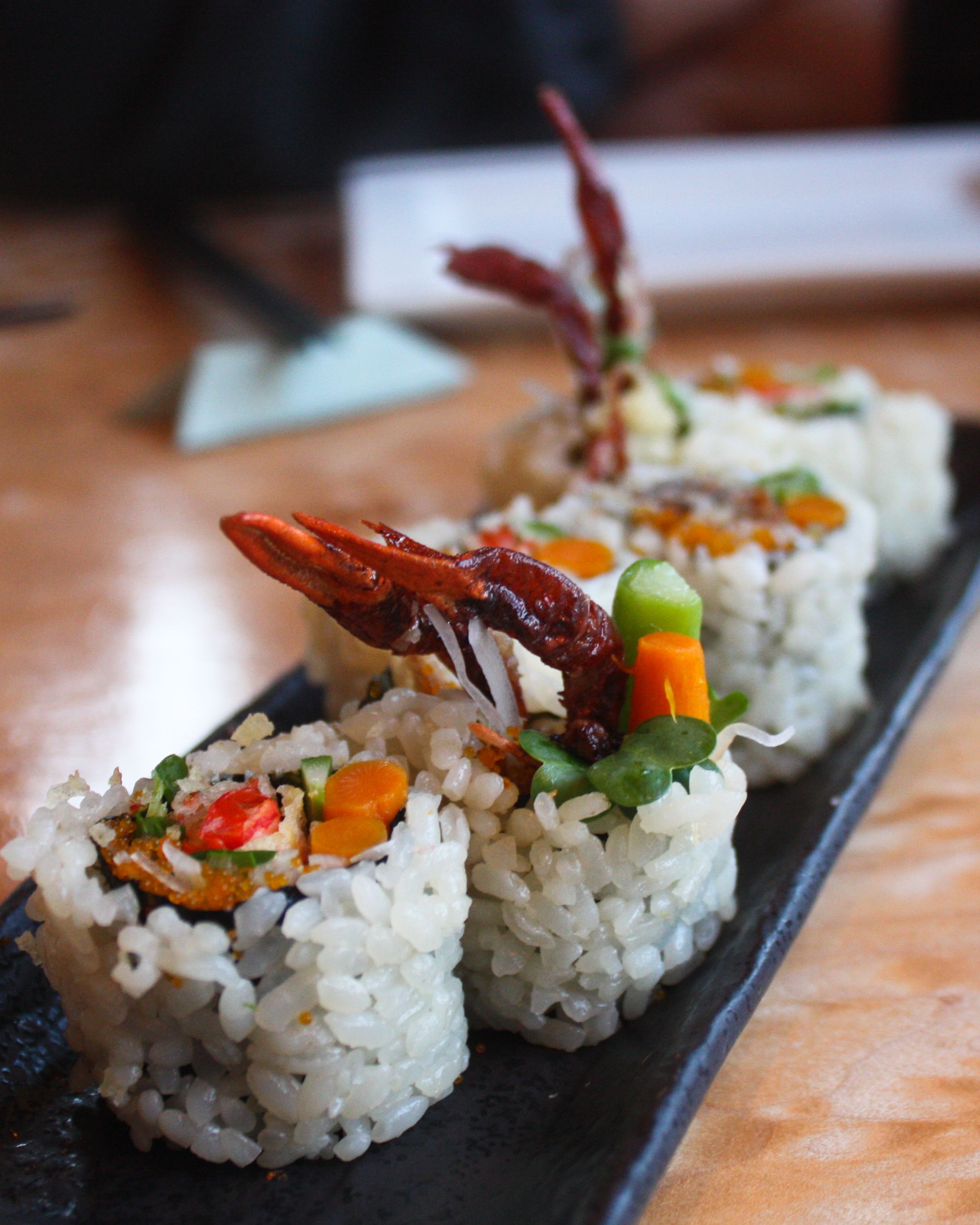 Prawn TemperaWagyu Beef Carpaccio, Smoked Hamachi Tataki (avocado, ruby grapefruit & yuzu-black pepper sauce)NigiriAwabi, Akamutsu, Chu Toro, SanmaKegani Nirigi, Uni Nigiri (Catalina Island)Toro & Takuwan Maki (amakusa blue fin fatty tuna, green onions & scallion w/ shiso & pickled miso daikon), Soft Shell Crawfish Maki (daikon, daikon sprouts, masago, asparagus, gobo & lime)King Trumpet Mushrooms, Slow Cooked Pekin Duck Breast, Dessert Platter (warm toffee cake, chocolate bombe, mascarpone ice cream cocktail, passion fruit sorbet and apple tartlets)