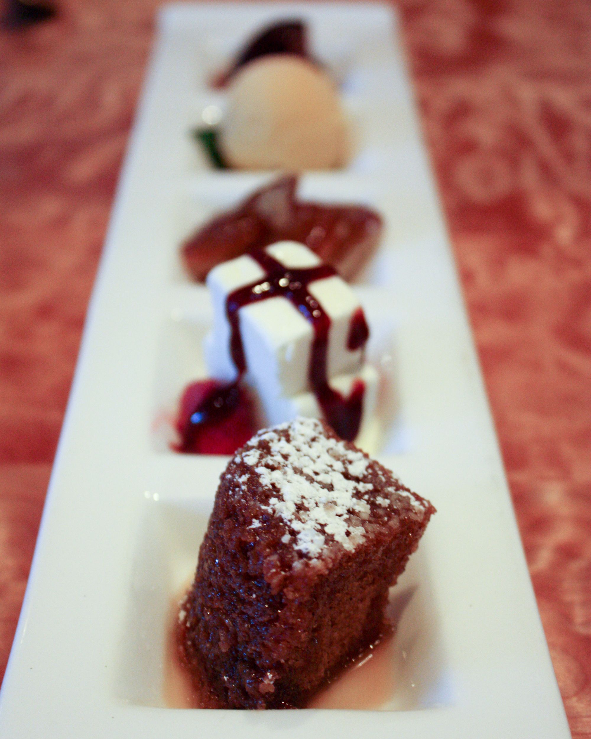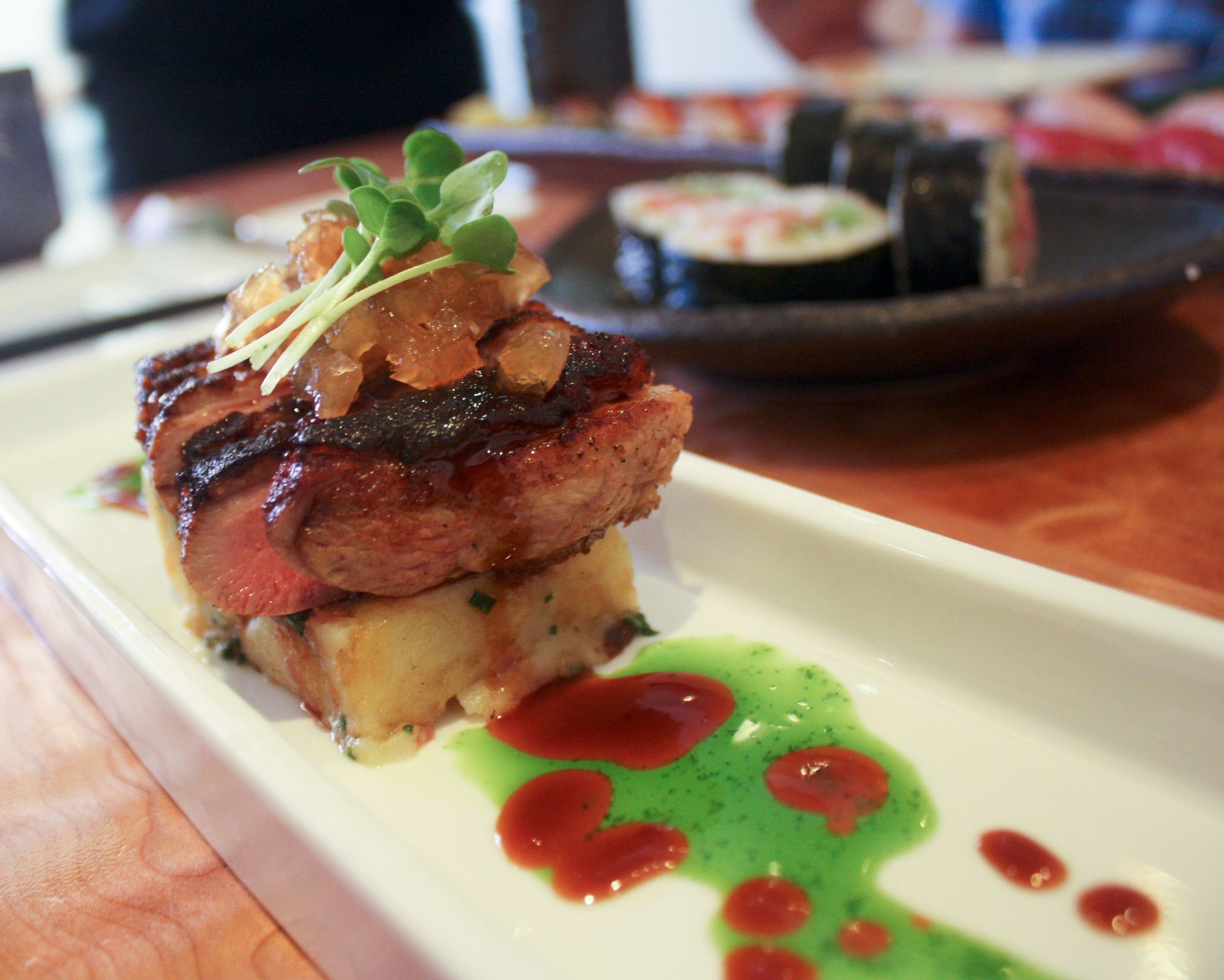 Wagyu Beef Carpaccio, Seared Jumbo Day Boat ScallopsSoft Shell Crawfish Maki, Kaisen Futo-MakiSalmon Skin Maki, Negitoro Maki, Creamy Scallop MakiNigiri - Bincho Maguro (Fresh White Tuna), Hon Maguro (Blue Fin Tuna), Umi Masu (Ocean Trout), Samekawa Karei (Shark Skin Flounder)Slow Cooked Pekin Duck Breast, Soft Shell Crab MakiDessert Sampler - warm toffee cake, chocolate bombe, mascarpone ice cream cocktail, passion fruit sorbet and apple tartlets