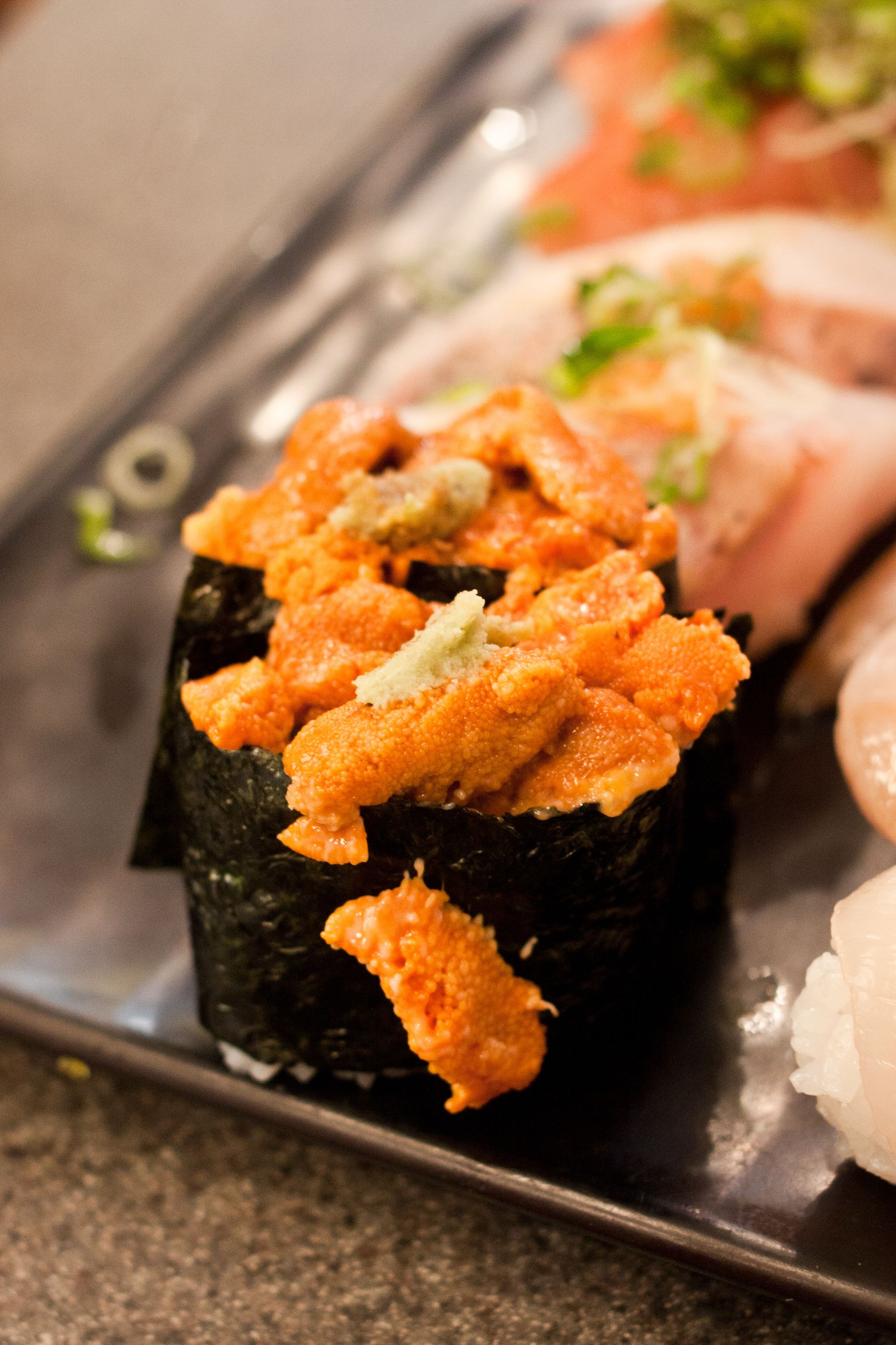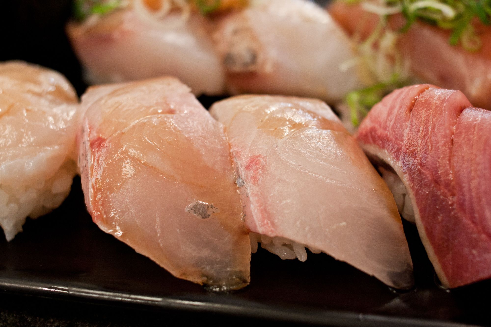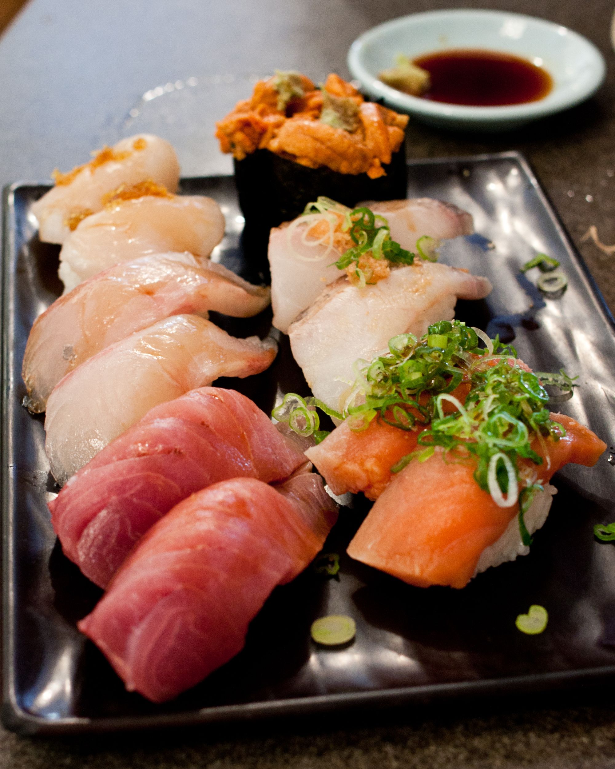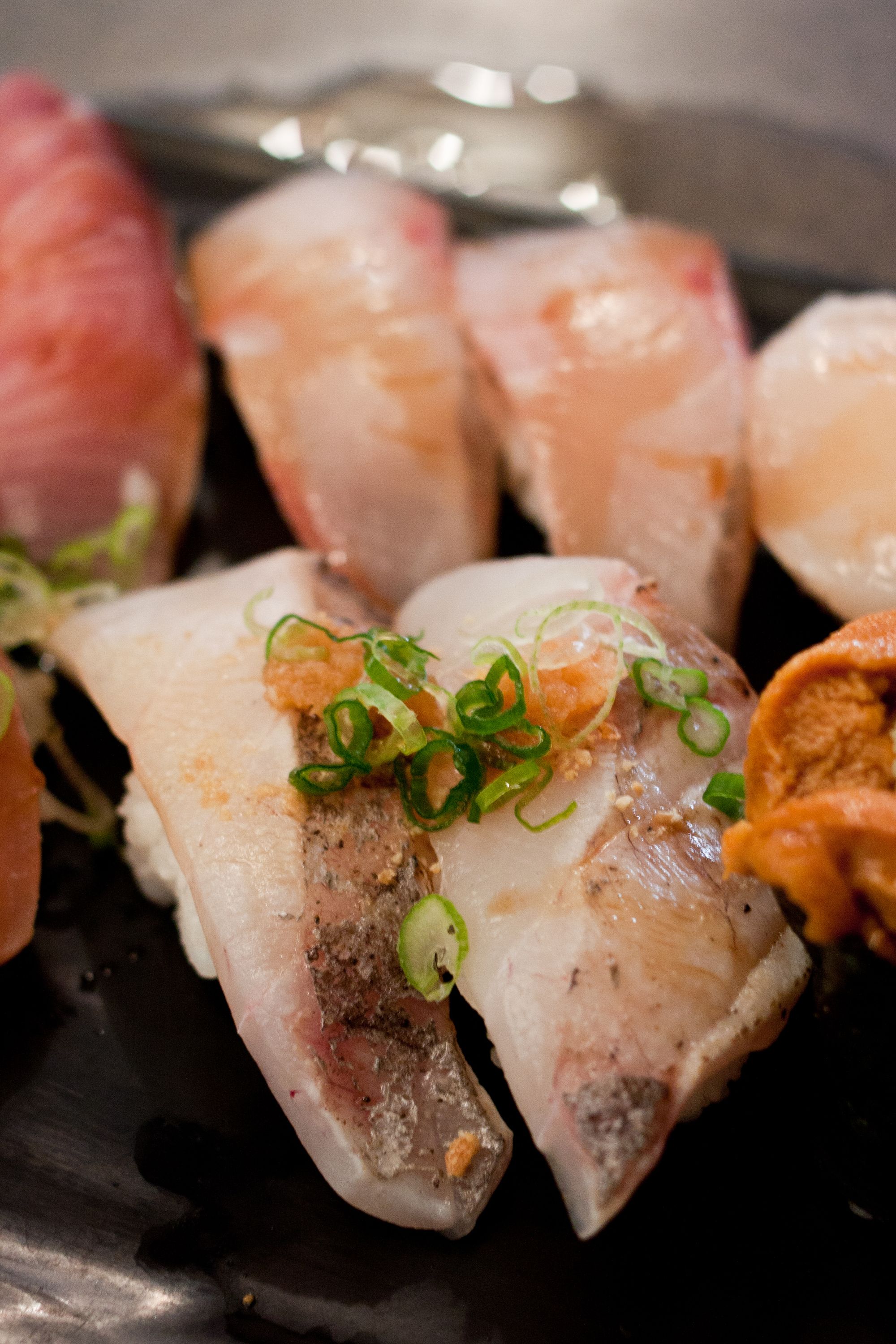 Top roll from Left to Right - Uni, Medai, White Salmon, Bottom roll from Left to Right - Hotate, Kampachi, Buri (Japanese adult yellowtail)Buri (Adult yellowtail) Nigiri, Kampachi (Amberjack) NigiriUni Nigiri, Amaebi NigiriMedai (Japanese Butterfish) NigiriIwashi (Sardine) NigiriWhite Salmon Nigiri