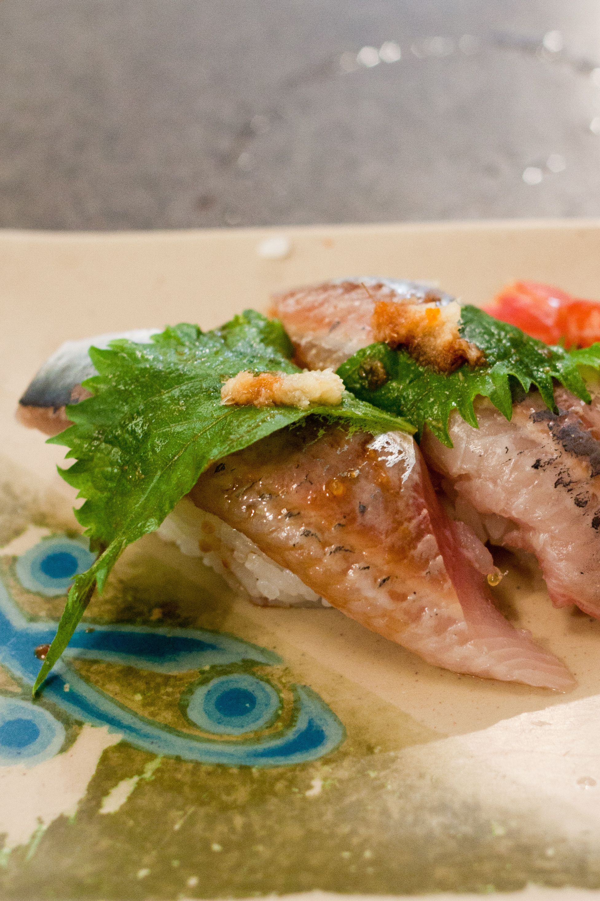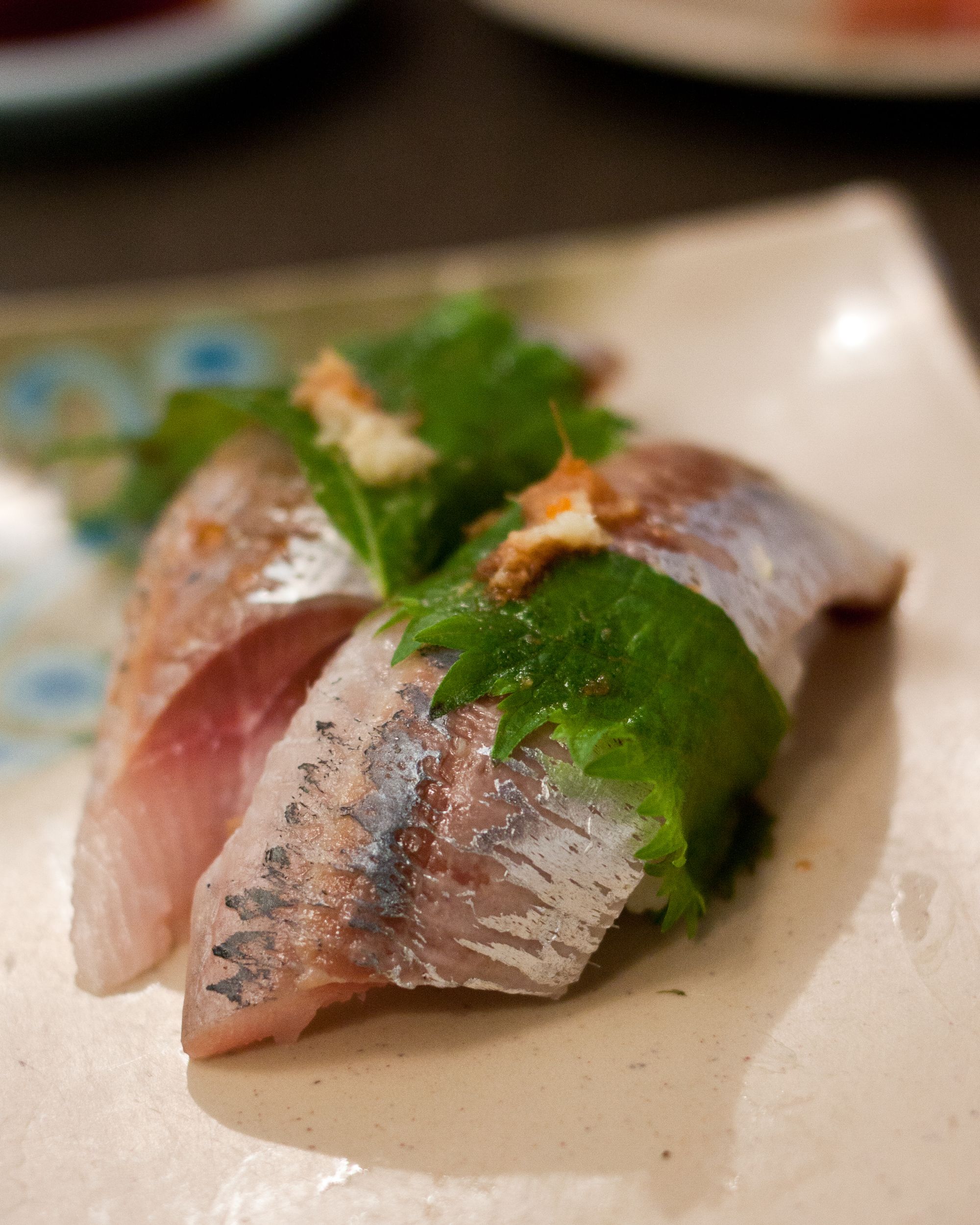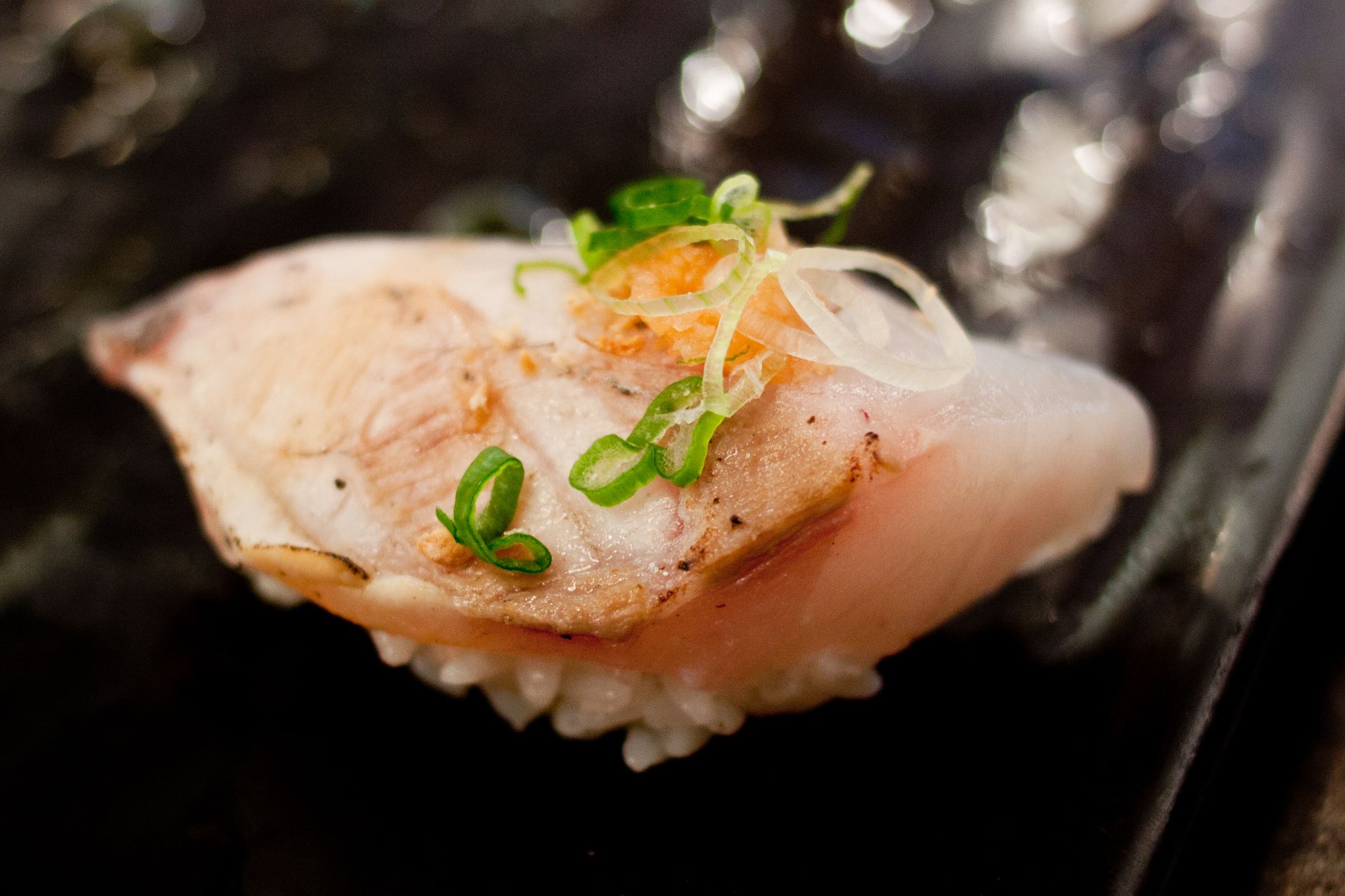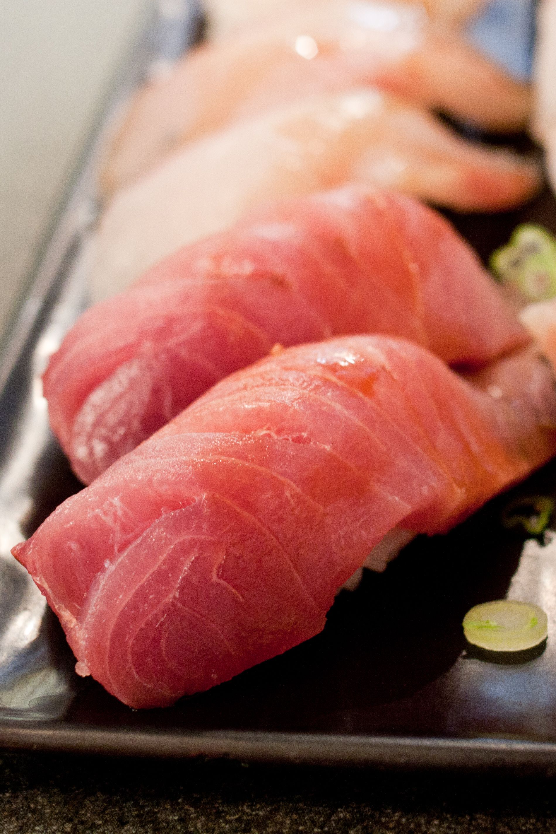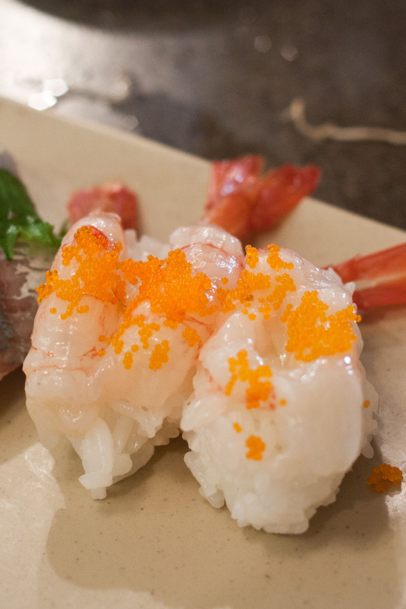 Top roll from Left to Right - Uni, Medai, White Salmon, Bottom roll from Left to Right - Hotate, Kampachi, Buri (Japanese adult yellowtail)Buri (Adult yellowtail) Nigiri, Kampachi (Amberjack) NigiriUni Nigiri, Amaebi NigiriMedai (Japanese Butterfish) NigiriIwashi (Sardine) NigiriWhite Salmon Nigiri
