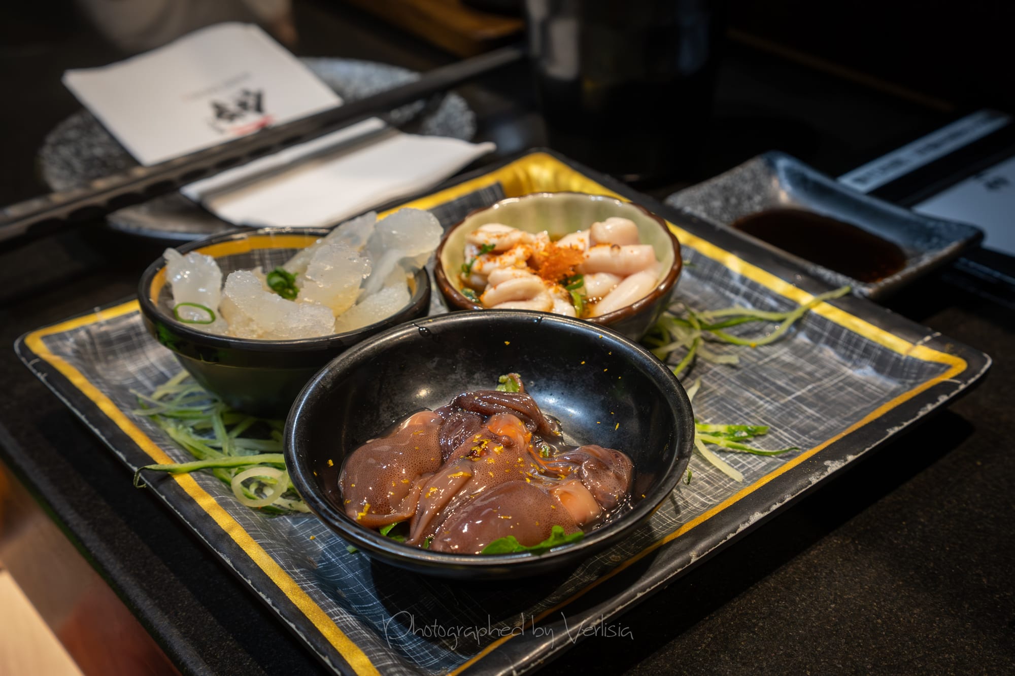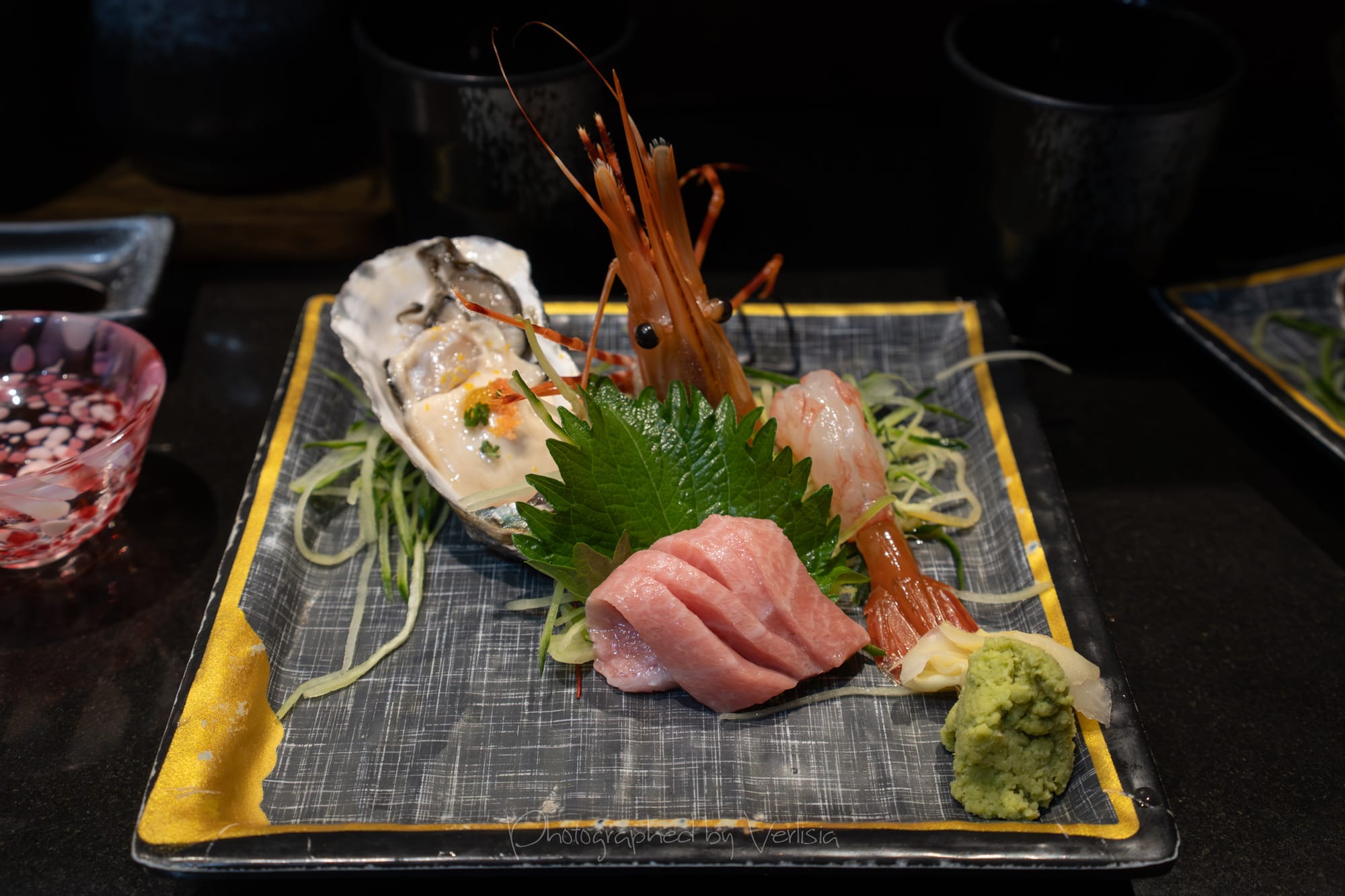 Sashimi - Chu-Toro, Amaebi, Little Neck Oyster; Sake Dassai 39