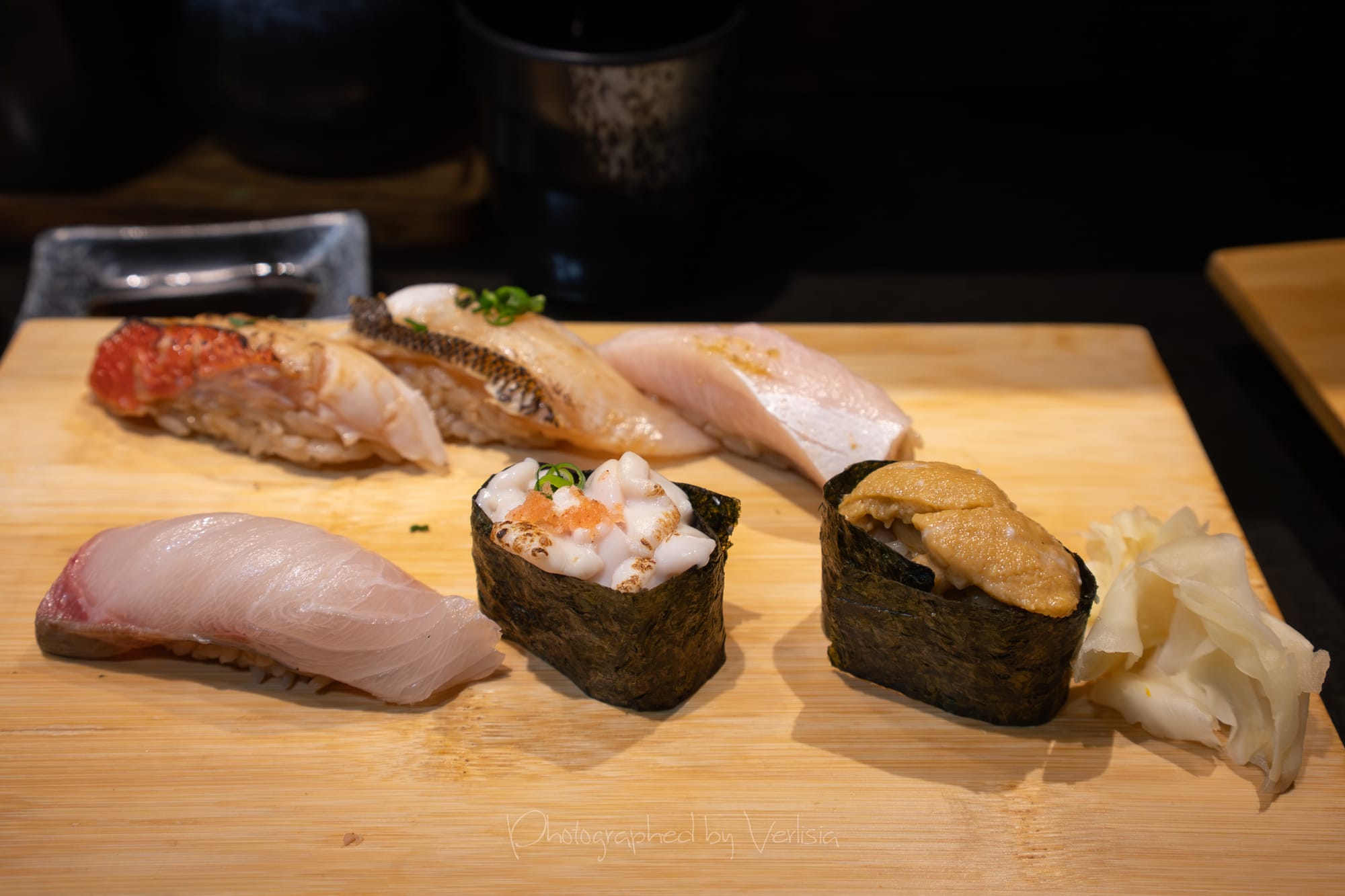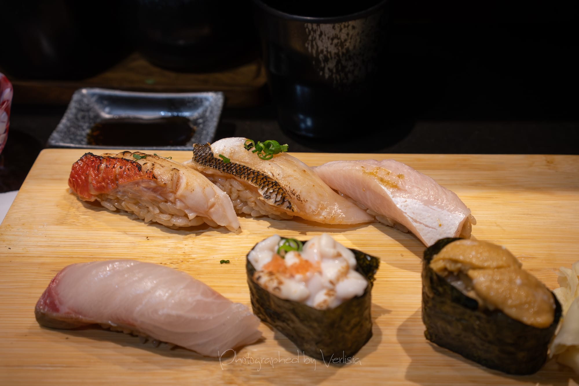 Nigiri - Kimmedai, Seared Shima Aji, Hamachi Belly, Shima Aji, Shirako, Uni