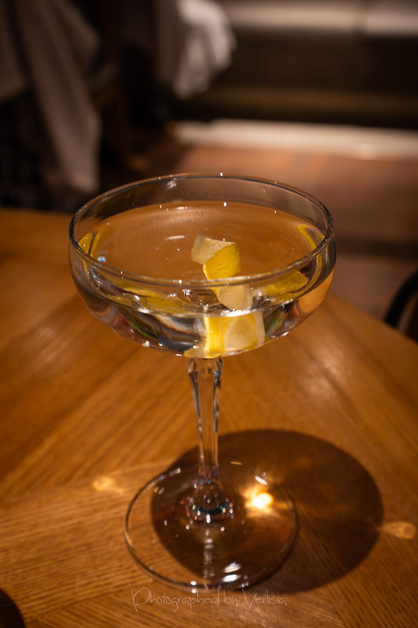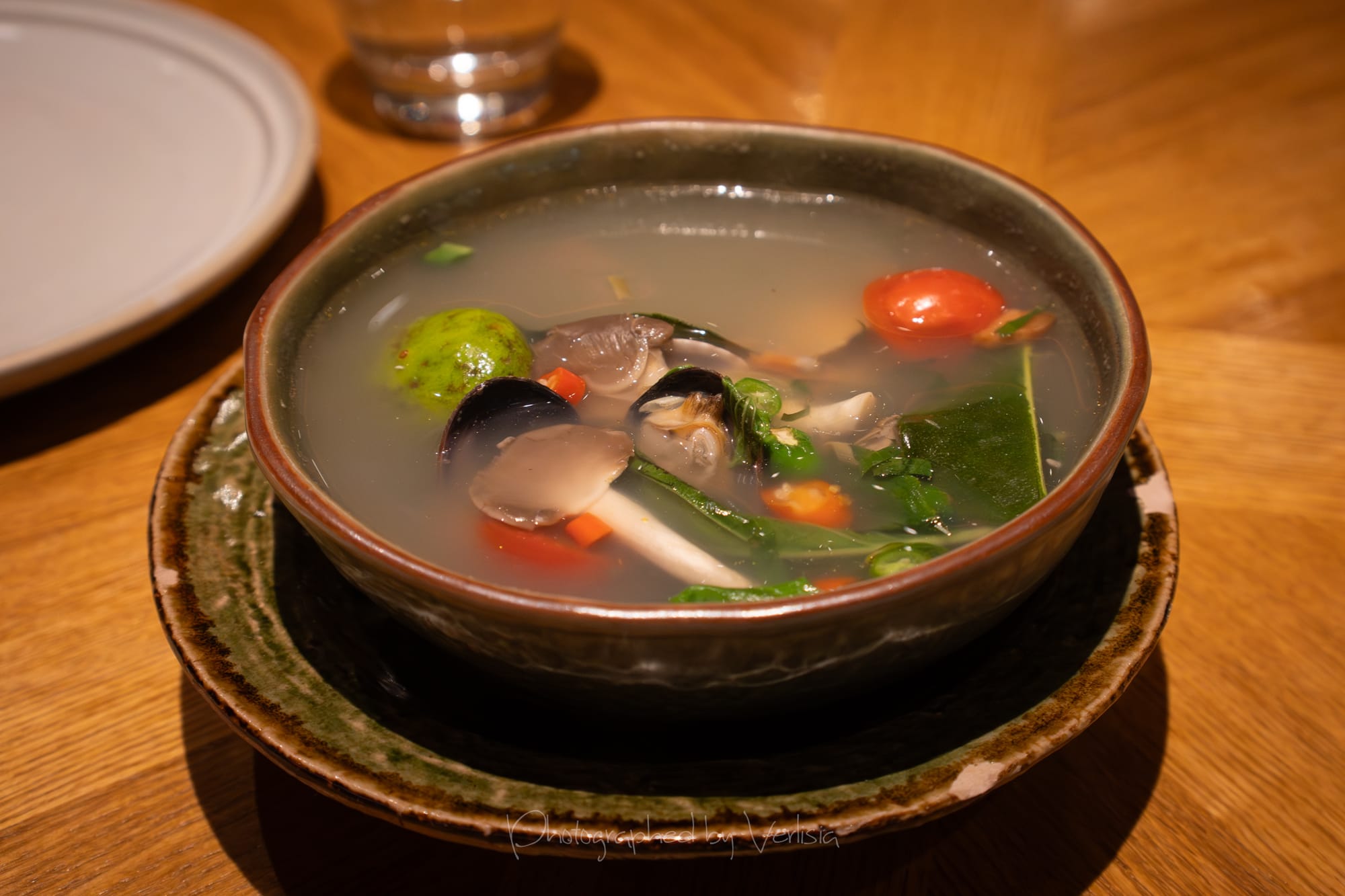 Cocktail - Martini; Hot and Sour Clam Soup (lemongrass, galangal, chili, lemon leaf, mushroom, cherry tomato, coriander, clam broth)