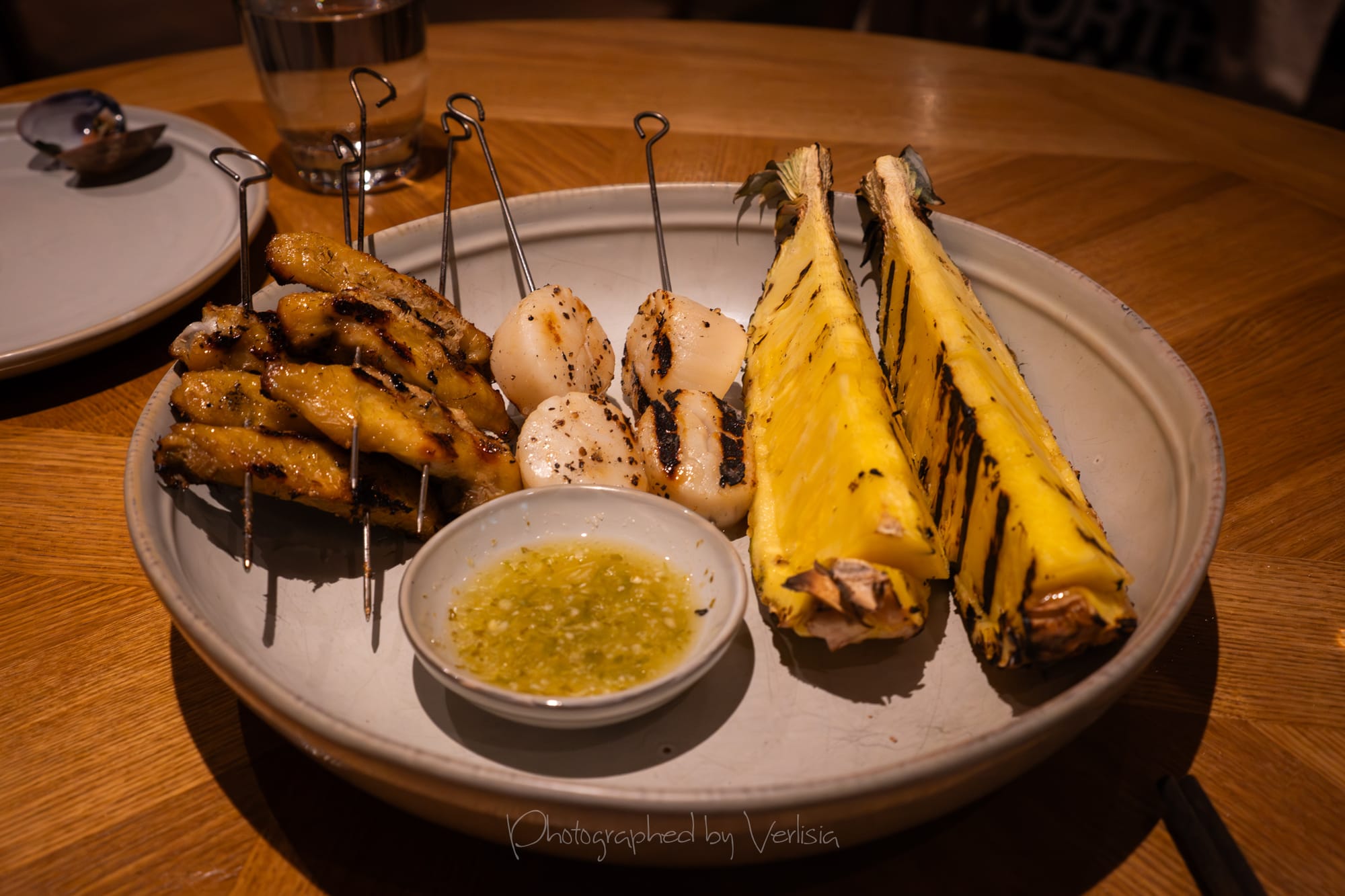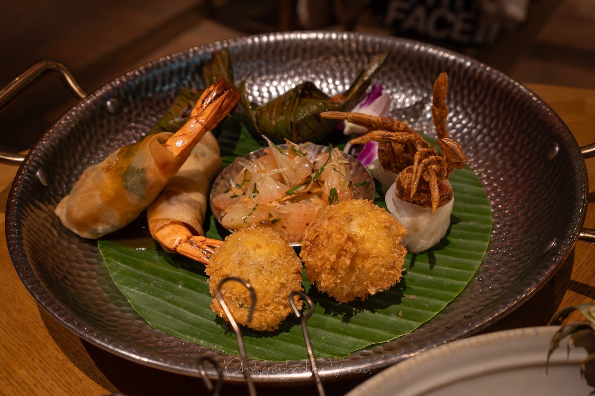 Sampling Platter (cod fish potato ball, pandan leaf chicken, crispy soft shell crab, rice paper roll, Tongdee pomelo salad); Skewers - Chicken Wing, Scallop, Pineapple