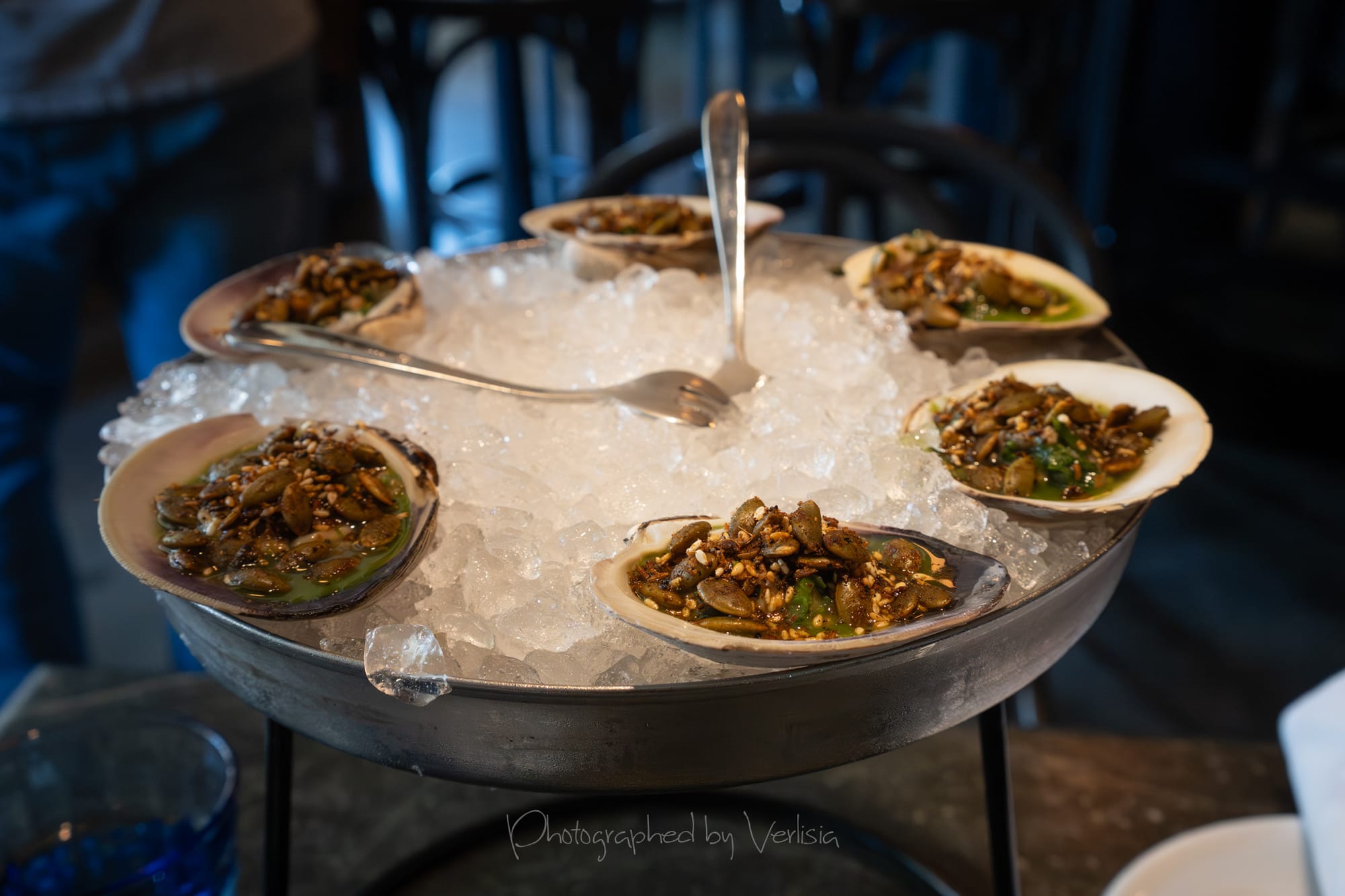 Chardonnay (Scar of the Sea, Vinos de los Ranchos, Santa Maria Valley, California 2023); Half Dozen Cherrystone Clam Salsa
