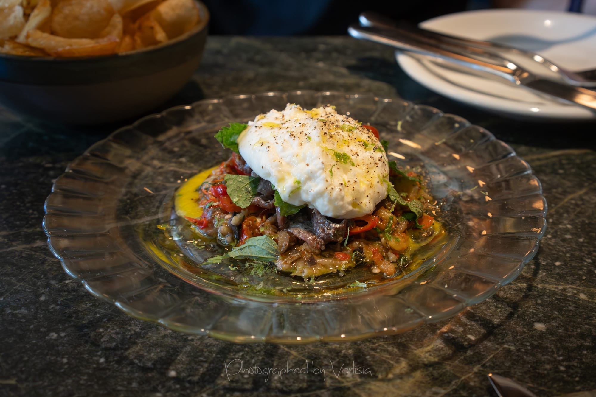 Cantabrian Anchovies, burrata, marinated eggplant & peppers, focaccia and chips