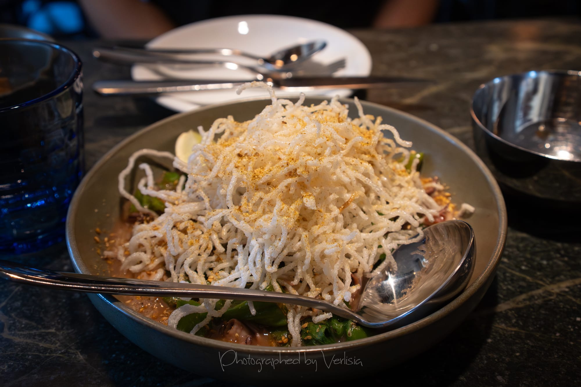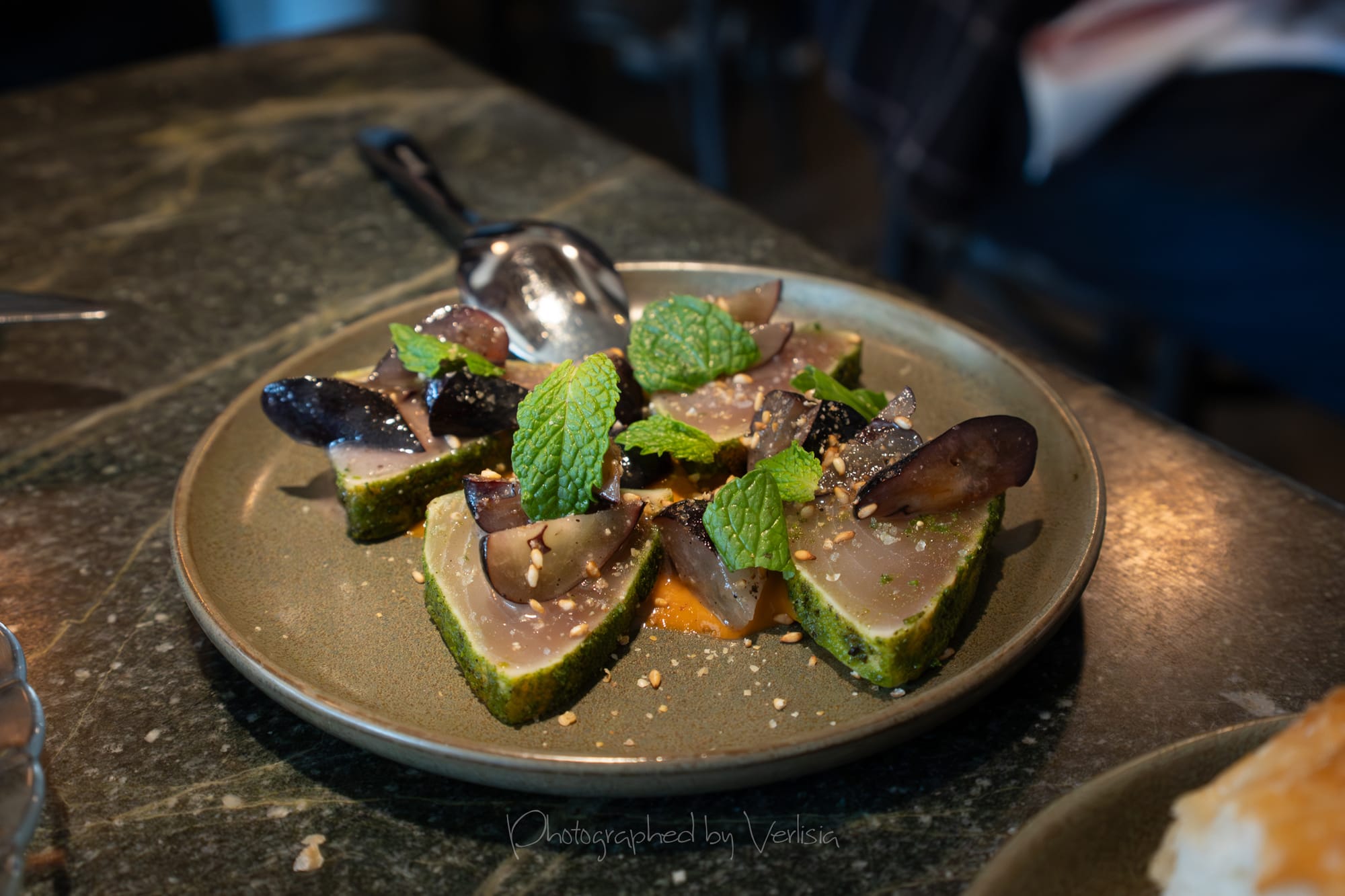 Smoked albacore, tomato chutney, grapes, ras el hanout; Squid & shishito 'stir fry', oyster sauce, thai basil