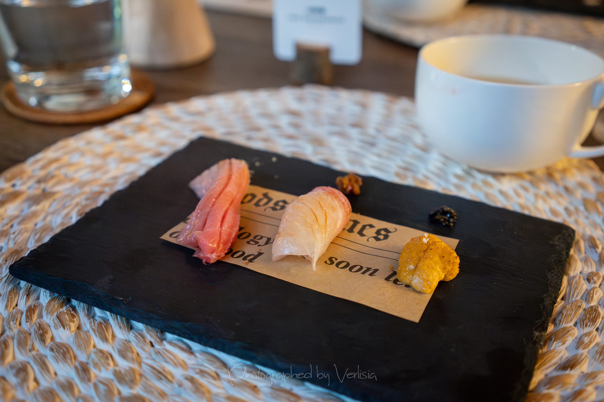 Nigiri - Firefly Squid with Hokkaido Uni and miso sauce, Nigiri - Hotate with wine sauce and kombu salt, Nigiri - Tachiuo (Belt Fish)