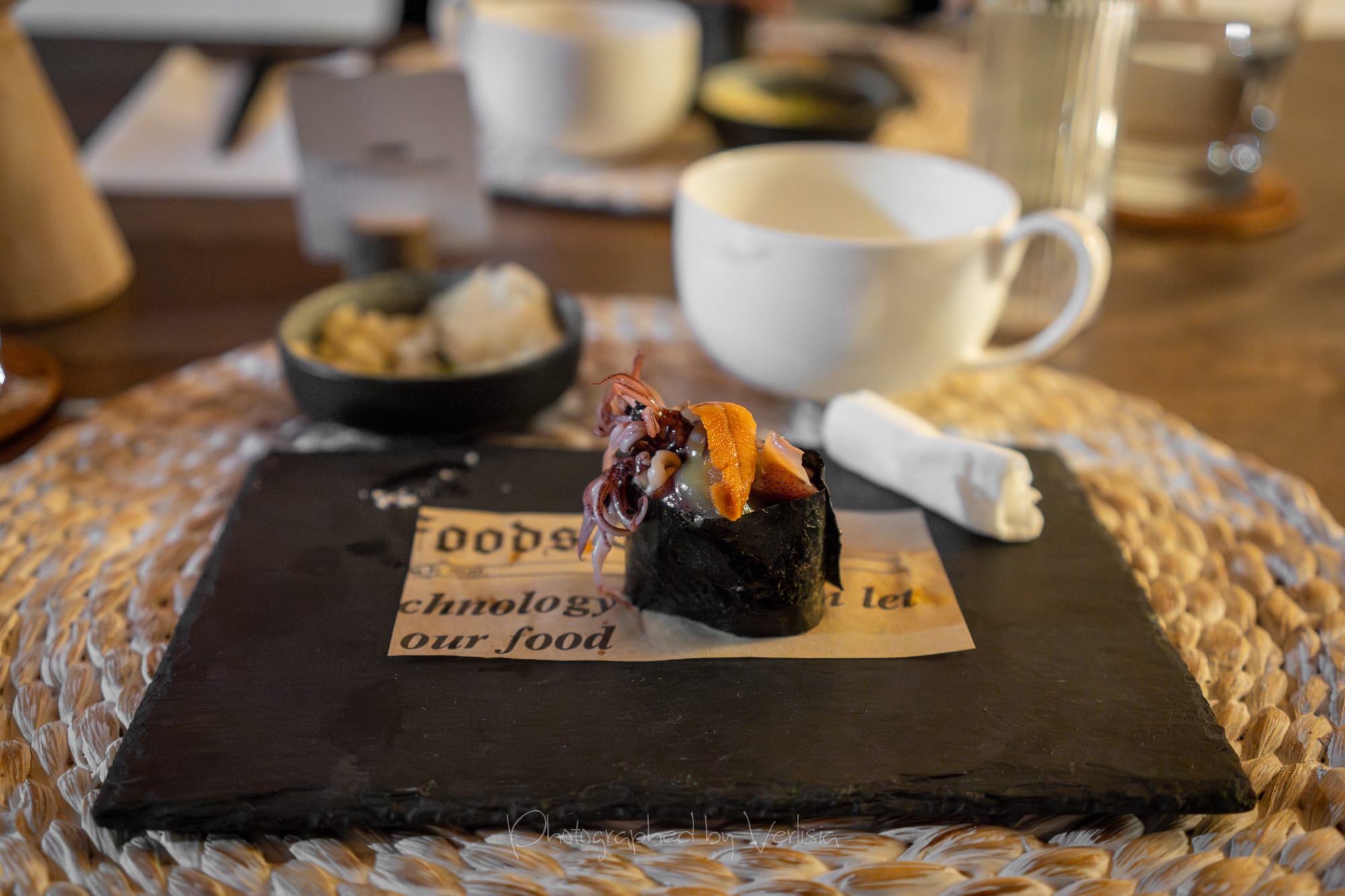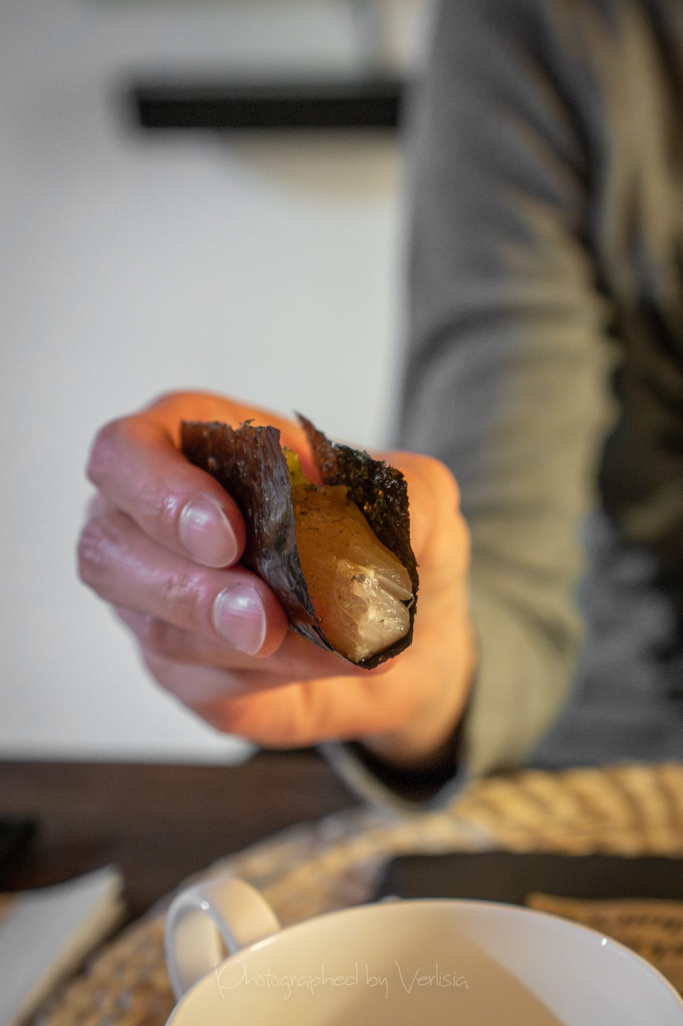 Nigiri - Kona Kanpachi with Avocado, served handroll style with seaweed, Maki - Iwashi (Sardine)