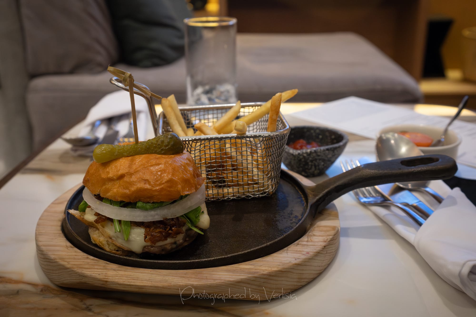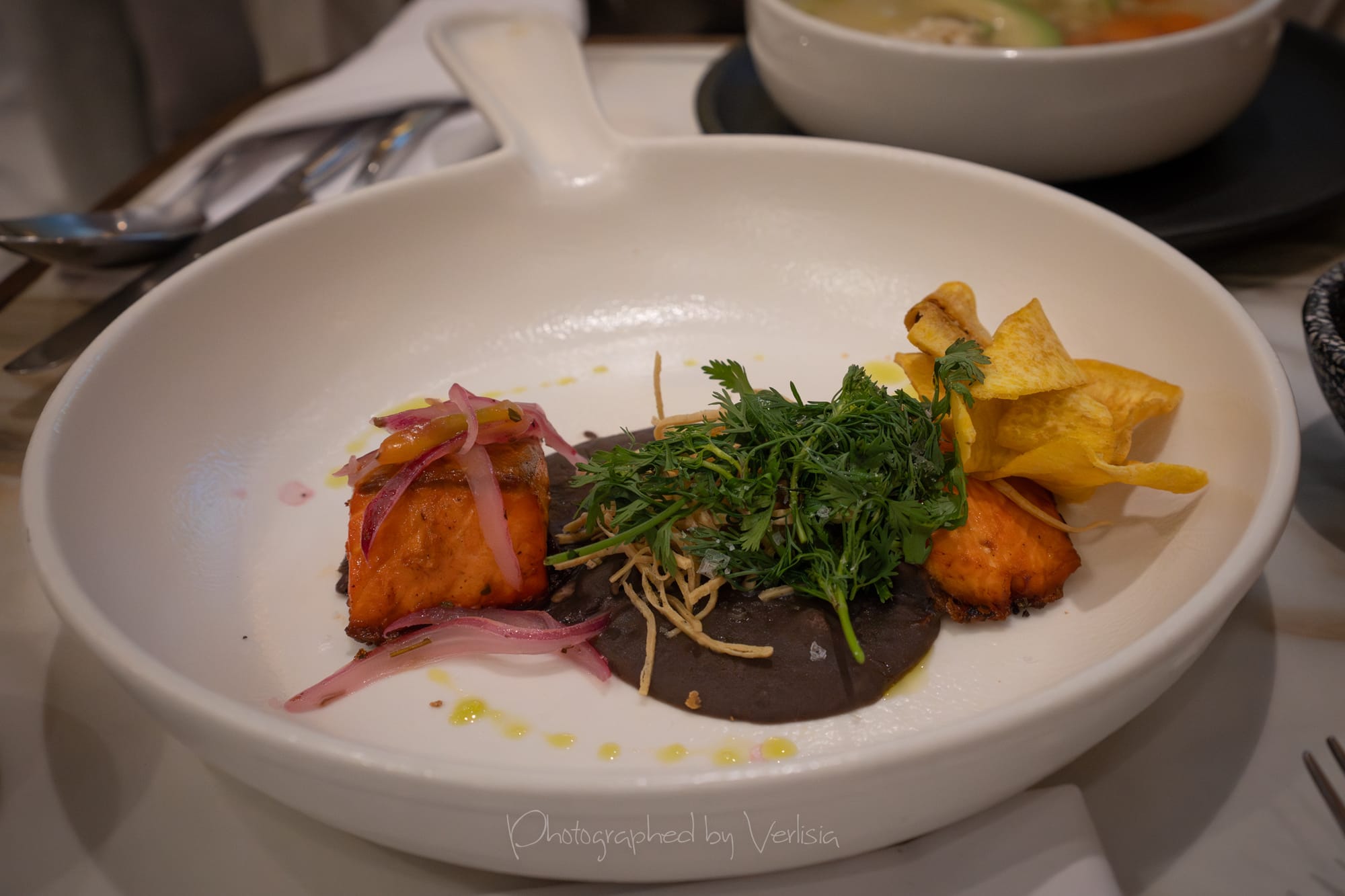 Beef Burger (Homemade Brioche, Truffle Mayonnaise, Caramelized Onion, Tomato and Arugula); Salmon, Yucatán style dress (Xnipec Sauce, Purple Onion with Vinegar, Beans Puree)