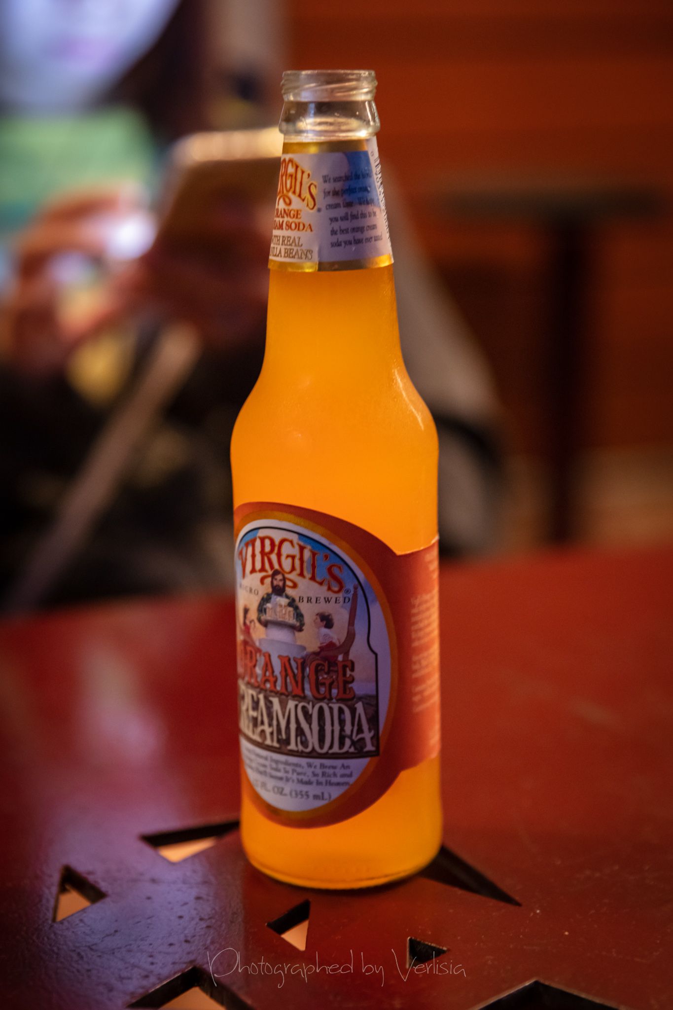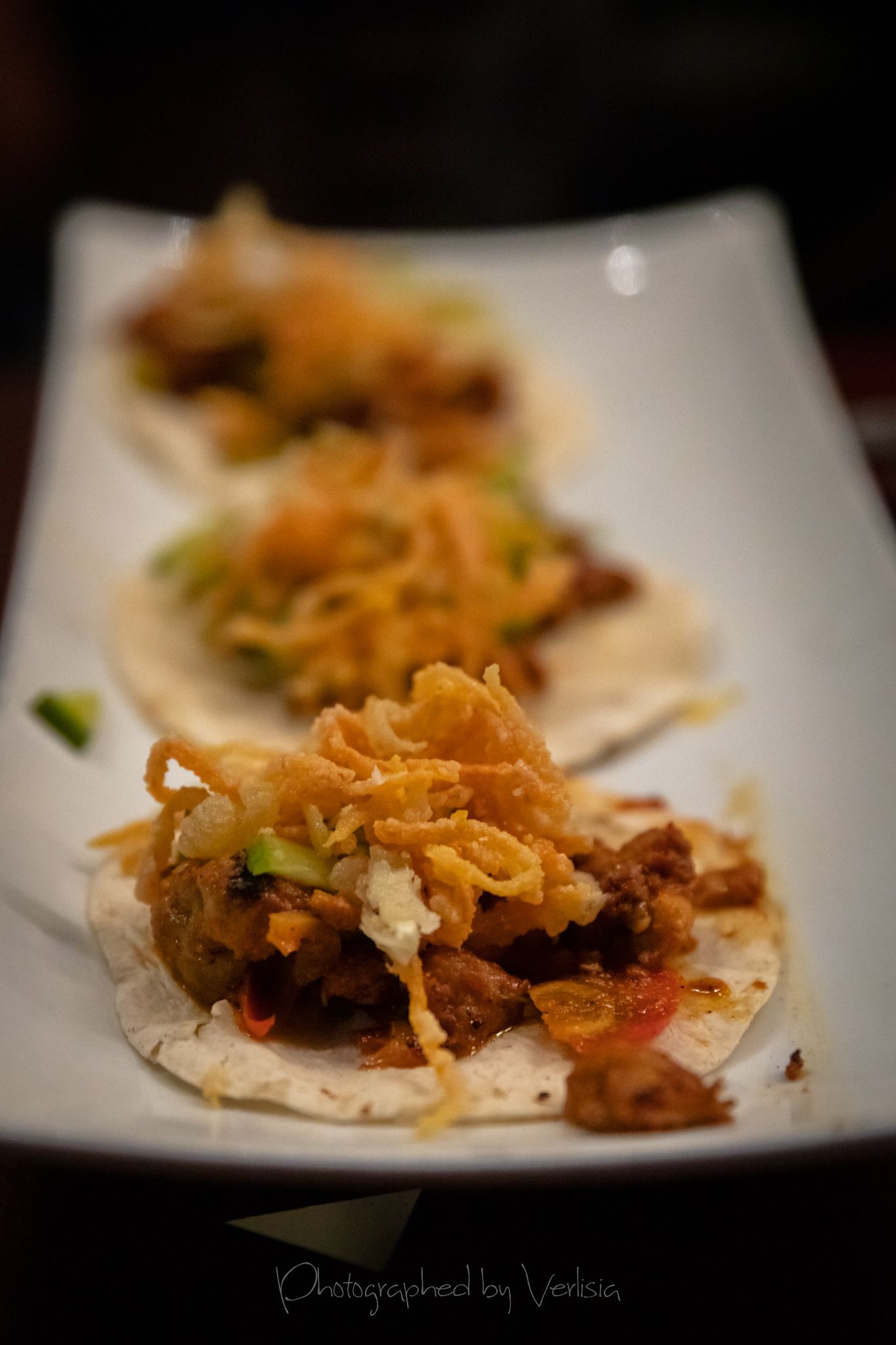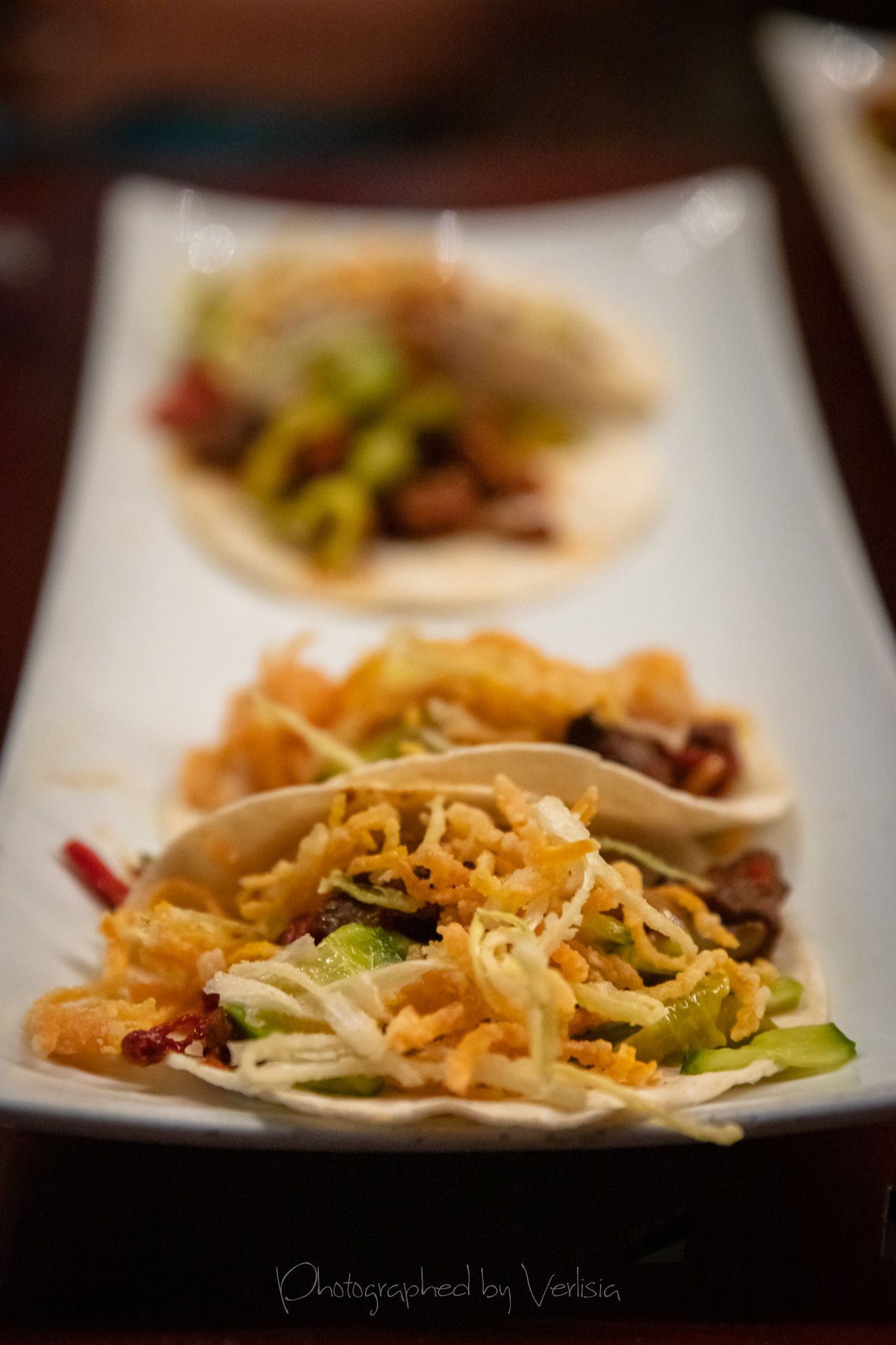 Soda, Satay Tacos (Thai-marinated chicken thighs, harissa, japanese pickles, cucumbers, pickled peppers, crispy leeks and carrots)