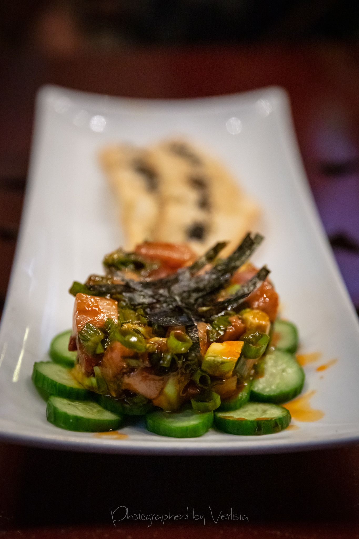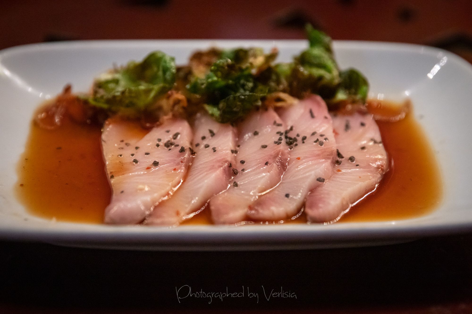 Poke (yellowtail, sweet soy sauce & chili oil, scallions, avacado, nori & black sesame crostini), Hamachi Crudo (chilled soy dashi broth, crispy brussel sprouts, hawaiian lava salt, crispy shallots)
