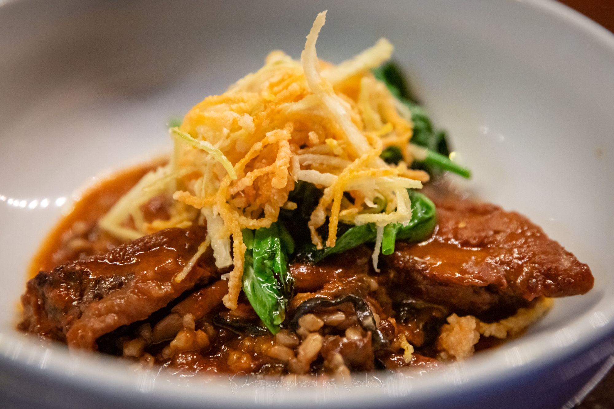 Briased Short Rib (Niman ranch short ribs simmered in soy miso broth), Verum '11 Pinot Noir (Patagonia, Argentina)